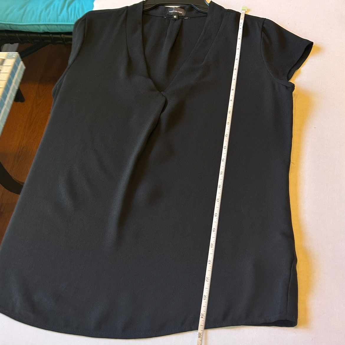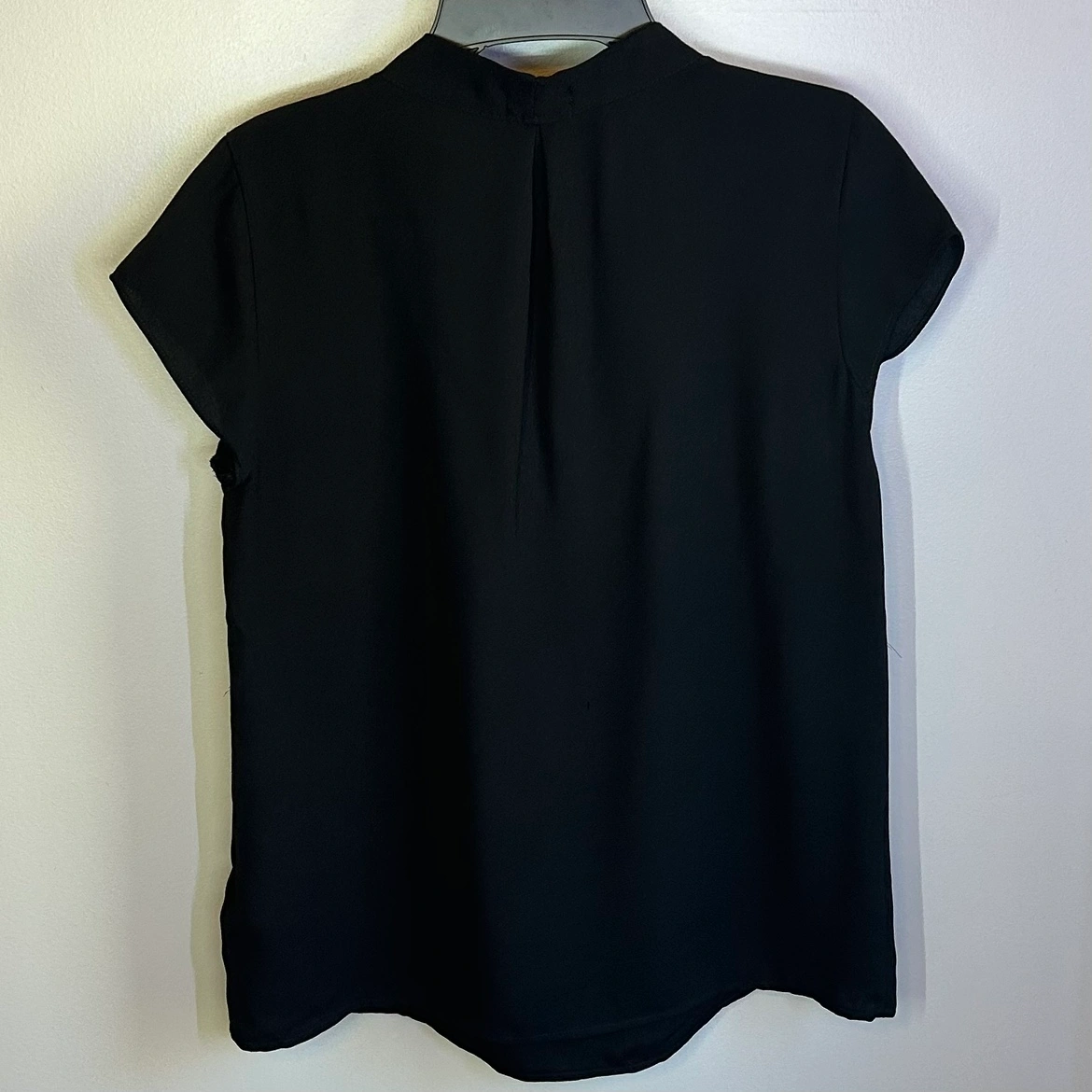 New without tags! This elegant black blouse features a flattering V-neckline and short sleeves. Its sleek design offers a versatile and sophisticated look, perfect for both office wear and casual outings. The relaxed fit ensures comfort while providing a polished silhouette that can be easily dressed up or down. Small flaw in back of blouse (pictured) otherwise in new condition. New, never worn. Women’s size M. See photos for measurements. Cross posted.