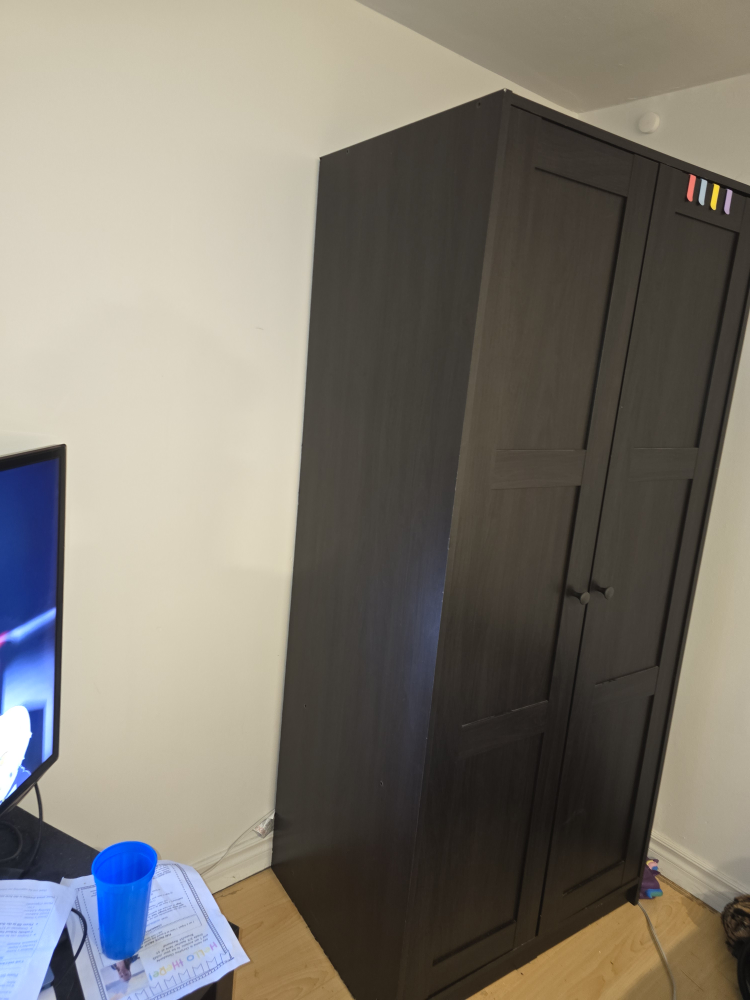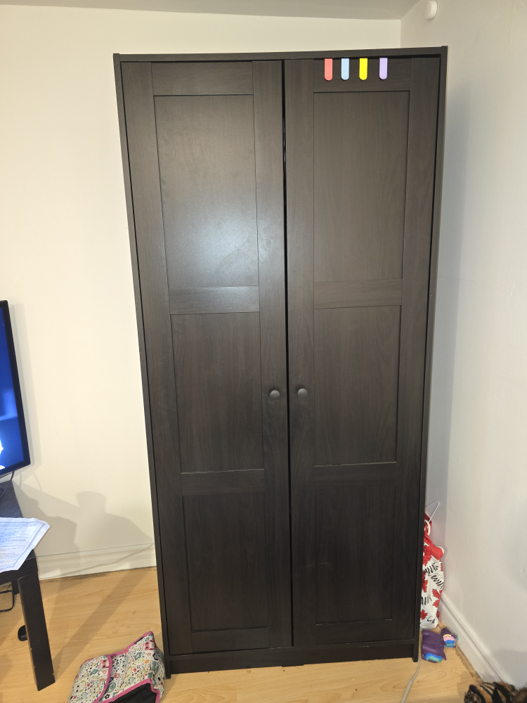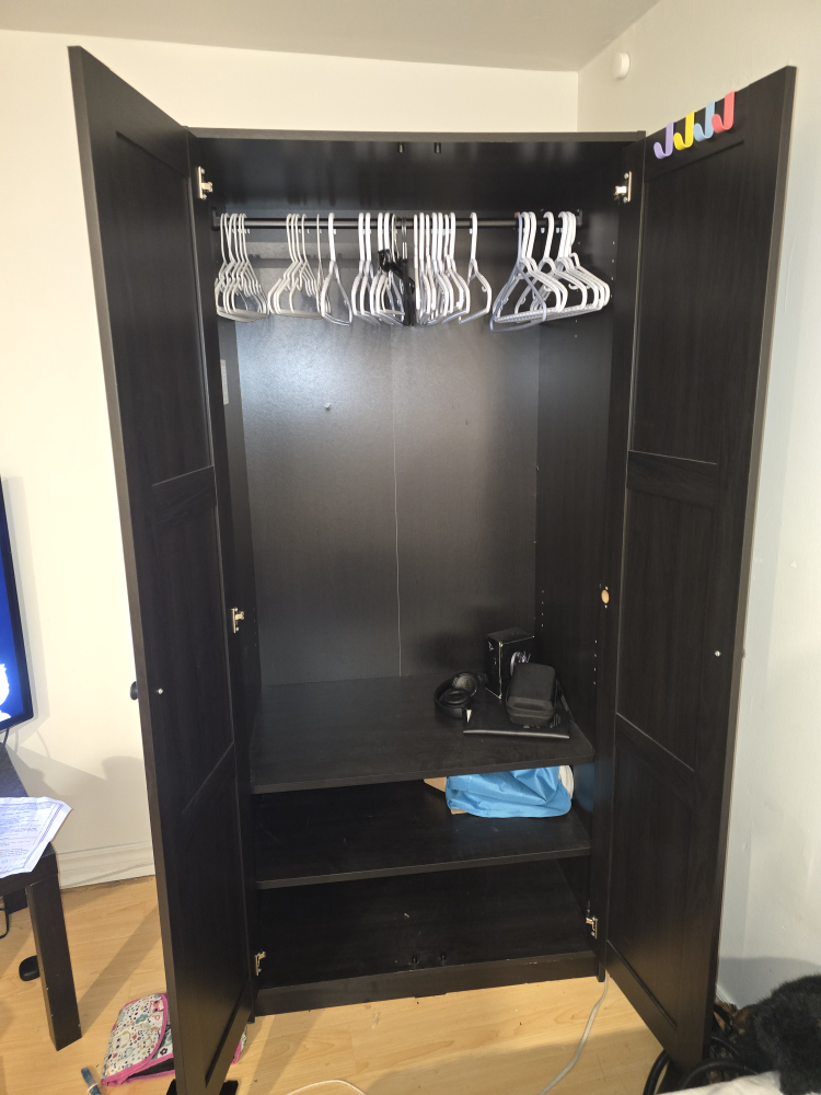 Spacious and sleek IKEA RAKKESTAD Wardrobe, perfect for any bedroom or storage space. Free hangers included for both adult and kid clothes, plus door hangers.