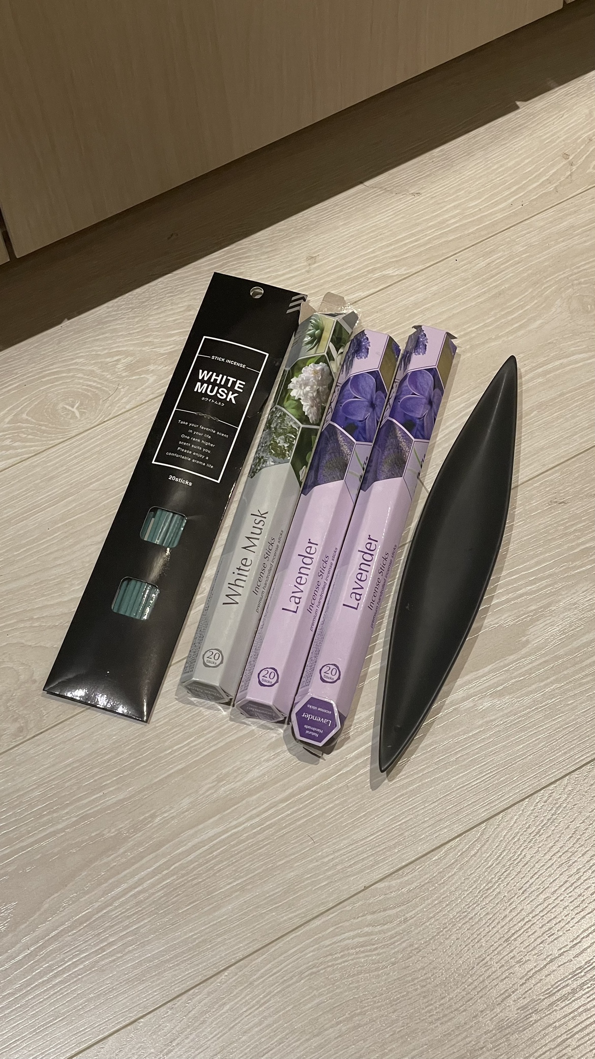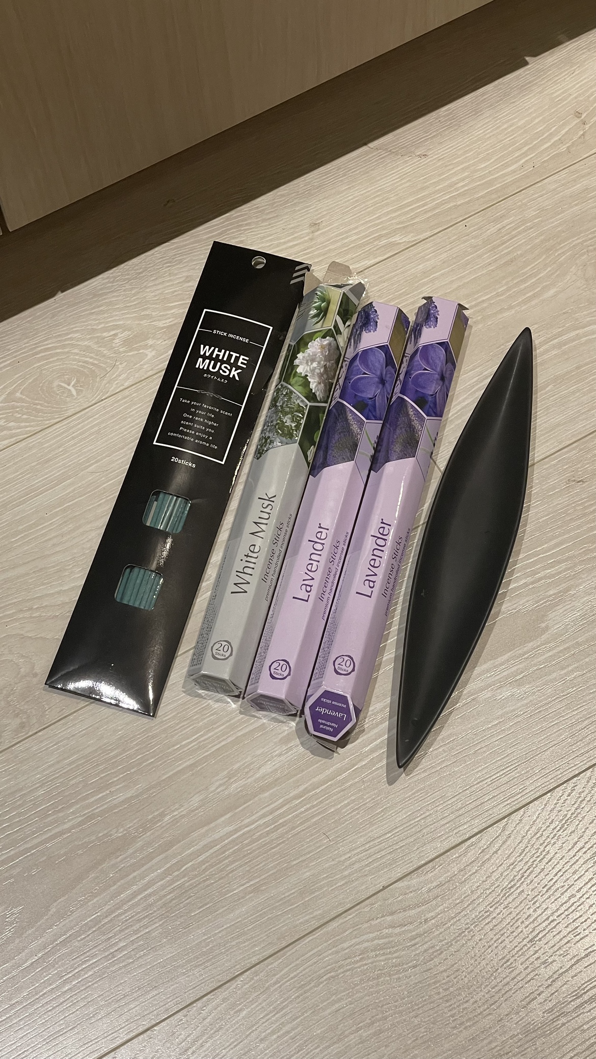 Three boxes of incense sticks, one White Musk and two Lavender, along with a black ceramic holder and different brand of white musk.