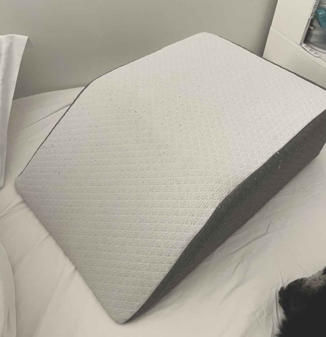 A grey and white wedge pillow. It is perfect for elevating your legs or improving your posture.
