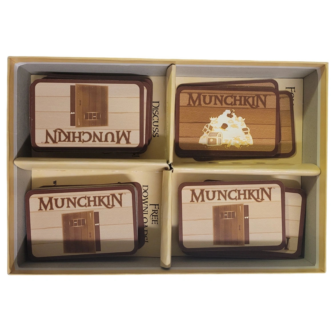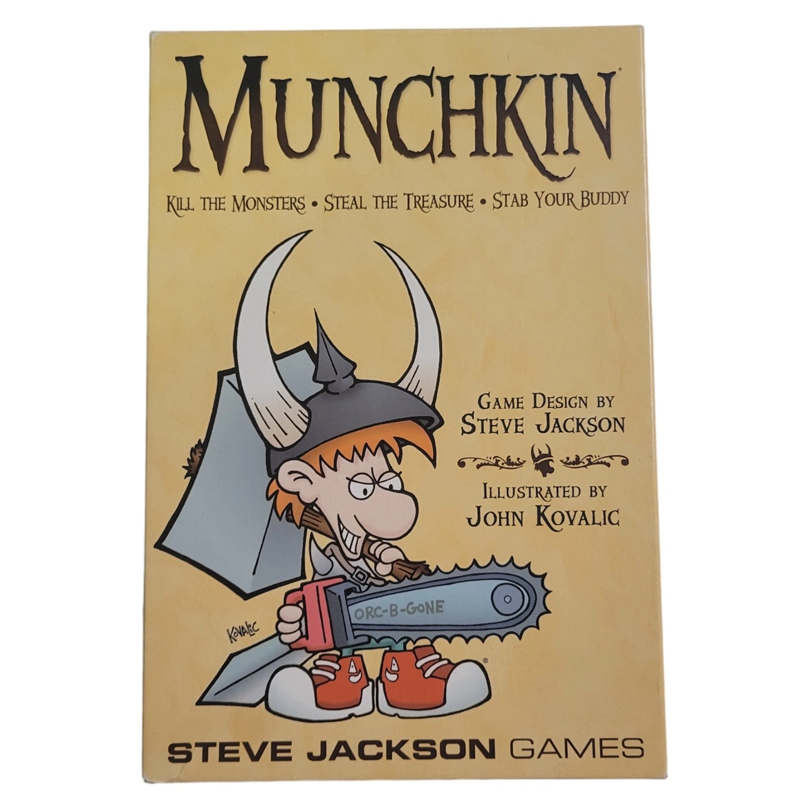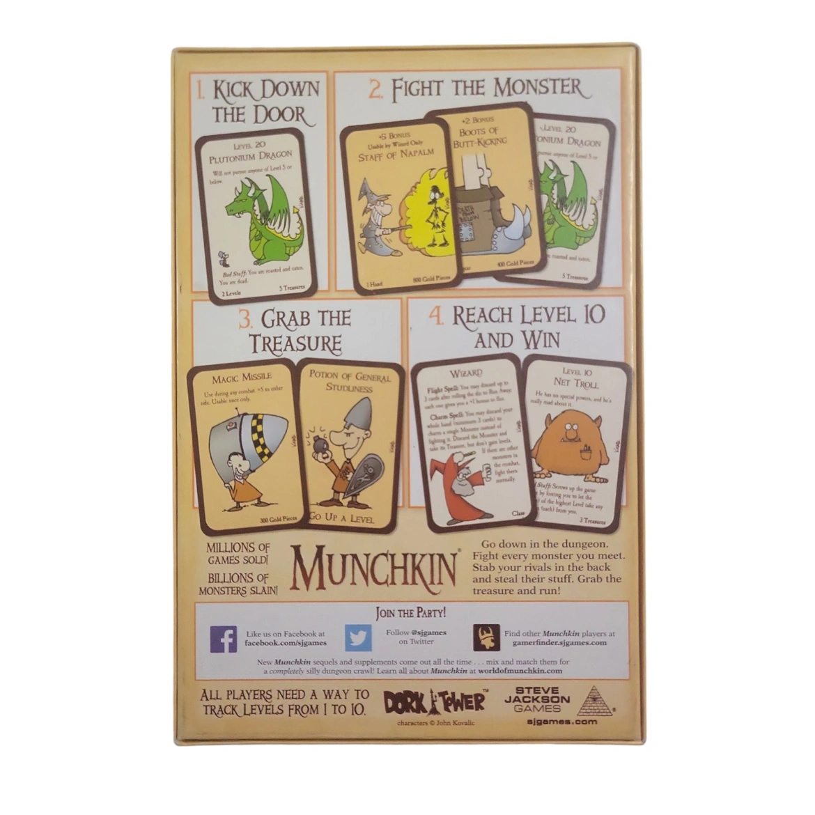 Munchkin Card Game Good pre-owned condition This award-winning card game, designed by Steve Jackson, captures the essence of the dungeon experience... with none of that stupid roleplaying stuff. You and your friends compete to kill monsters and grab magic items. And what magic items! Don the Horny Helmet and the Boots of Butt-Kicking. Wield the Staff of Napalm... or maybe the Chainsaw of Bloody Dismemberment. Start by slaughtering the Potted Plant and the Drooling Slime, and work your way up to the Plutonium Dragon... Tags: card game game night play strategy