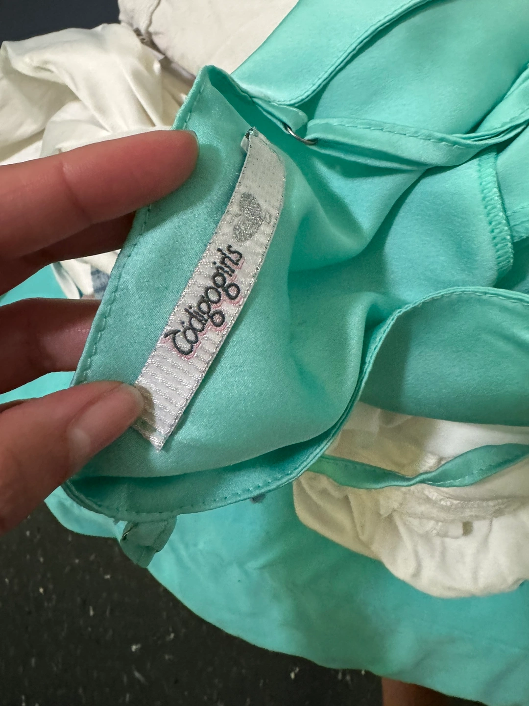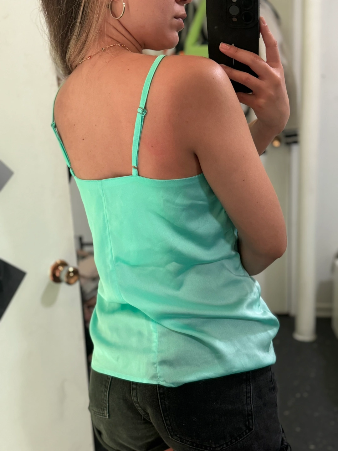 A mint green tank top. The tank top has thin straps and is a silky material. It is made by the brand "Codigo Girls"
