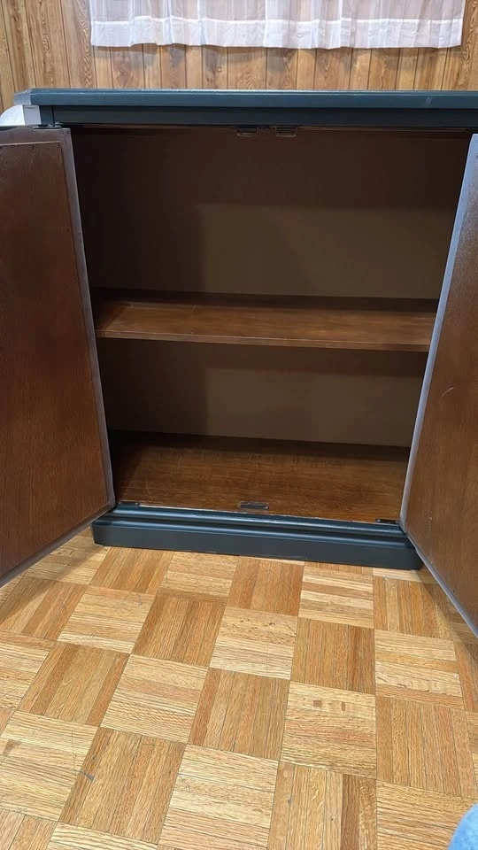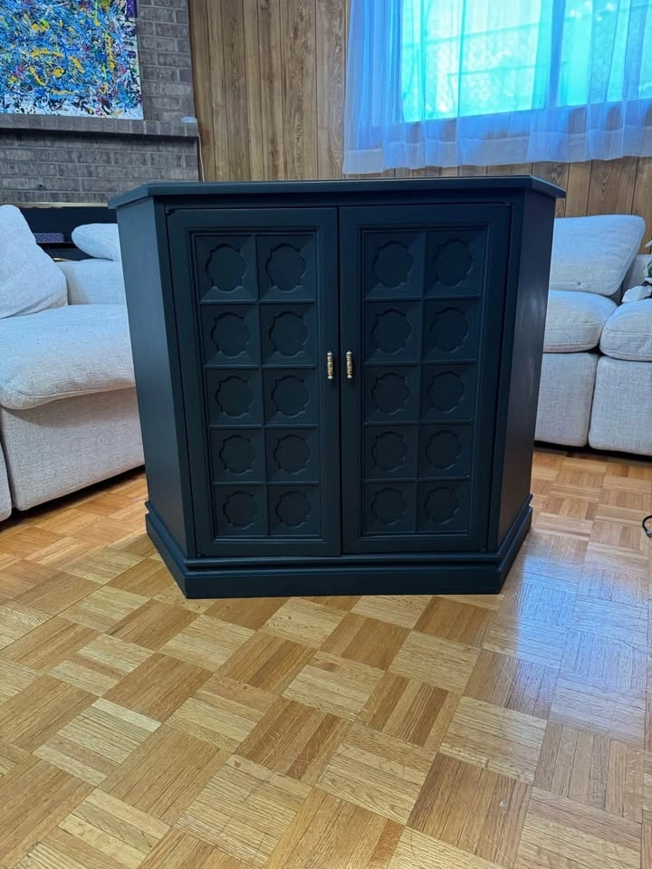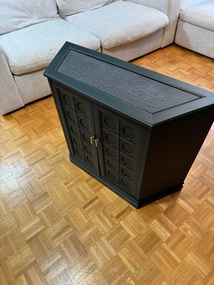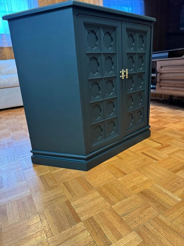 Beautiful statement cabinet just refinished in a rich dark indigo green, paired with a solid natural slate stone top. This piece blends modern elegance with subtle vintage character and works perfectly as a bar cabinet, entryway piece, media storage, or accent cabinet in a living or dining room.