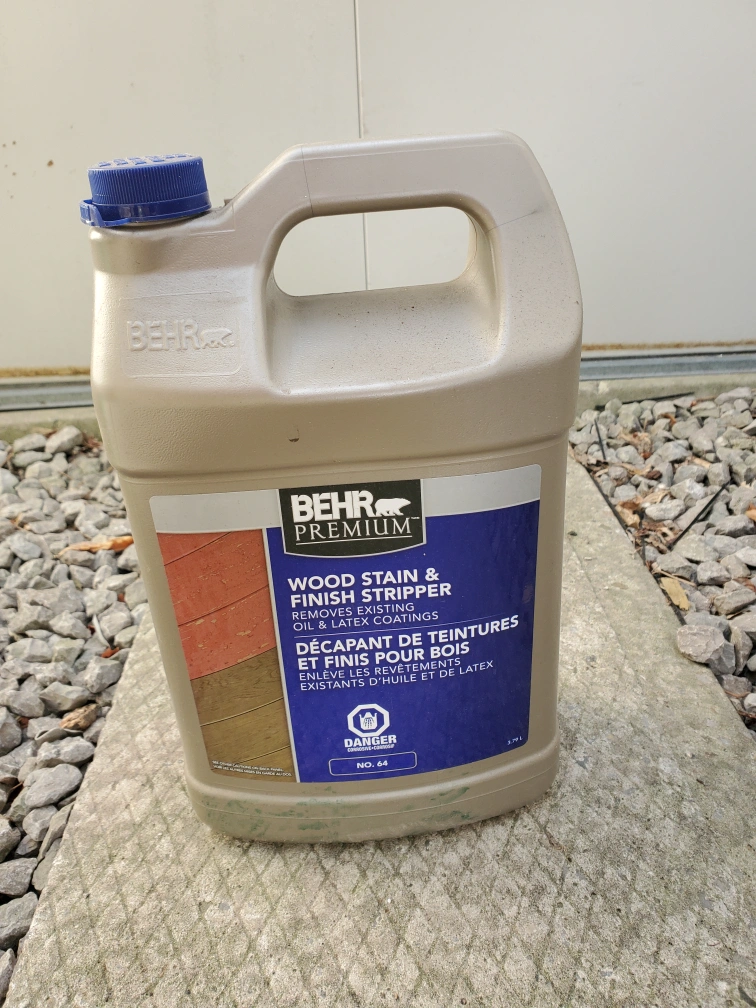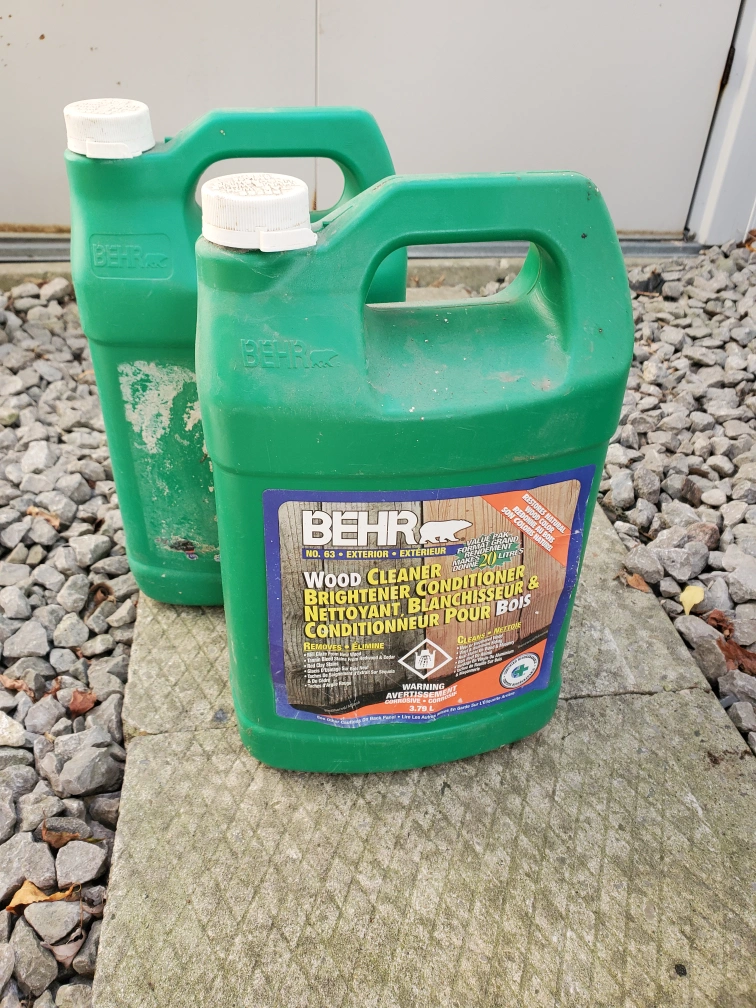 Three containers of Behr wood products. One is Wood Stain & Finish Stripper. The other two are Wood Cleaner & Brightener/Conditioner. All have been opened and are at least half full.