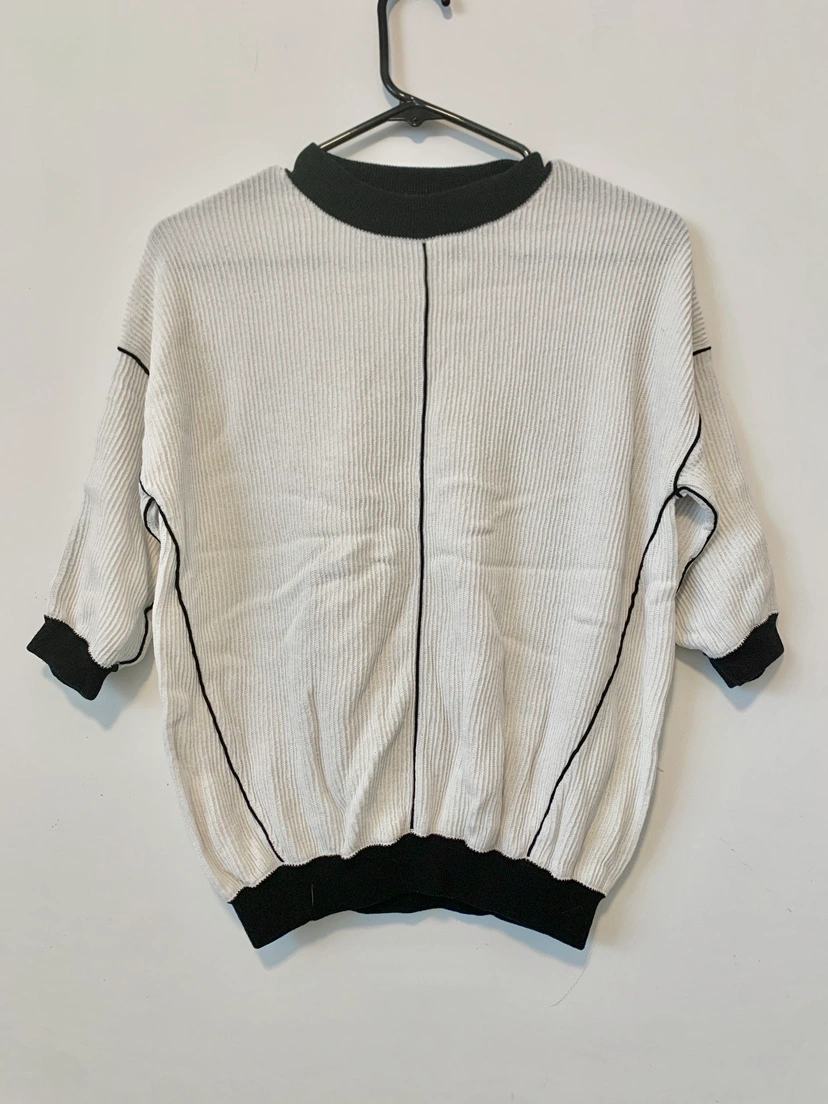 A white sweater with black trim. It has a ribbed texture. The sleeves are 3/4 length. It has a crew neckline.
