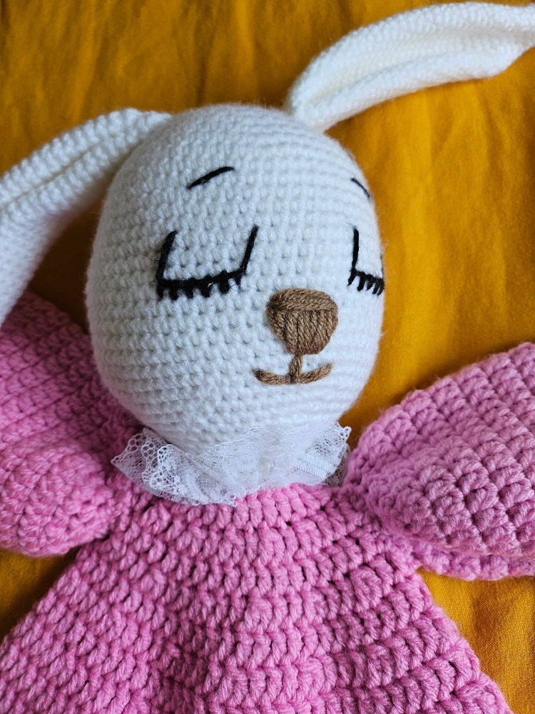A soft and cuddly crocheted bunny lovey, perfect for a little one. It is in a soft pink colour. The bunny is approximately 15 inches long. It has a white face and long white ears. Also included is a pkg of decorative animal. New unopened tot lock. And another little stuffy doll.
