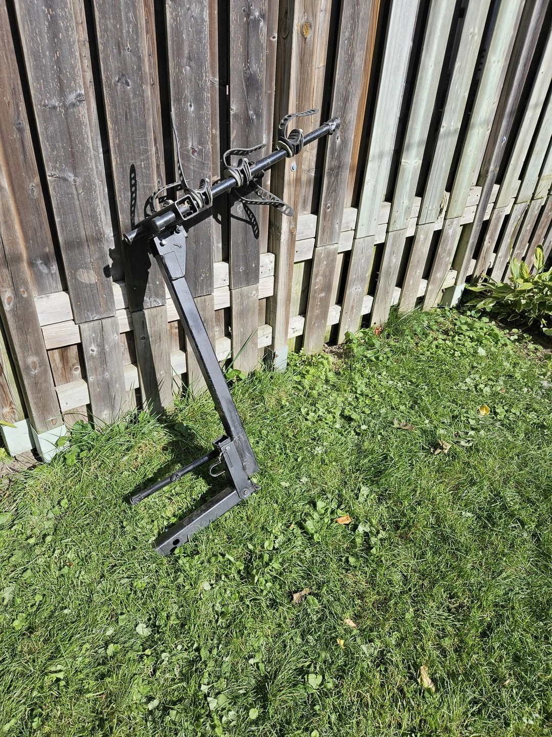 Hitch mount rack for 3 bikes. It is in good condition and includes all the necessary hardware. The rack is made of steel and is designed to fit a 2 inch receiver hitch.