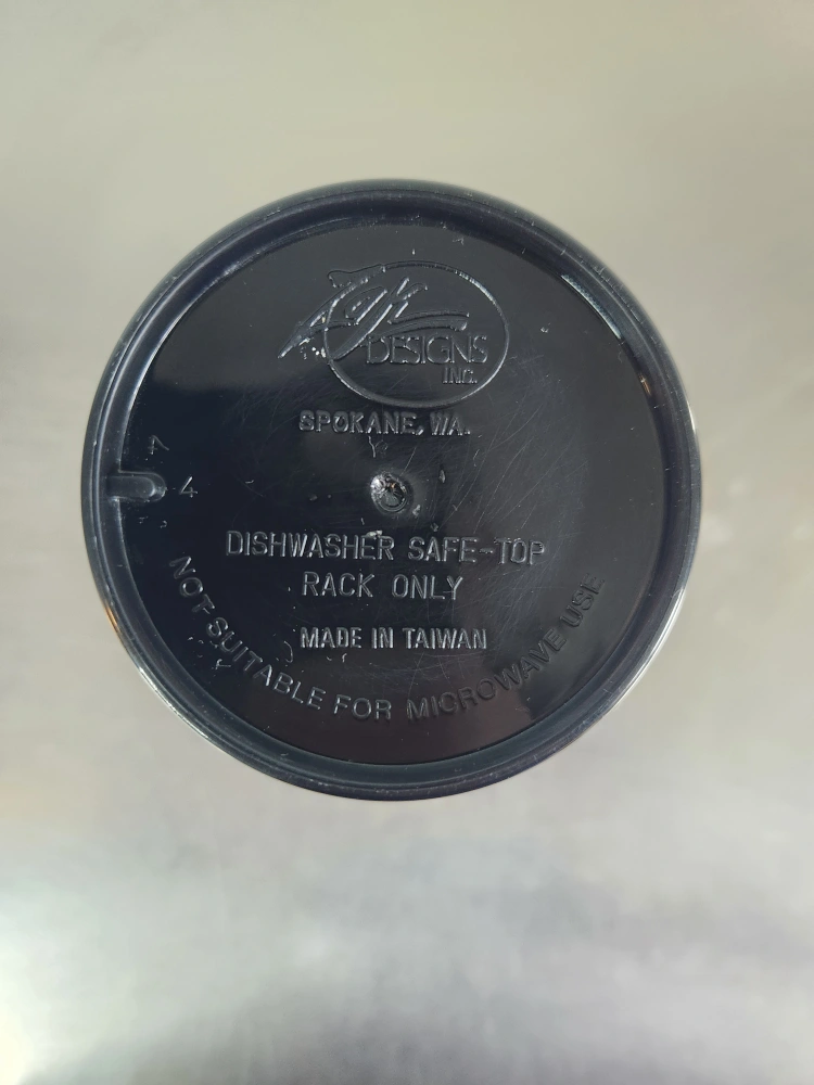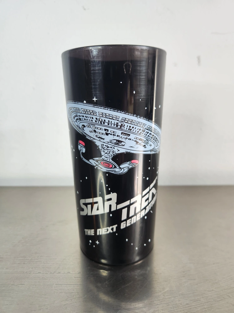 Black plastic tumbler with Star Trek The Next Generation logo. The tumbler is dishwasher safe, top rack only. It is not suitable for microwave use. Made in Taiwan.