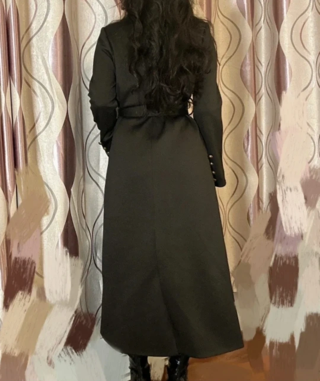 I love this coat but it fits me large now. This coat also can fin on medium (I used to be medium) This coat has a double breasted front with gold buttons and a waist tie. It has pockets and a long cut