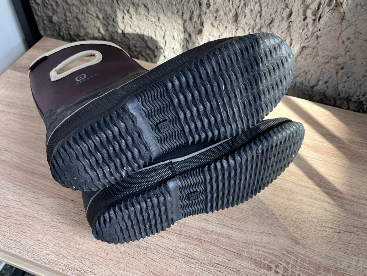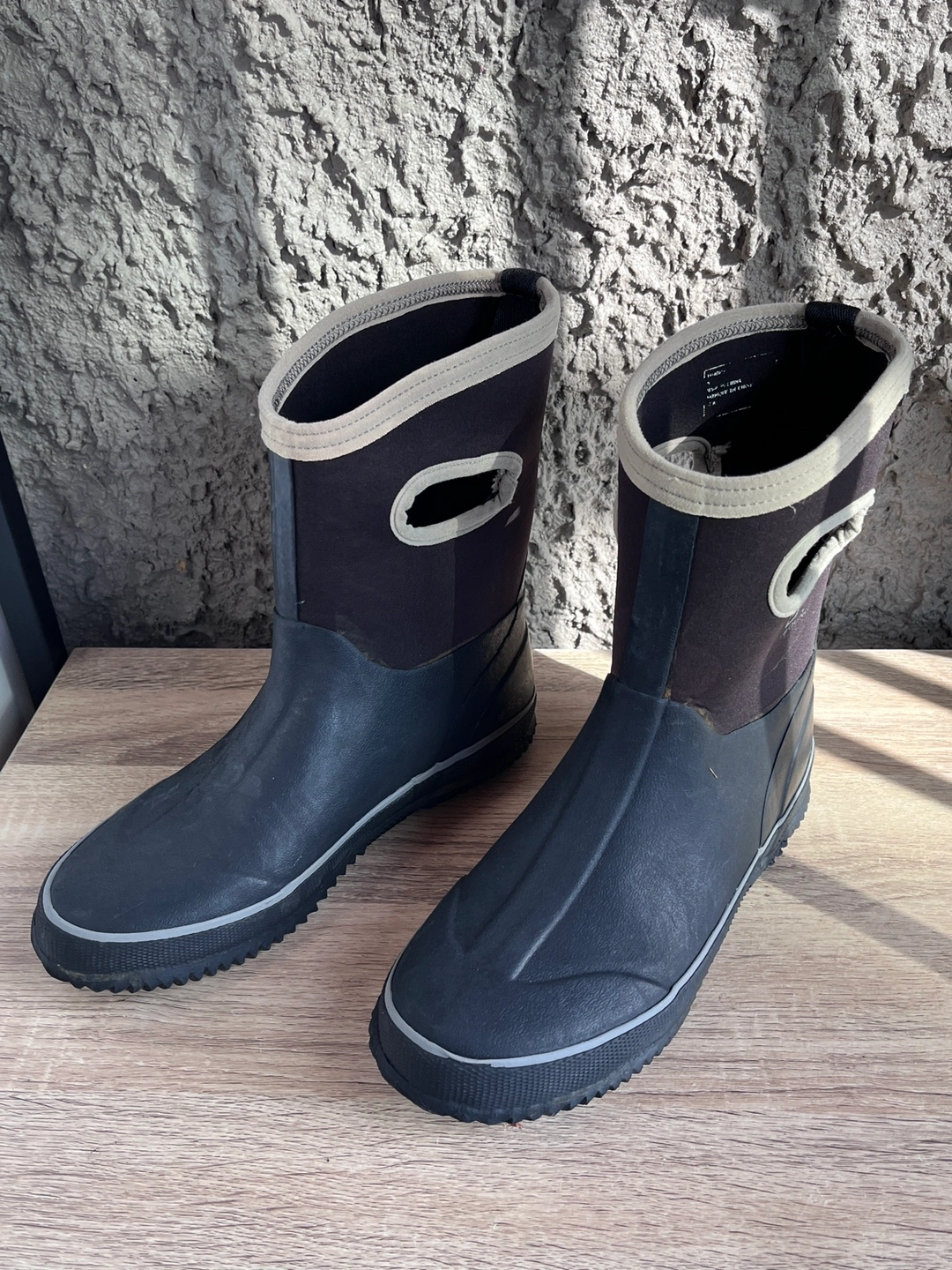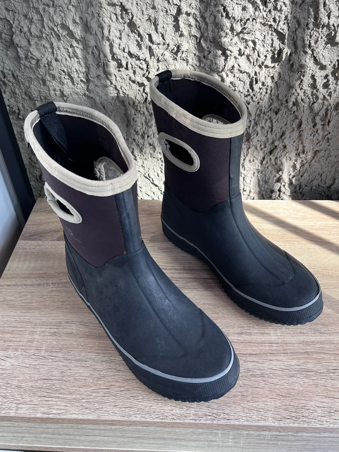 Black and brown winter boots. They have a fleece lining. They are in good condition.