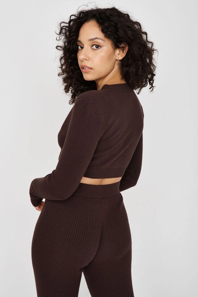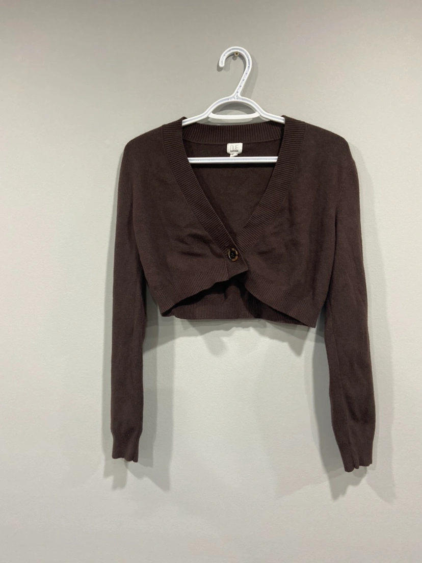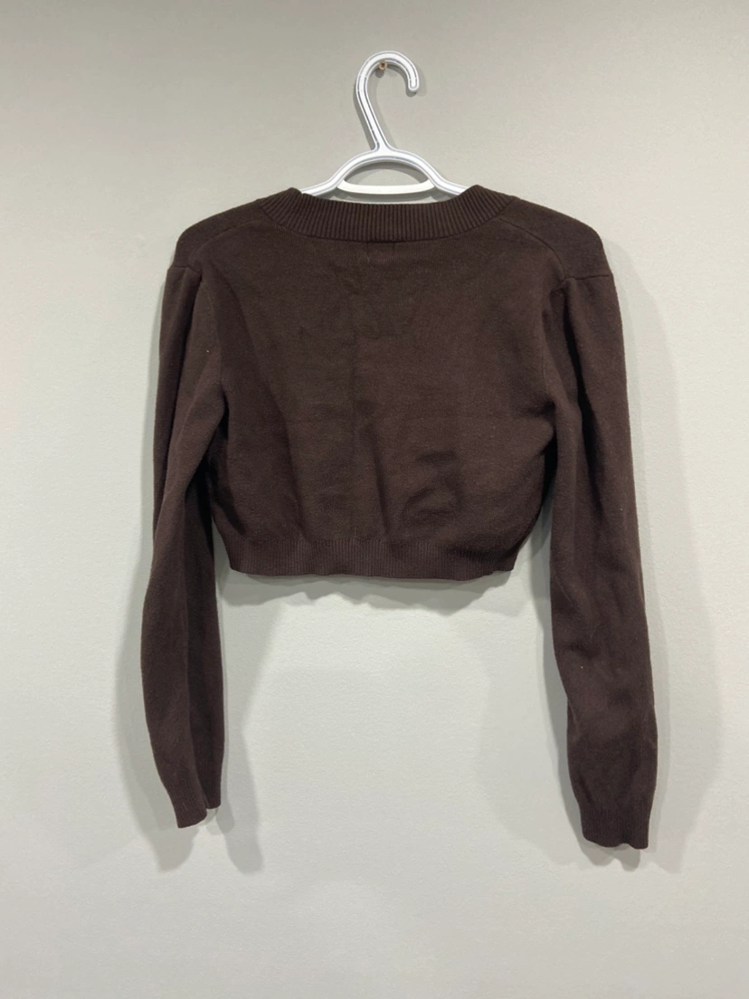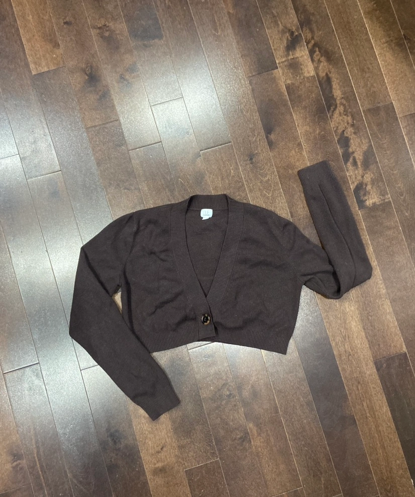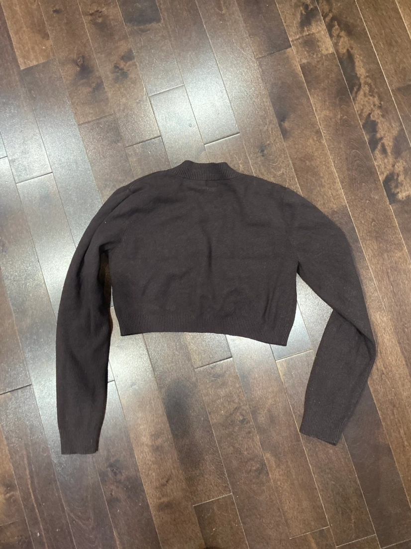 Chocolate cardigan sweater in excellent condition. Size large and very cropped. Cozy and so cute ! Purchased from Garage.