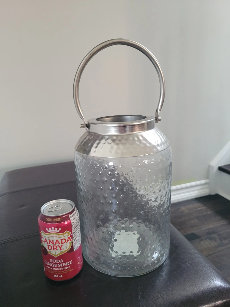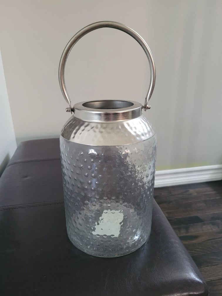 Clear glass hurricane vase with a metal handle and a hammered silver finish. It would be a great addition to your home decor!