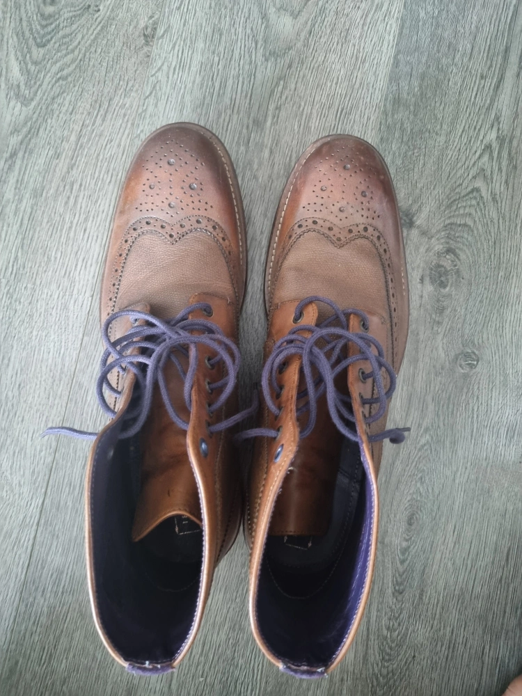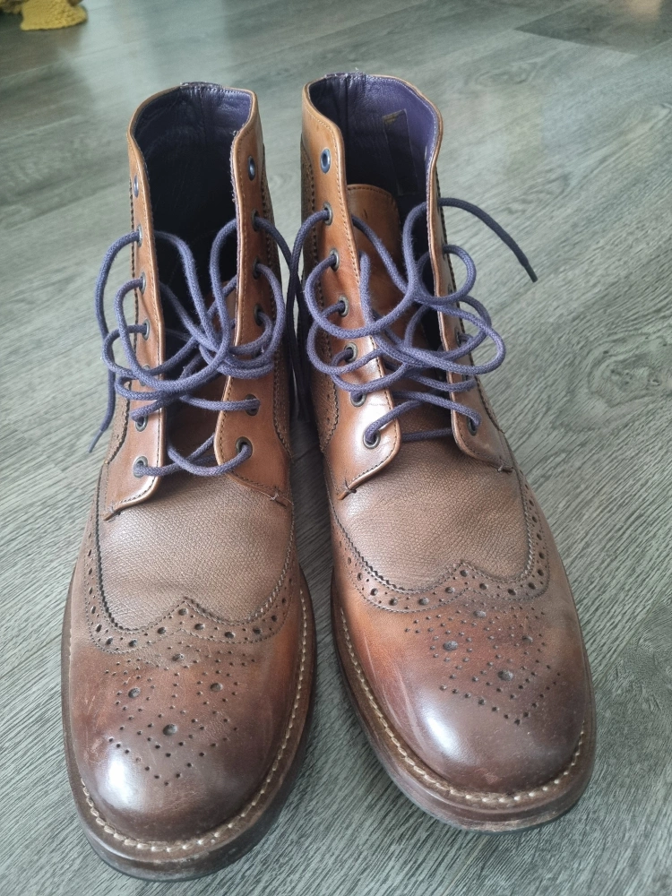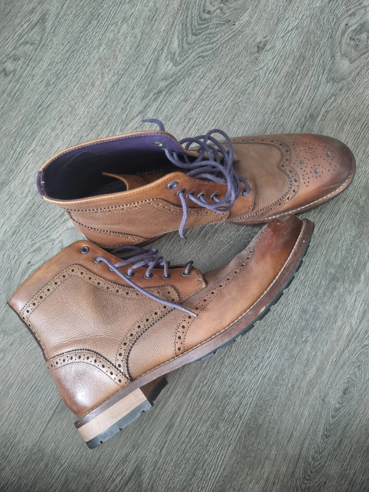 These are brown leather boots with a lace-up closure. They have a brogue design and are in good condition.