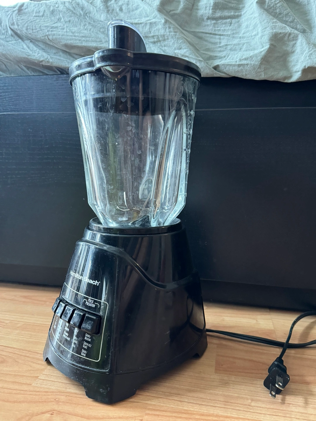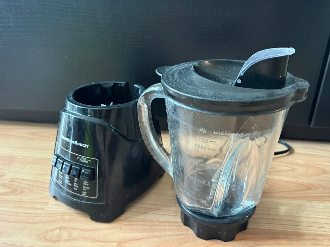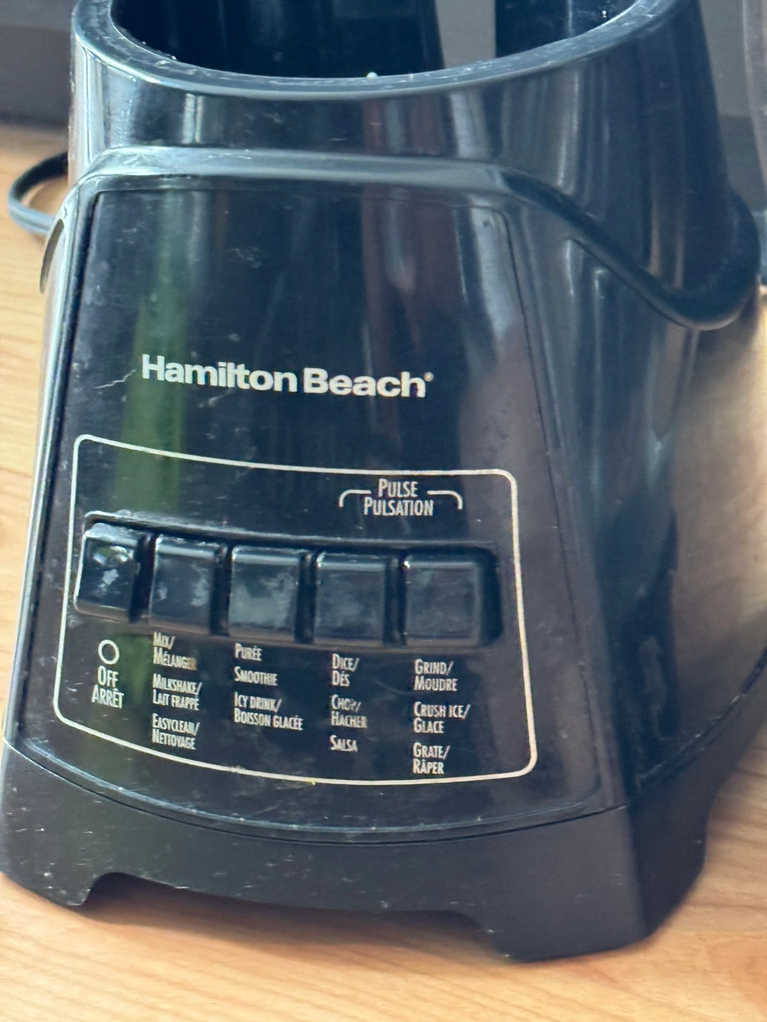 Black Hamilton Beach blender. Features a variety of settings including: smoothie, ice crush, grind, and puree. Includes a removable blender jar and lid.