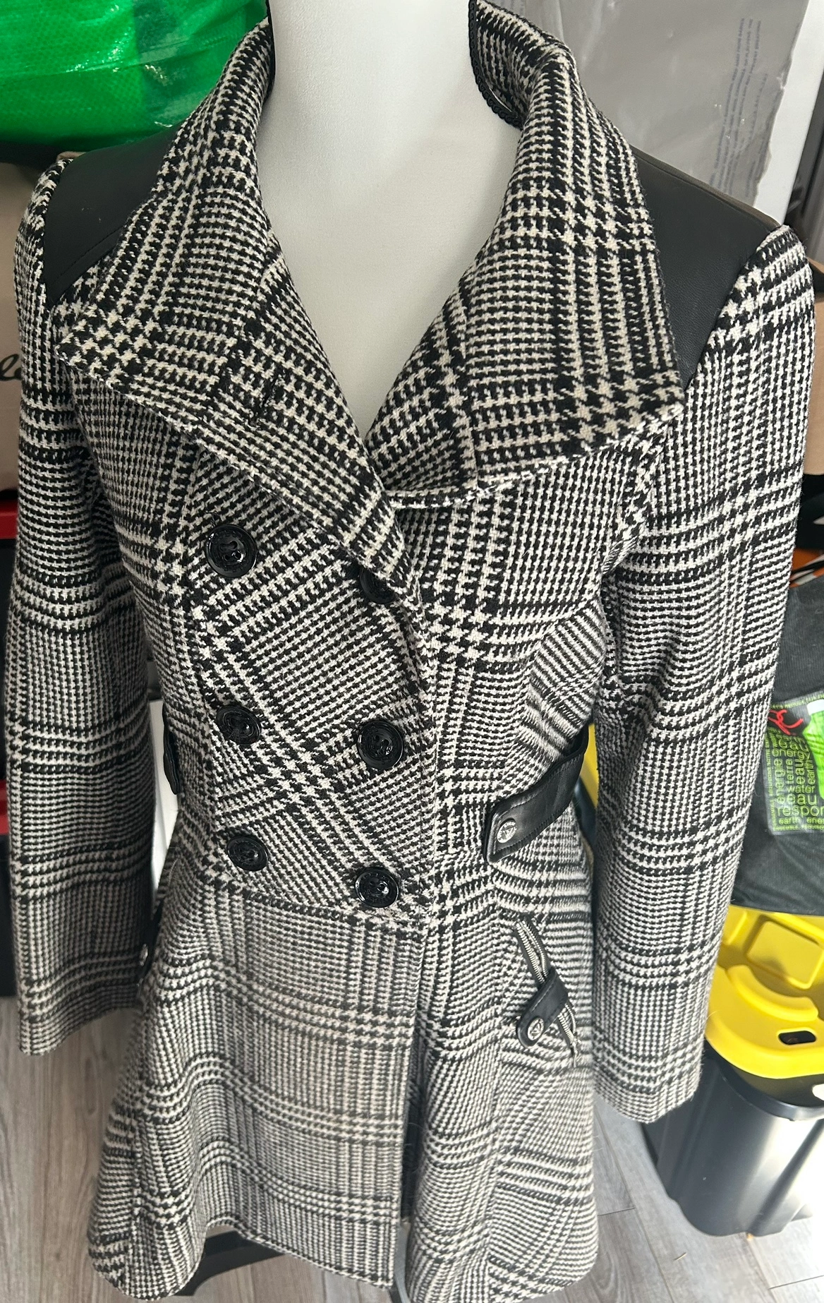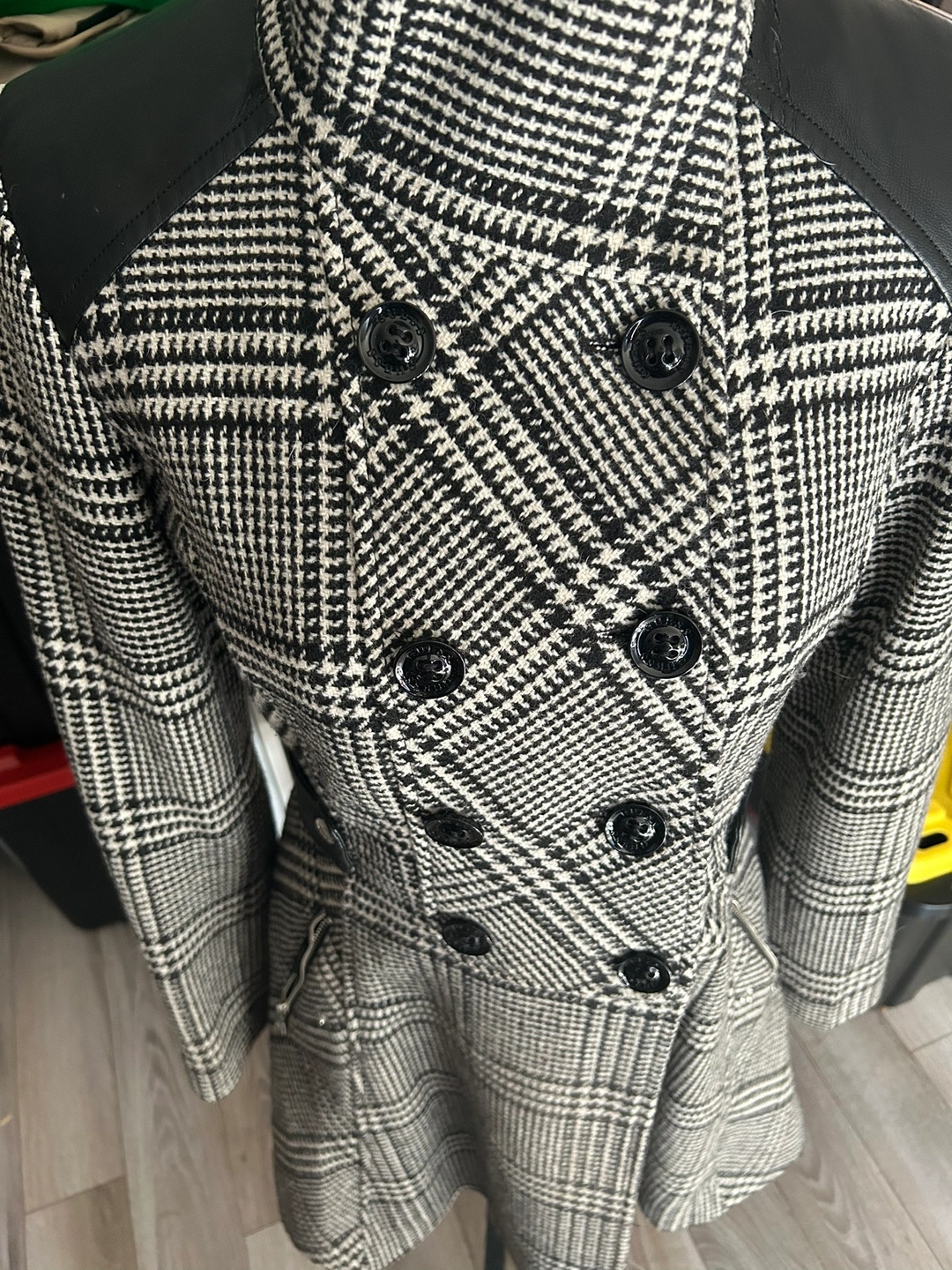 Size Small Guess wool blend trench coat. Double breasted with faux leather accents. Lightly used and in like new condition. Small scratch to left leather on shoulder, barely noticeable especially with neck piece/lapel folded down.