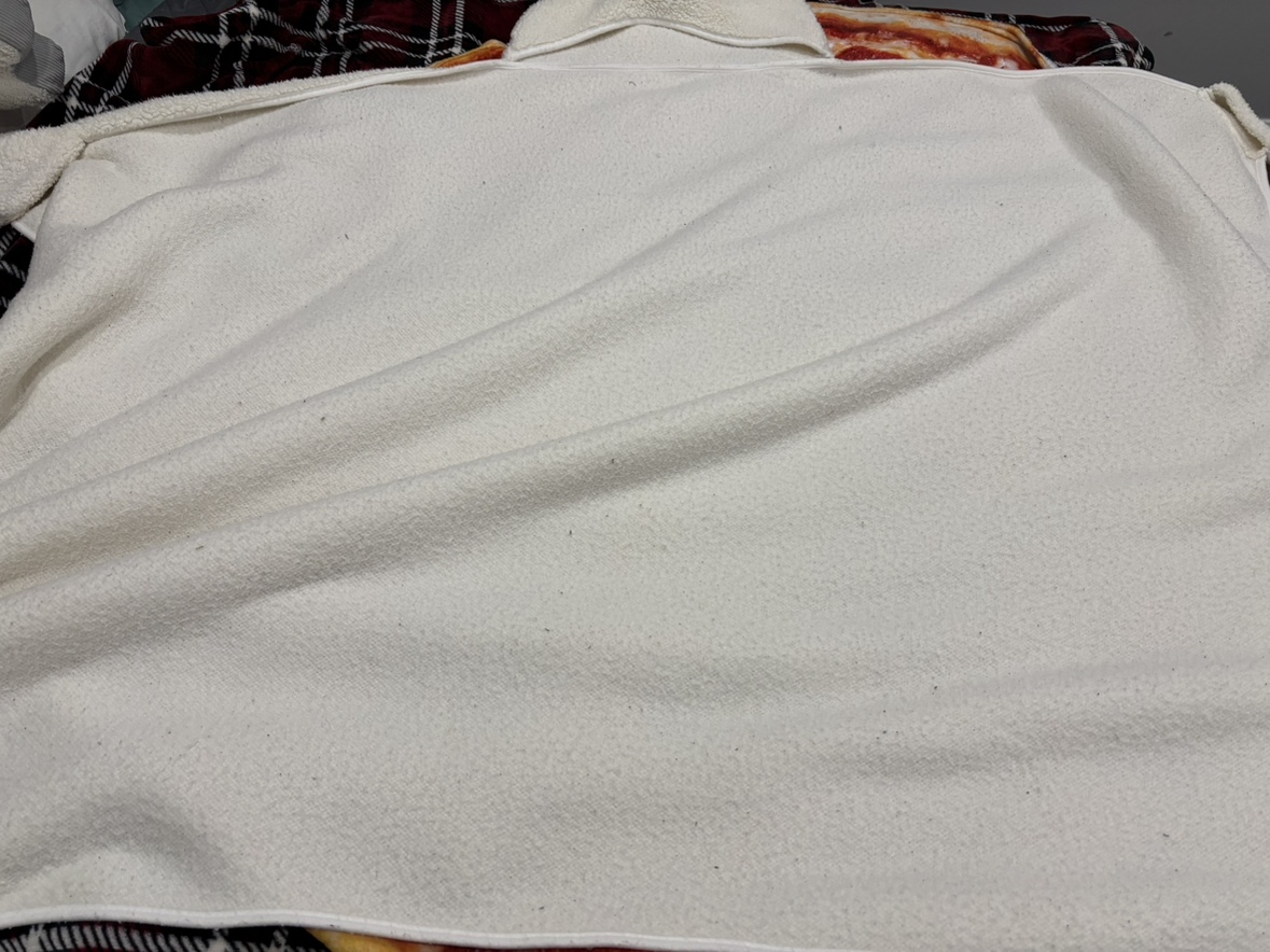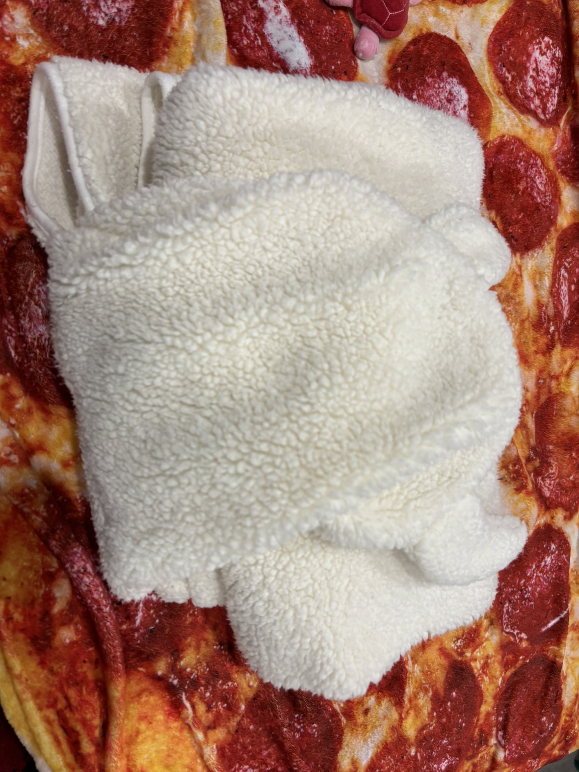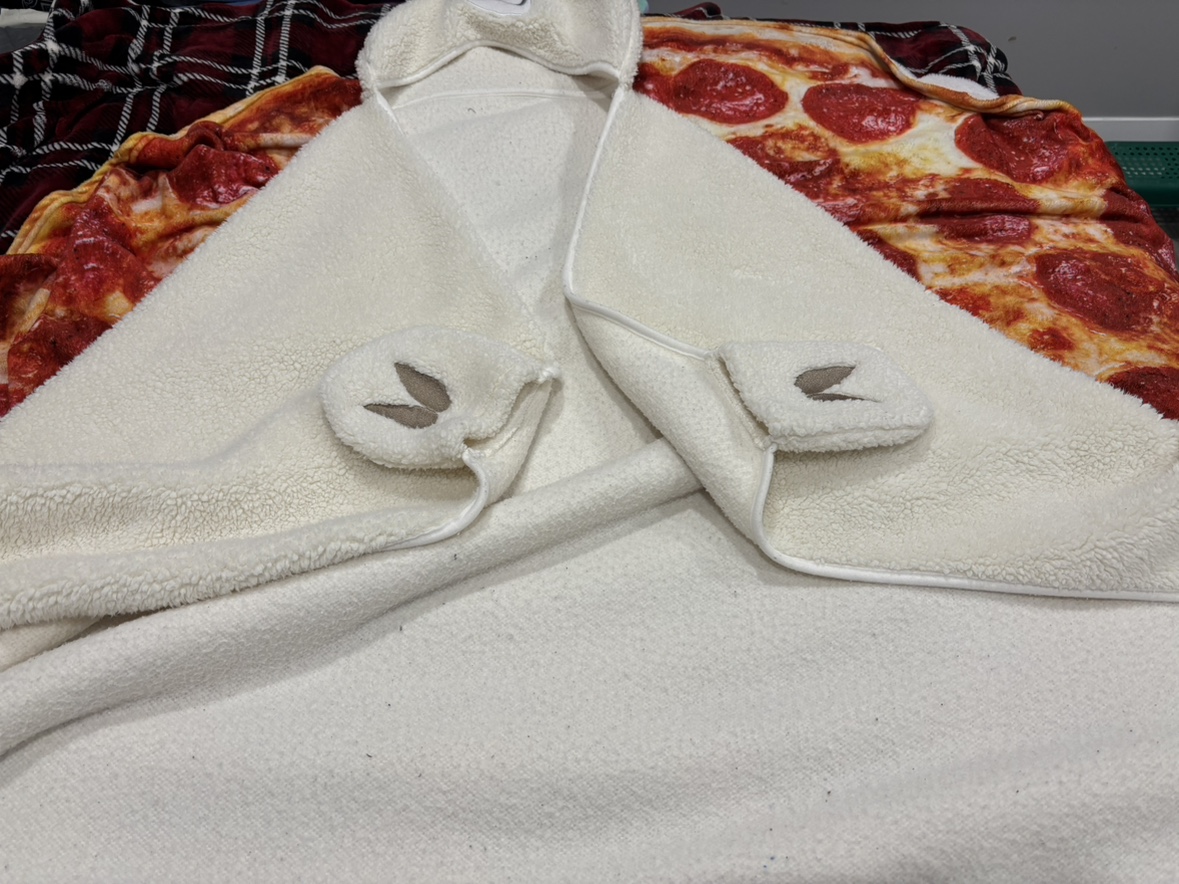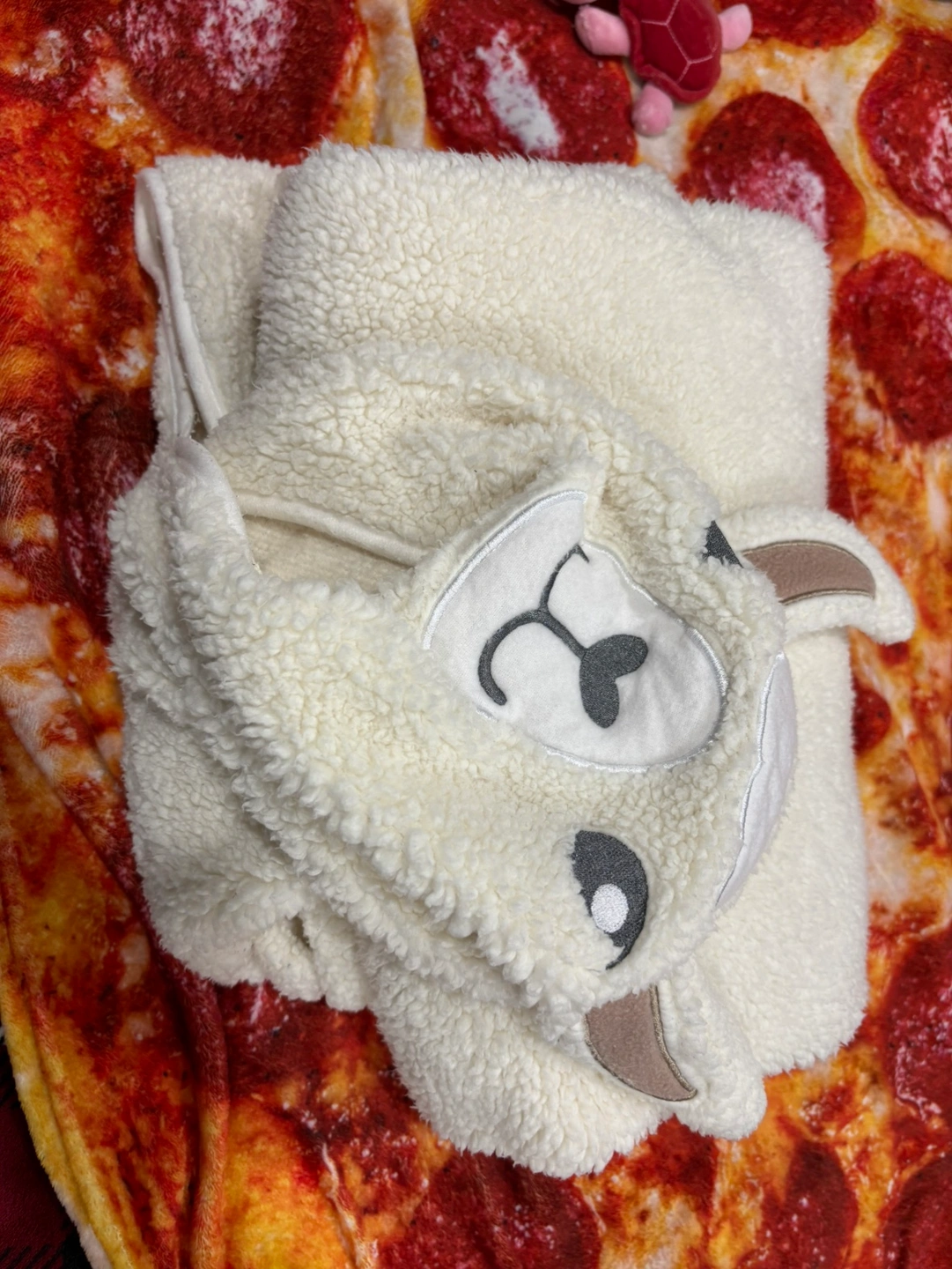 White hooded blanket with llama face. It is very soft and fuzzy. It is the perfect thing to snuggle up in on a cold day.
