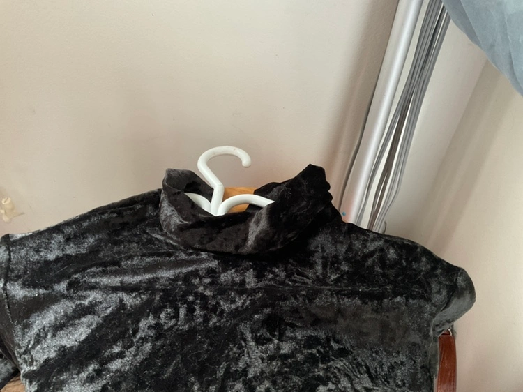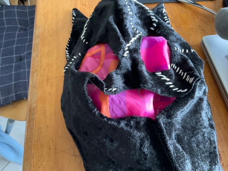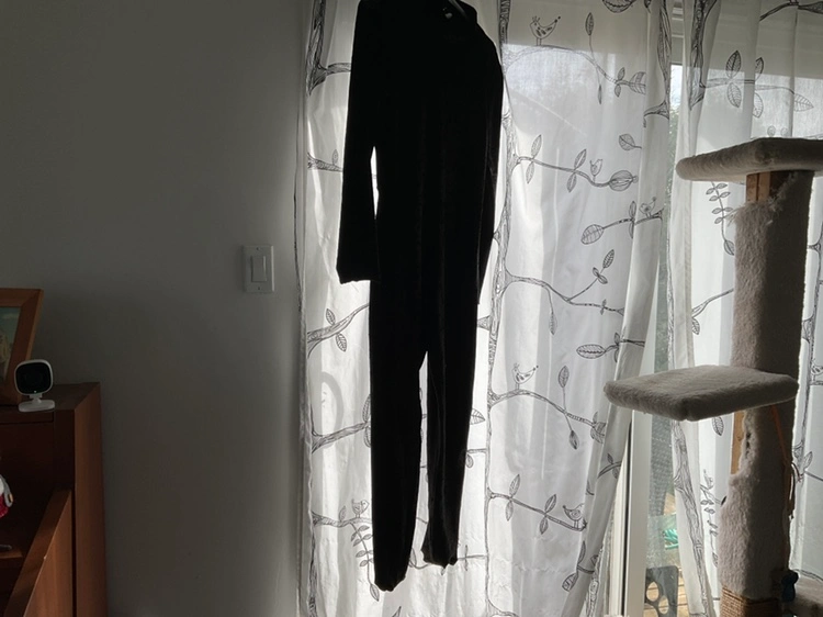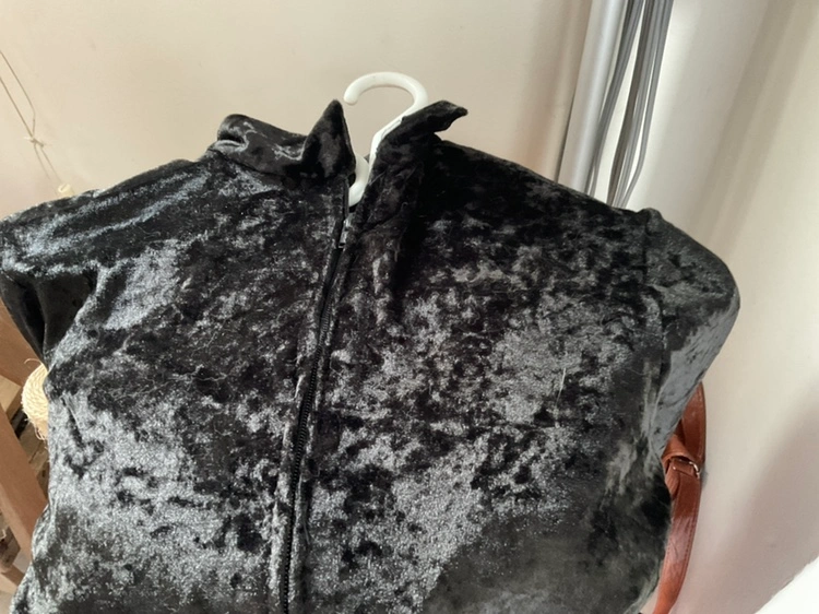 102Black velour jumpsuit with cat ears headpiece and mask.