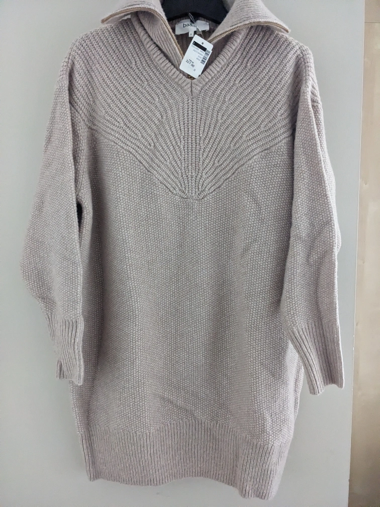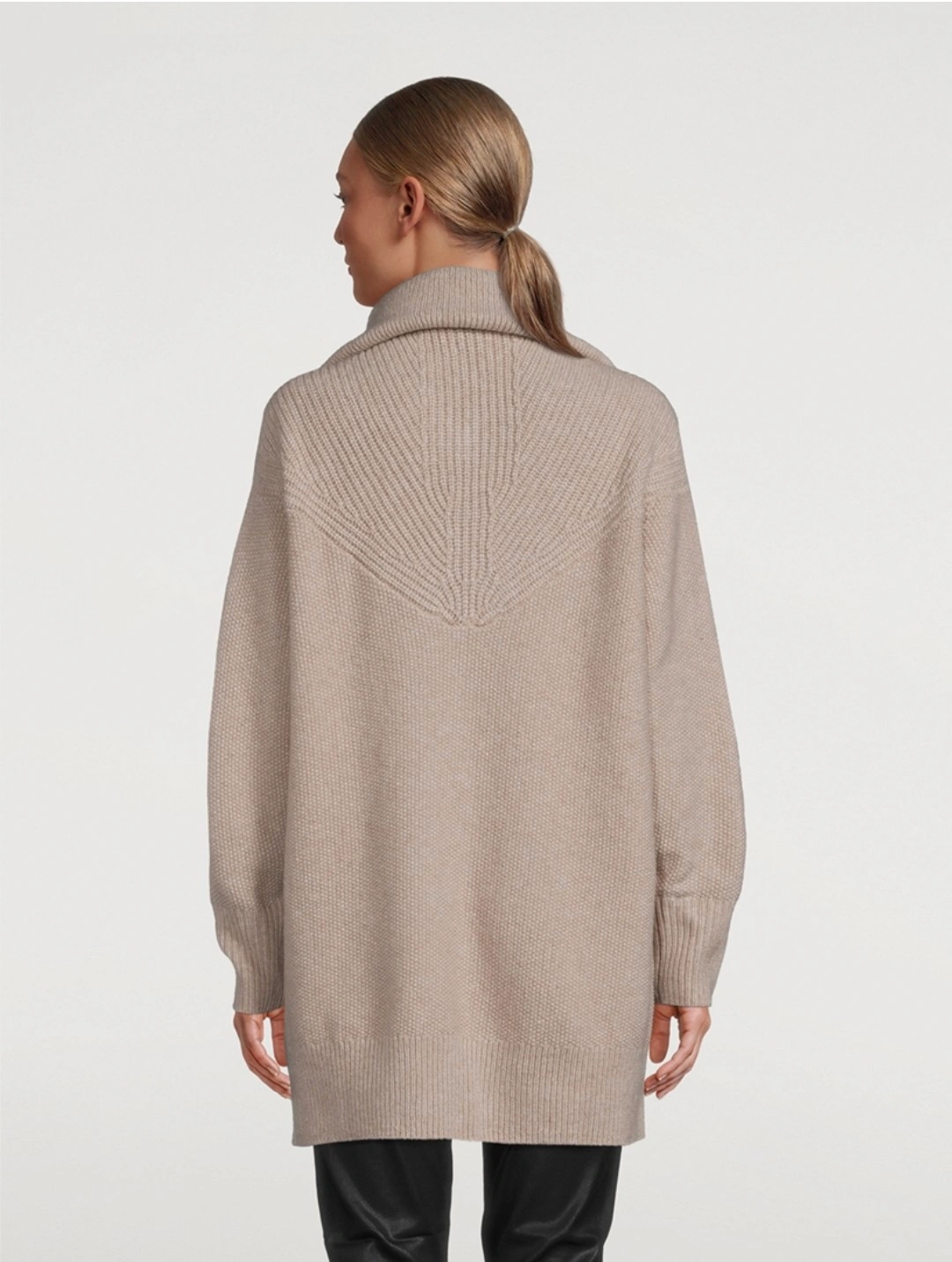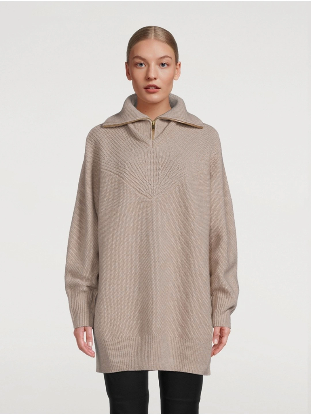 This cozy sweater is crafted of a wool-blend knit with textured stitching at the yoke and wide-set ribbed trim at the collar, cuffs and hem. It has a rollneck with a gold-tone zip within a moss-stitch V-neck, plus drop armholes and wide ribbed edging on the bottom hem and cuffs. 75% Wool, 25% Nylon Rollneck Long-sleeve Quarter-zipper closure