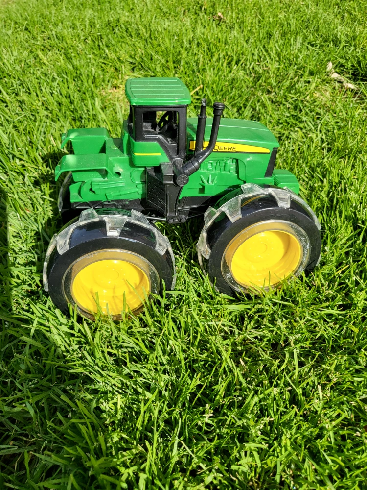 pickup 700 humberwood Boulevard etobicoke M9W7J5 Green and yellow toy tractor. Large wheels with black rims and yellow centres. Has black plastic details. Made of plastic.