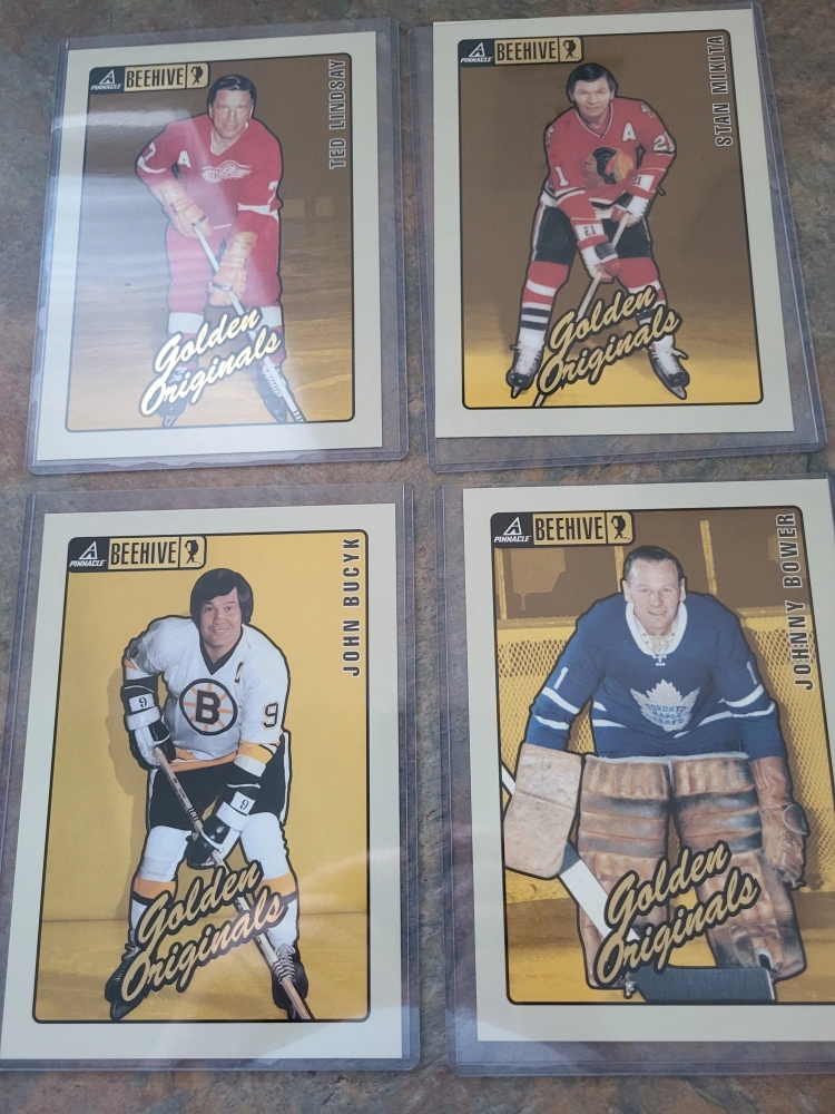 311Set of four Pinnacle Golden Originals Hockey Cards, featuring Ted Lindsay, Stan Mikita, John Bucyk, and Johnny Bower.