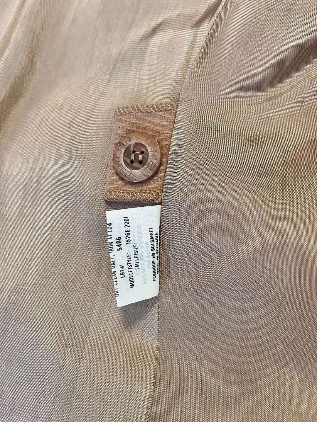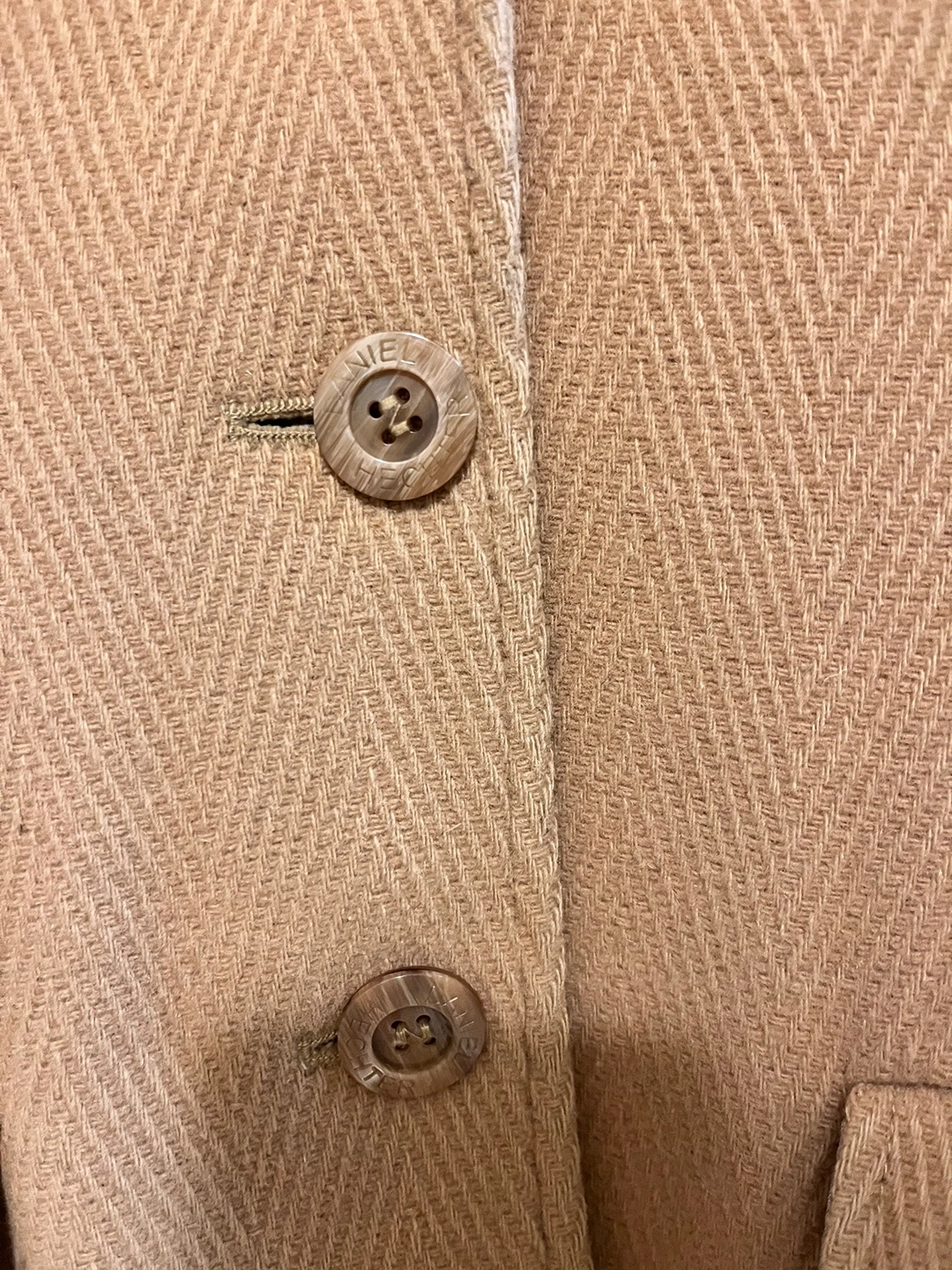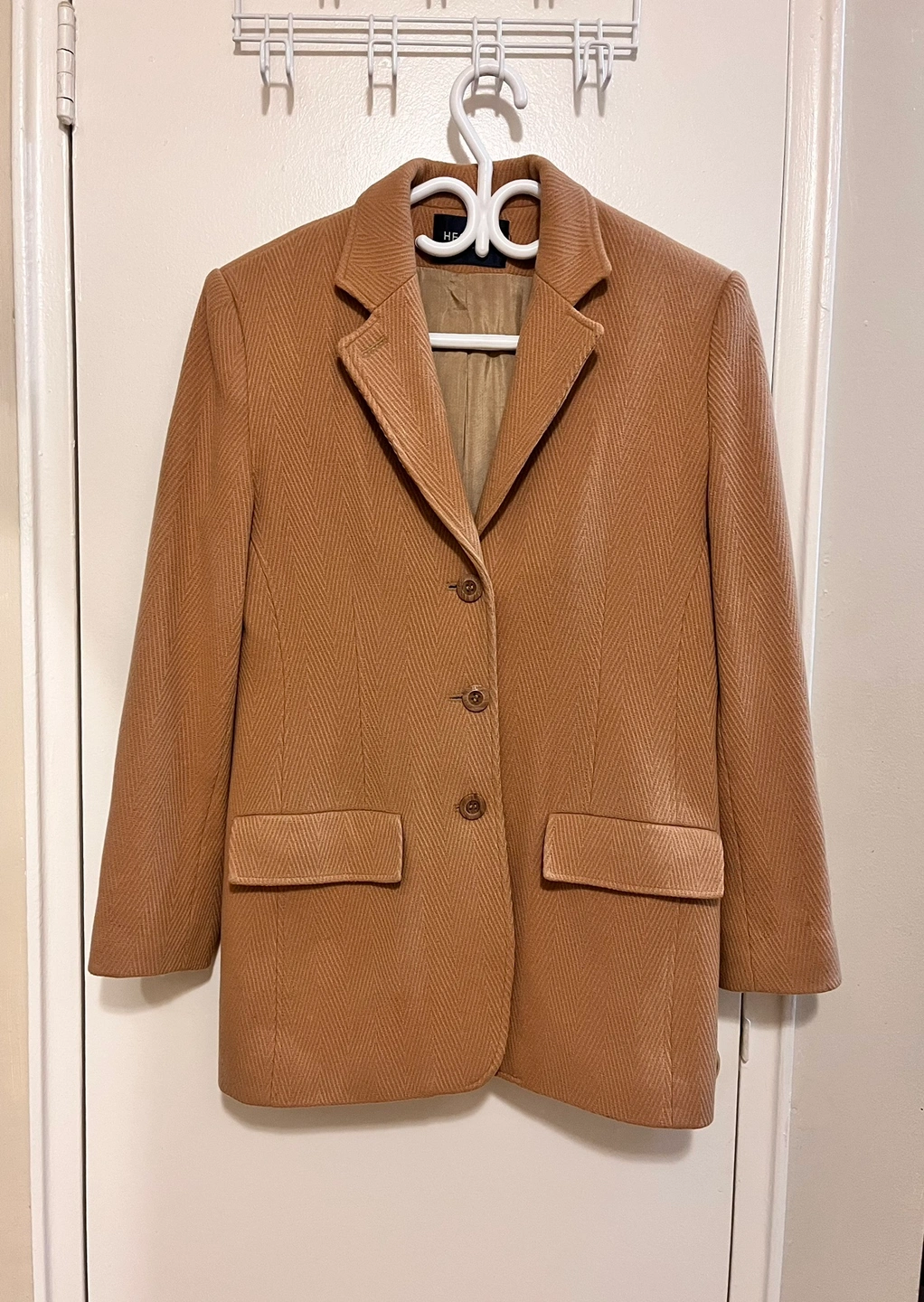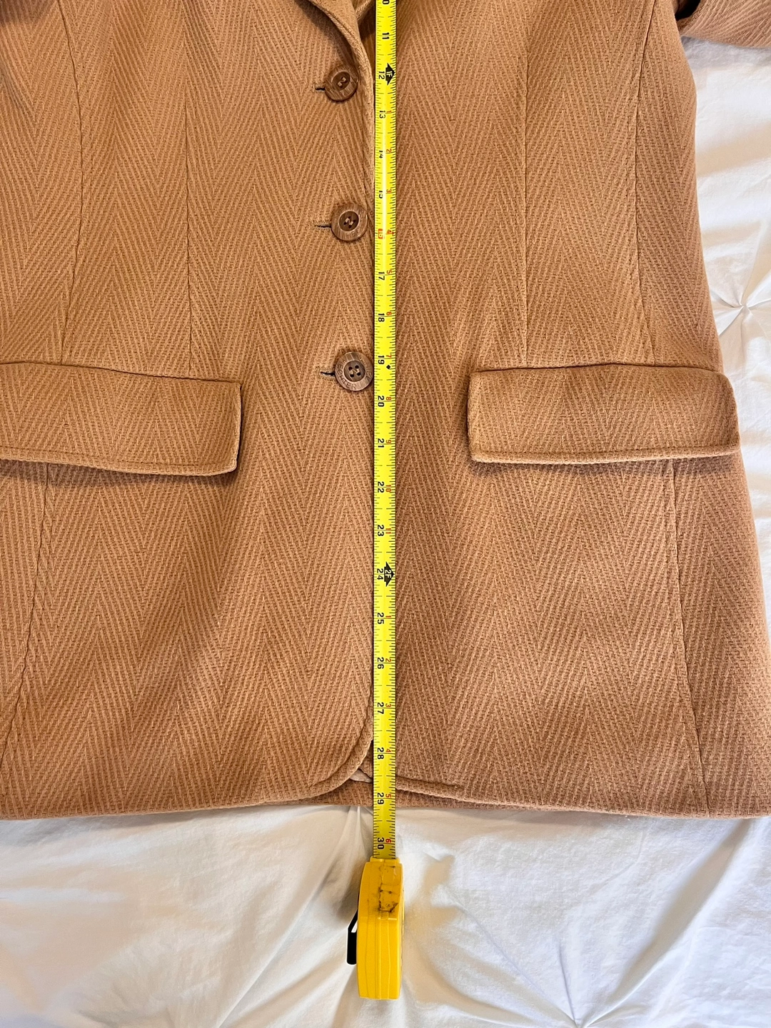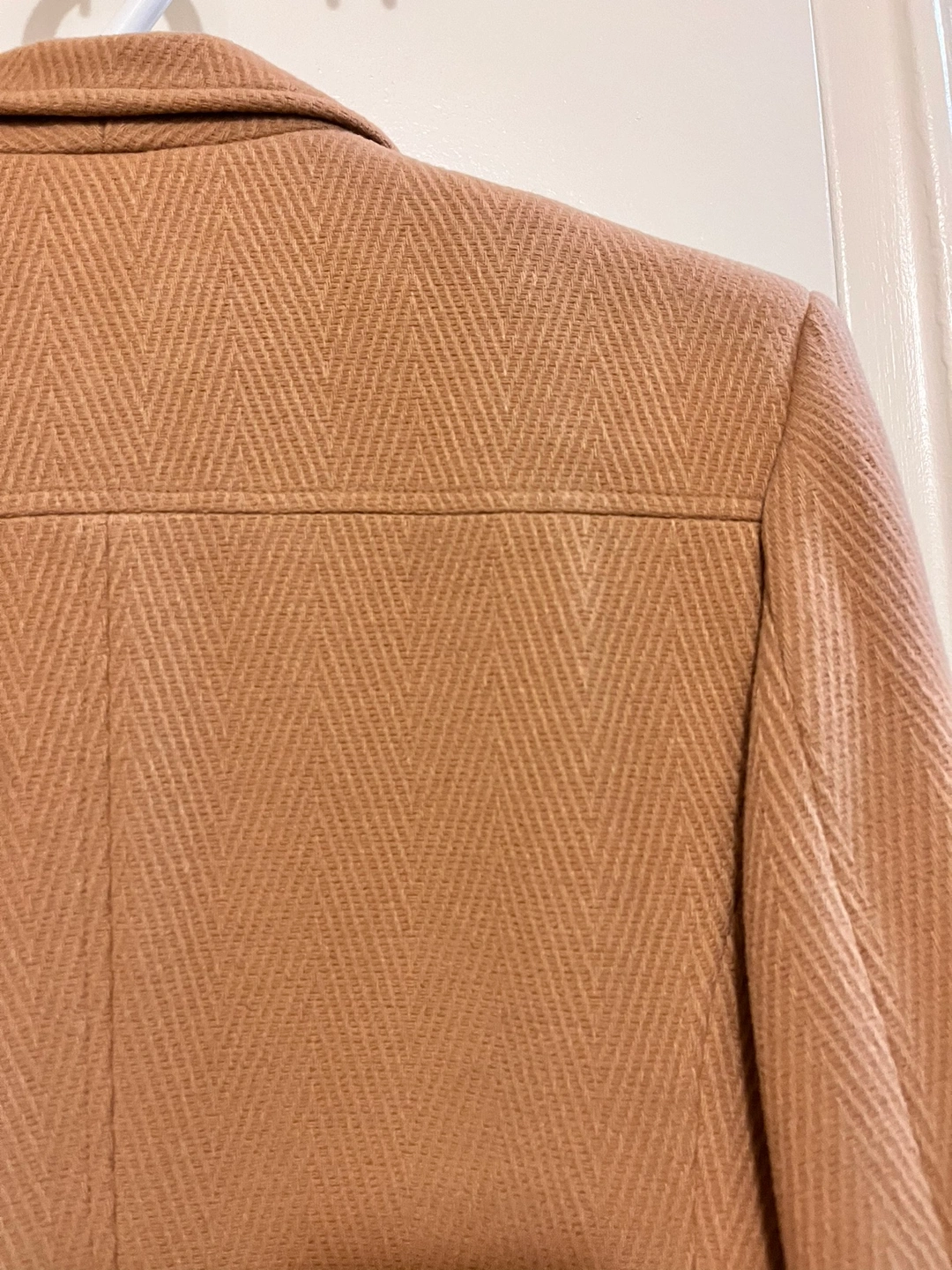 Classic with a herringbone pattern. It is fully lined and features a button -up closure at the front. There are two pockets The jacket is made of a 75%Wool 5%Cashmere 20%Nylon blend.