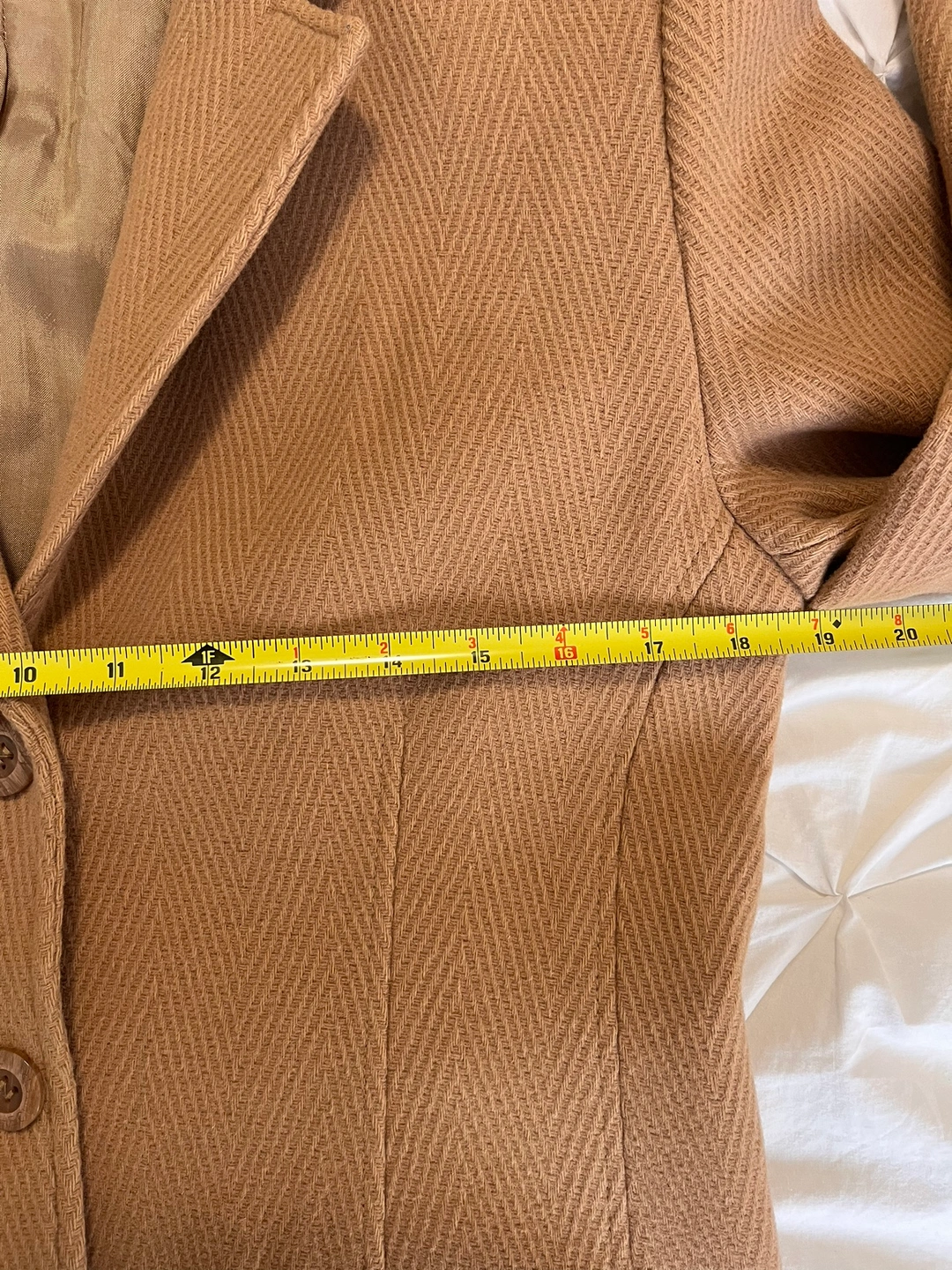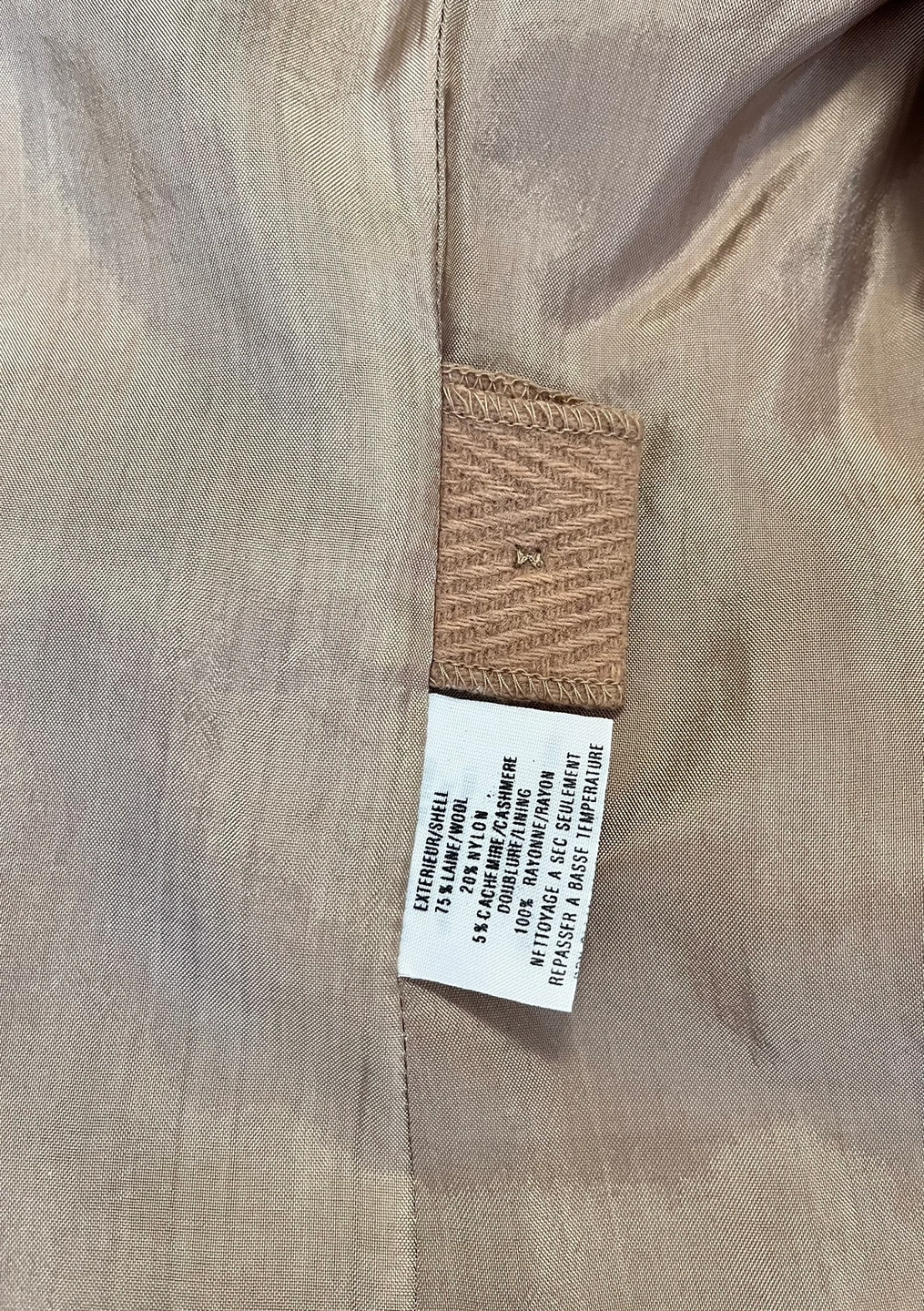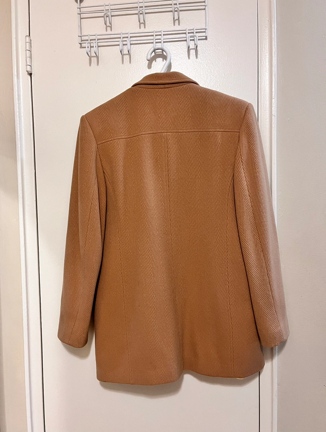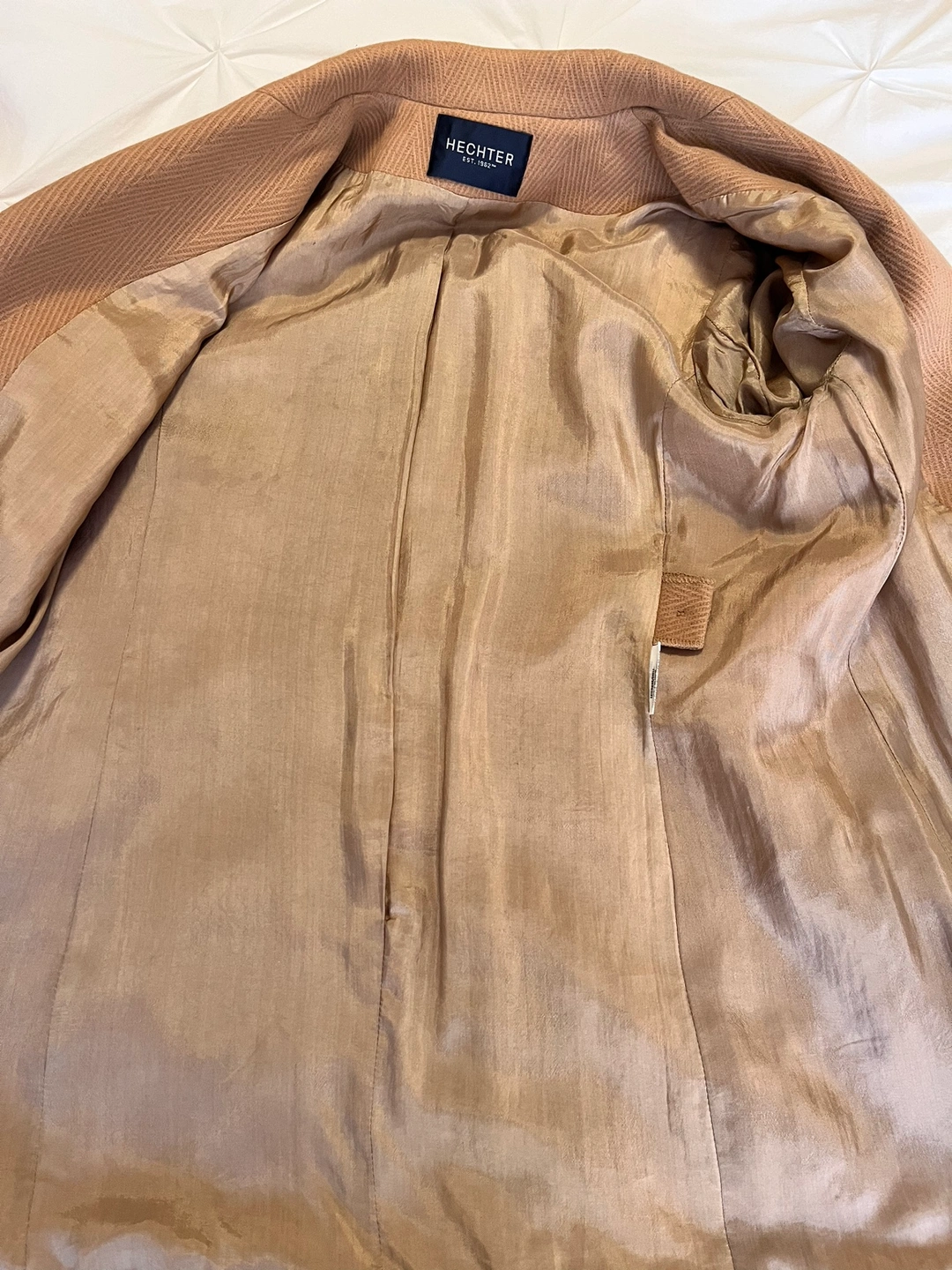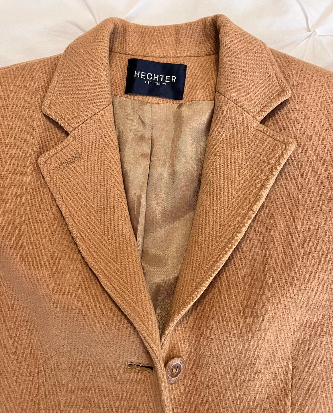 Classic with a herringbone pattern. It is fully lined and features a button -up closure at the front. There are two pockets The jacket is made of a 75%Wool 5%Cashmere 20%Nylon blend.