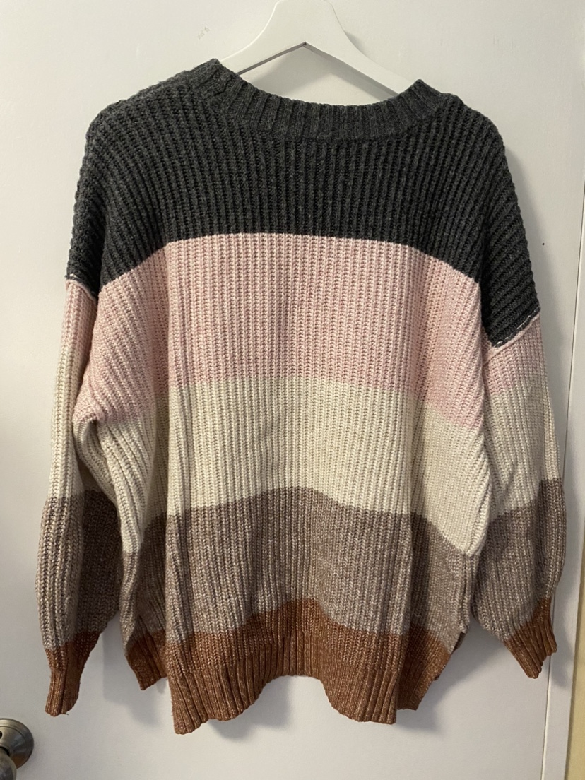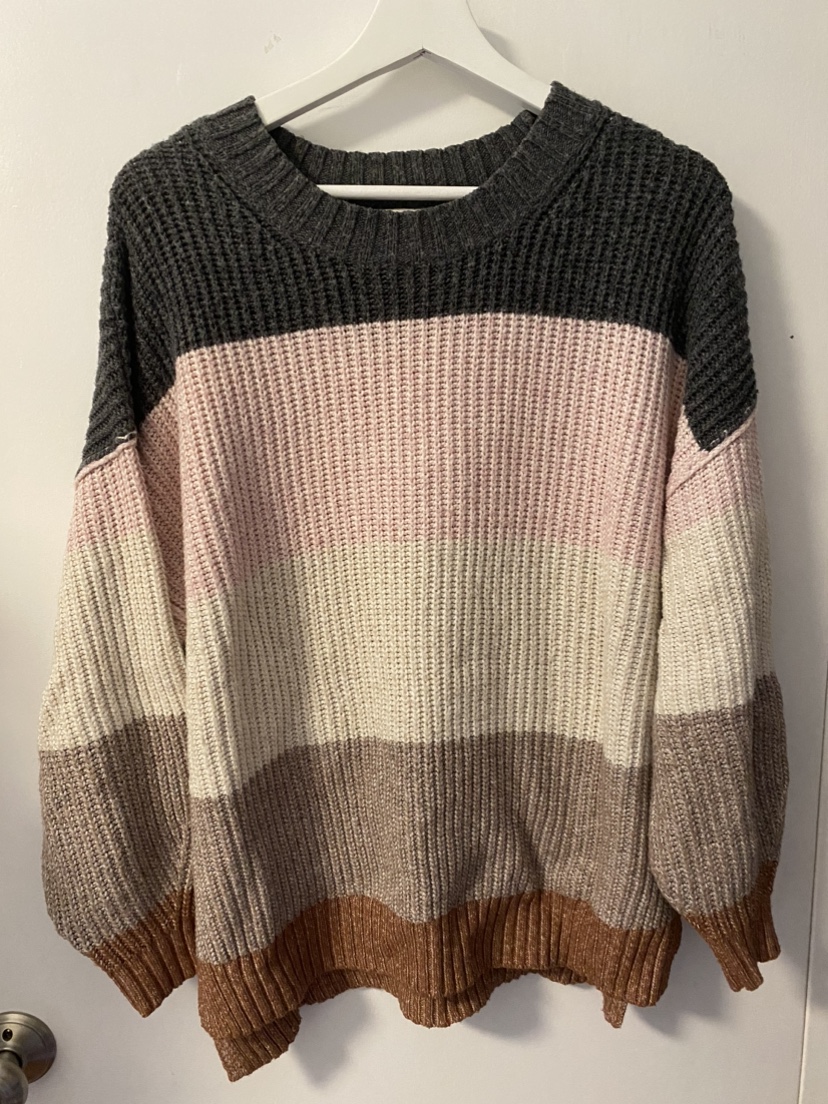 Striped sweater with a relaxed fit. It has a crew neck and a soft, cozy fabric. It is perfect for layering in the fall or winter.