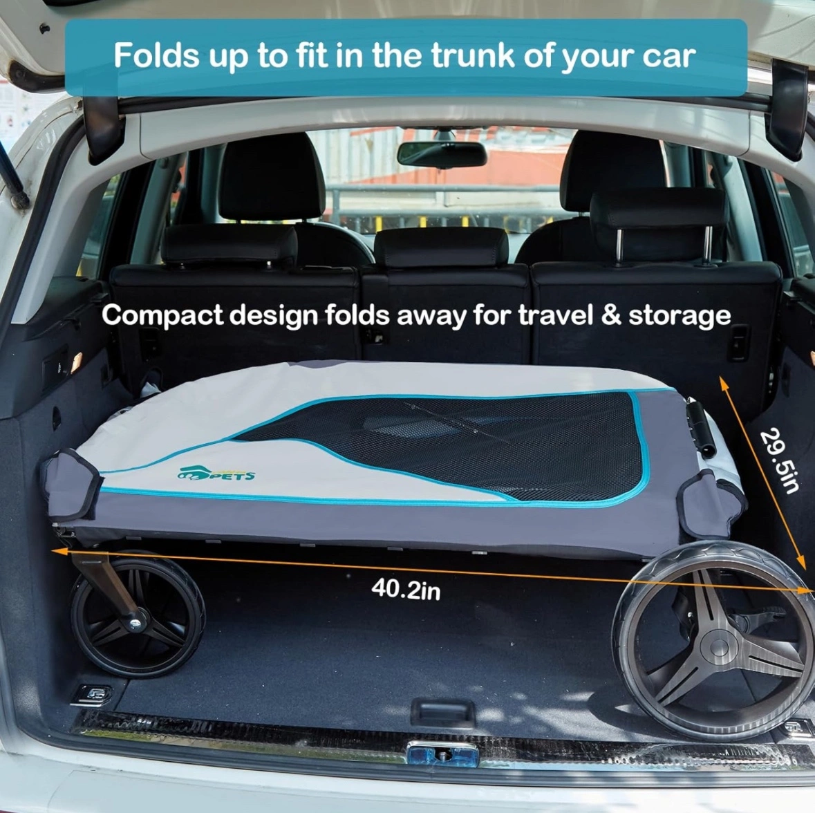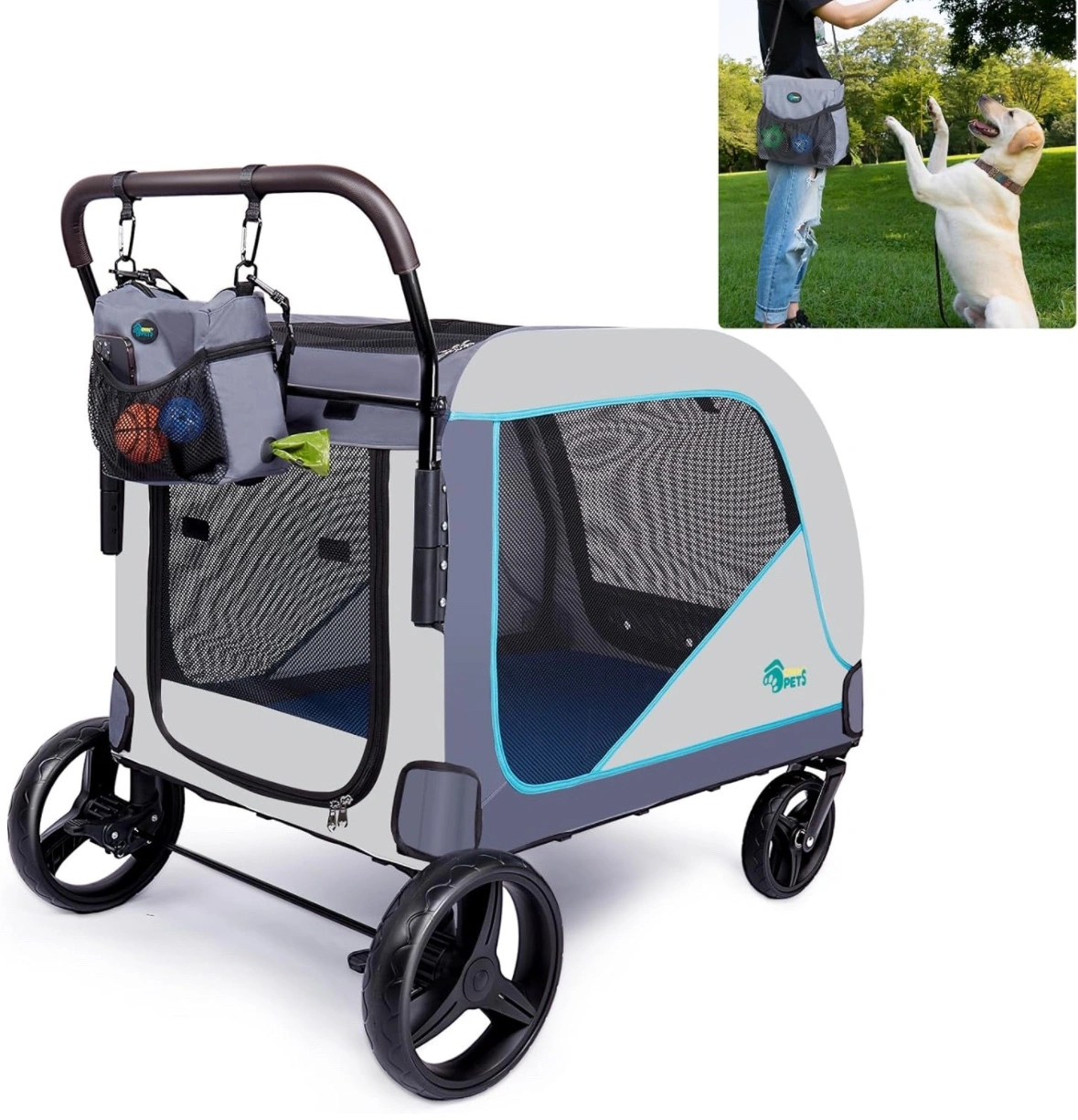 Extra large dog stroller with a compact design, perfect for travel and storage. It includes a storage bag, mesh windows, and a handle for easy transport. It is suitable for dogs and cats and can bear a weight of up to 80 kg.