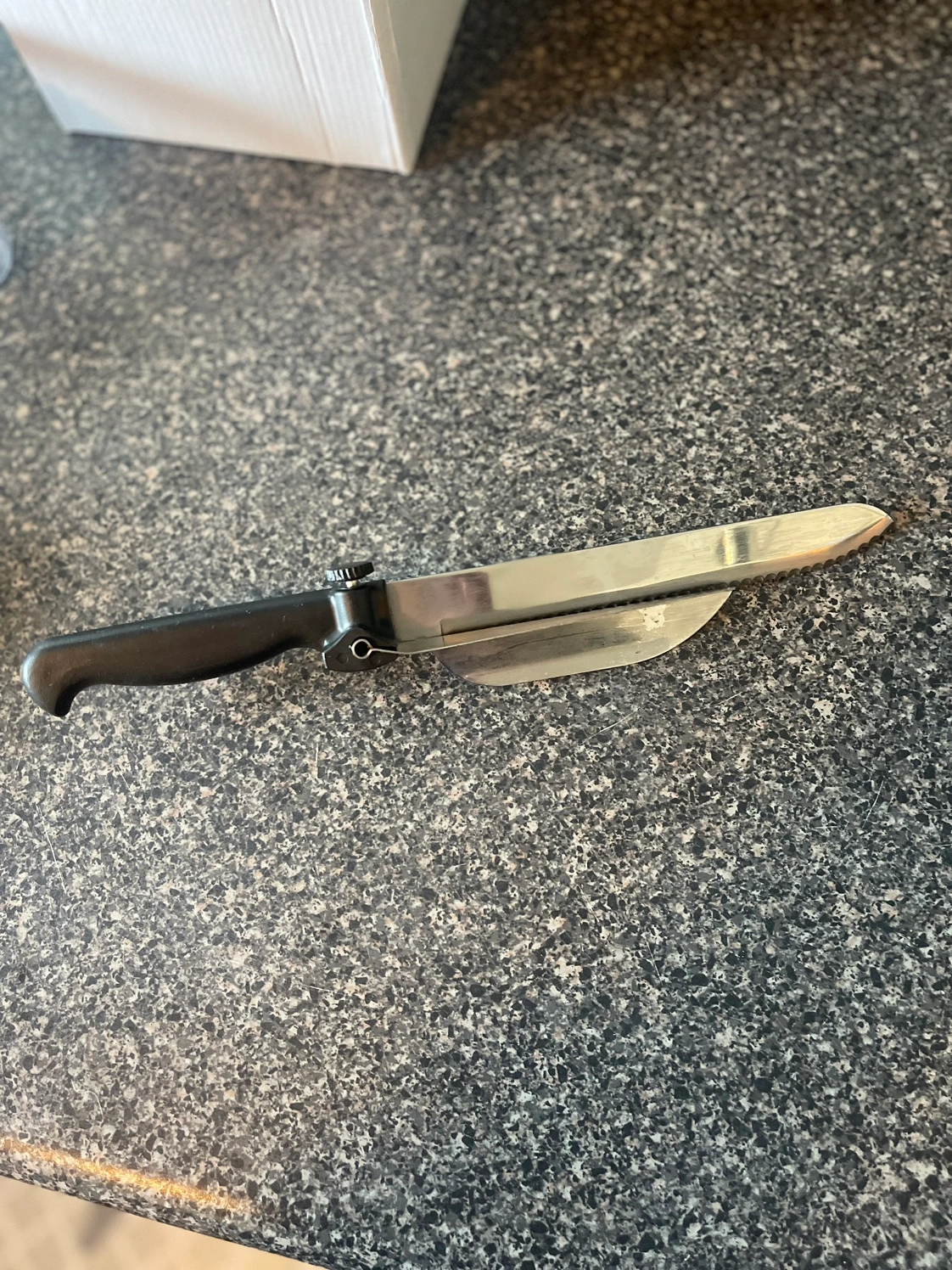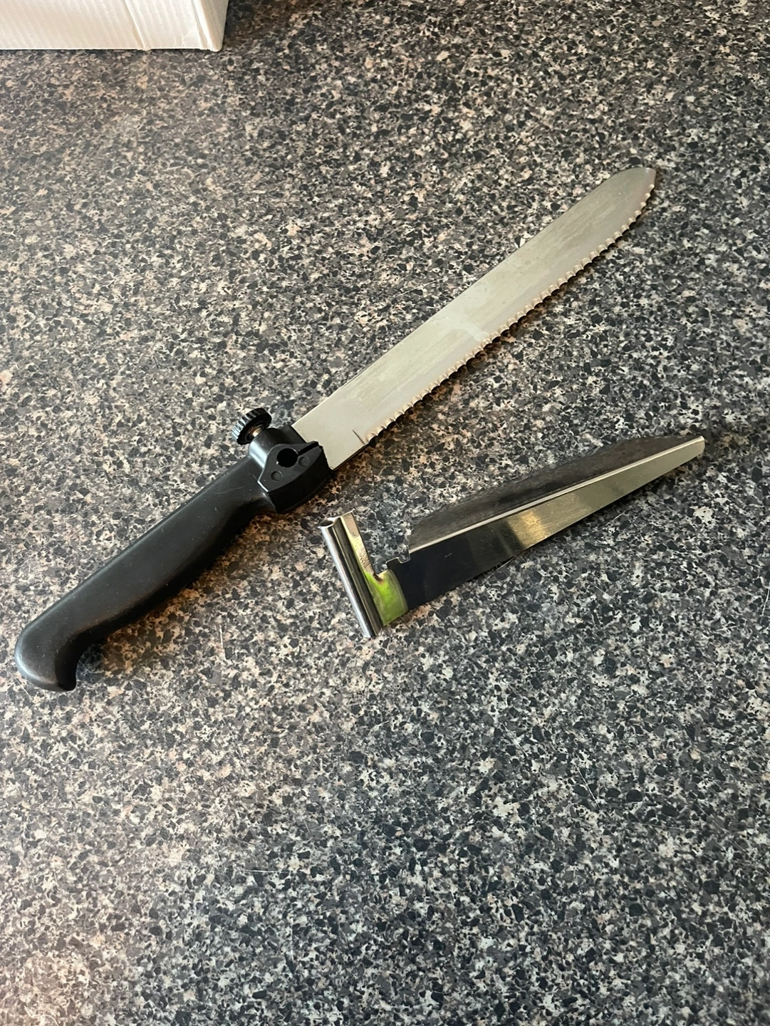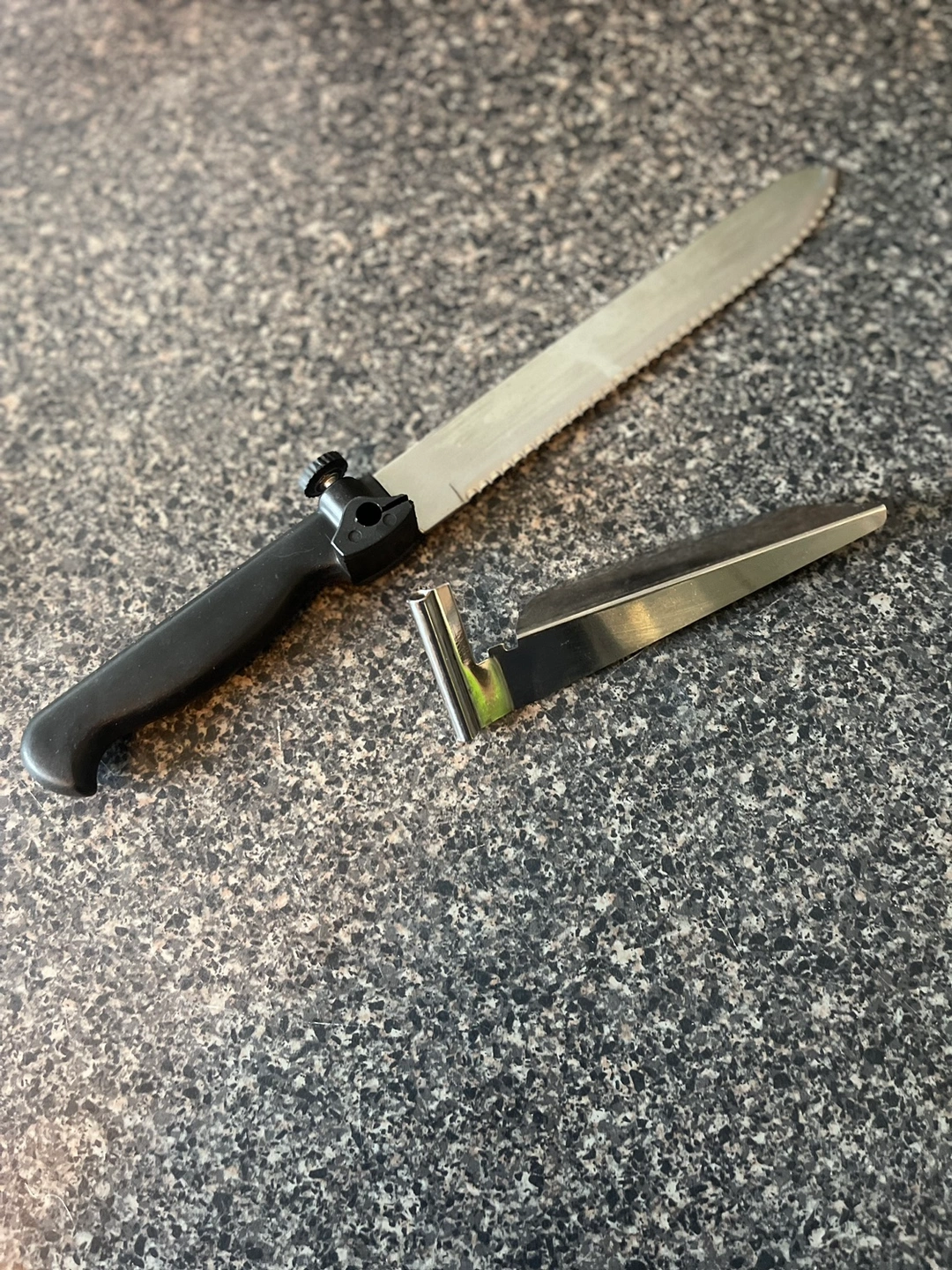 This knife is great for cutting and serving bread with a thickness guide to get uniform thickness slices of that homemade or unsliced loaf … or cutting loaf cakes …or meat loaf ….