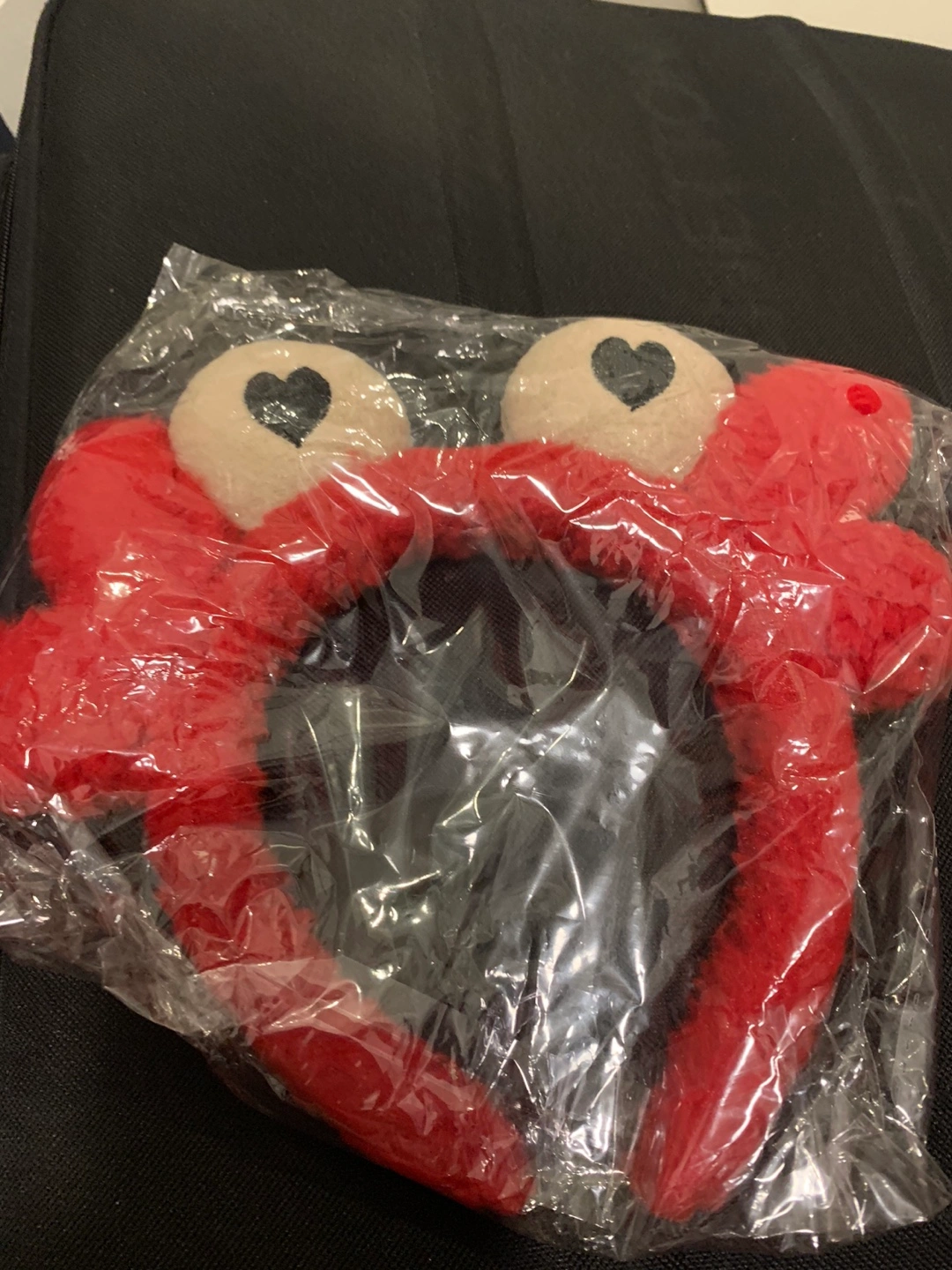 ✅ A red plush crab headband with two white eyes and black hearts. The headband is packaged in a clear plastic bag.