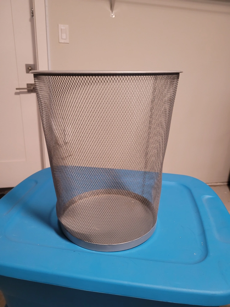 Silver wire trash can with a metal rim. The top of the can is 9.5 inches wide and the can is 13.5 inches tall. It has a metal rim at the top. It is a great addition to a desk or office.
