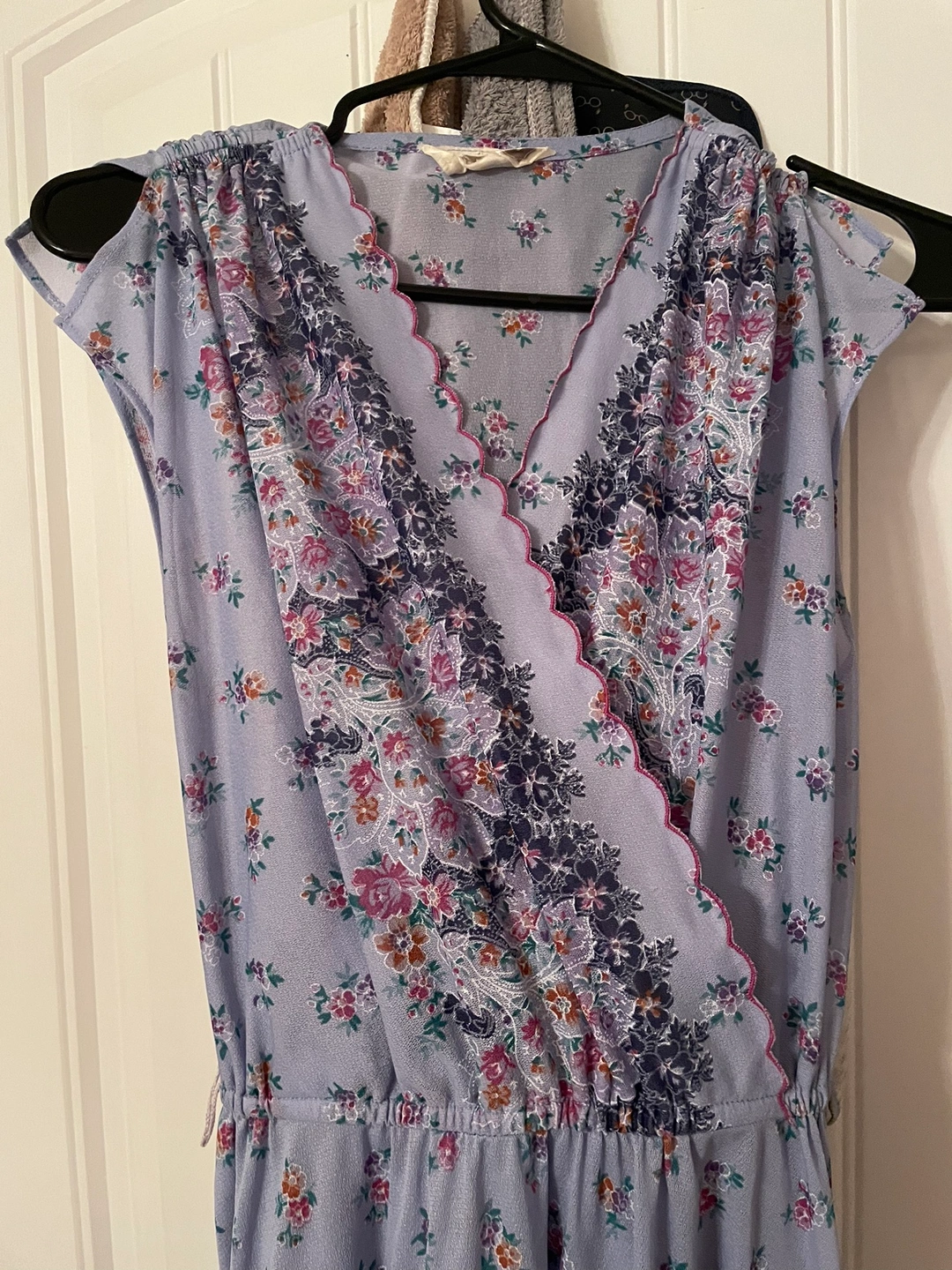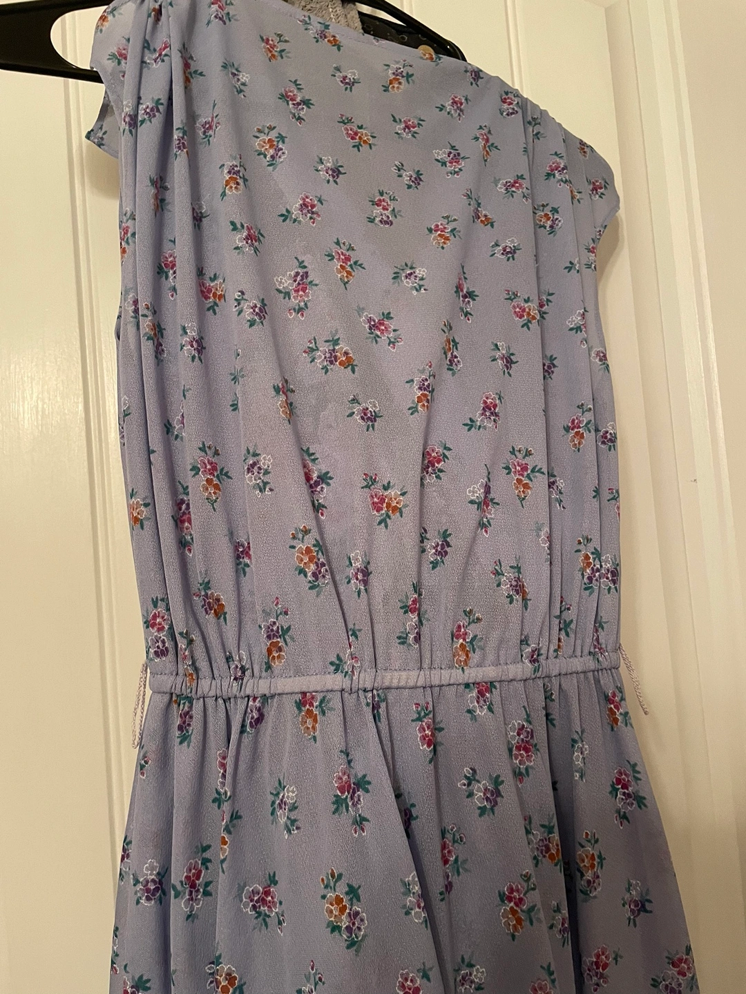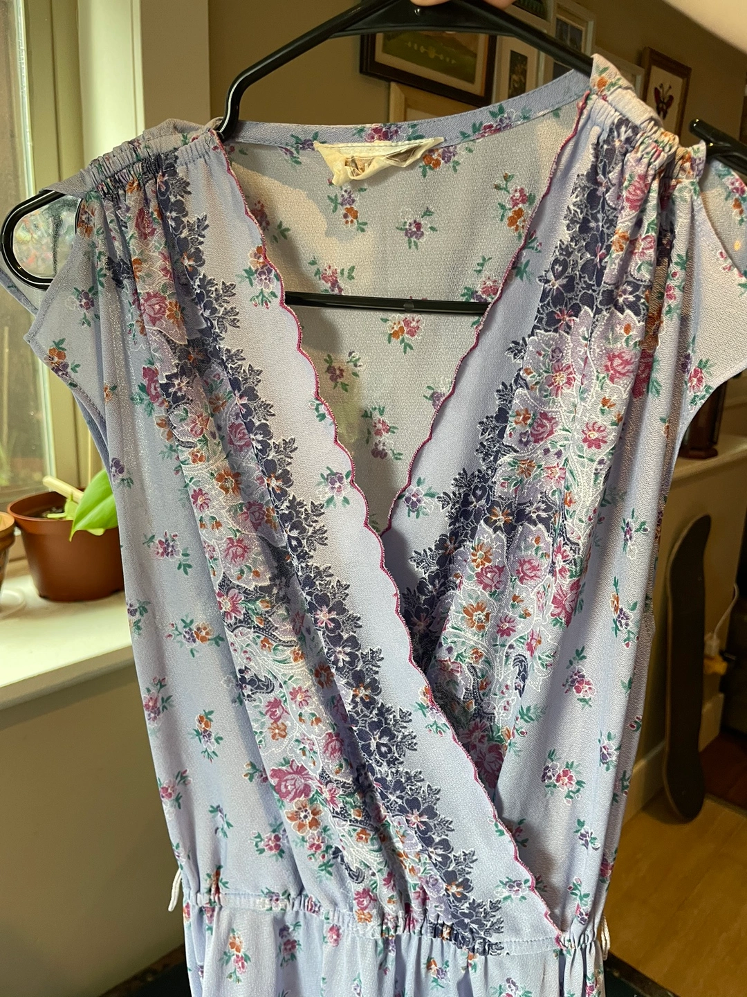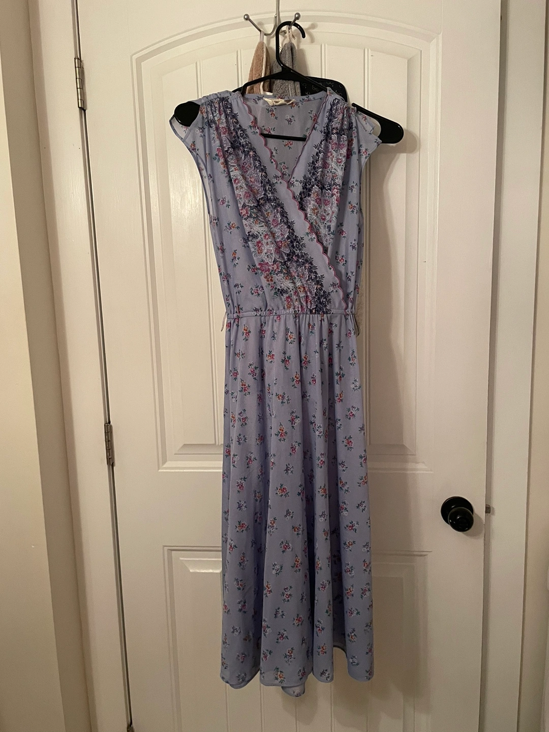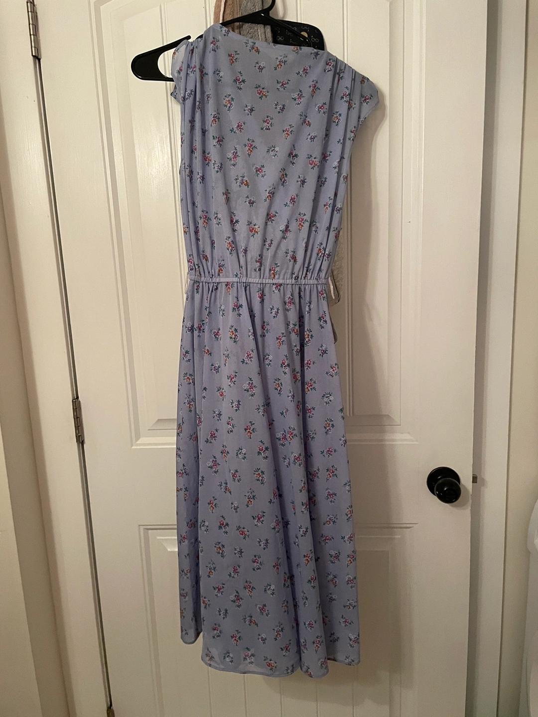 55This dress is blue with a floral pattern and features a wrap bodice and an elastic waist. It has a V-neckline and cap sleeves. The fabric is lightweight and flowy, making it perfect for warm weather.