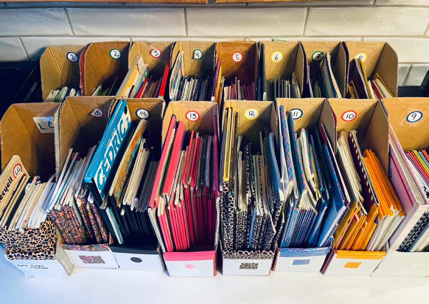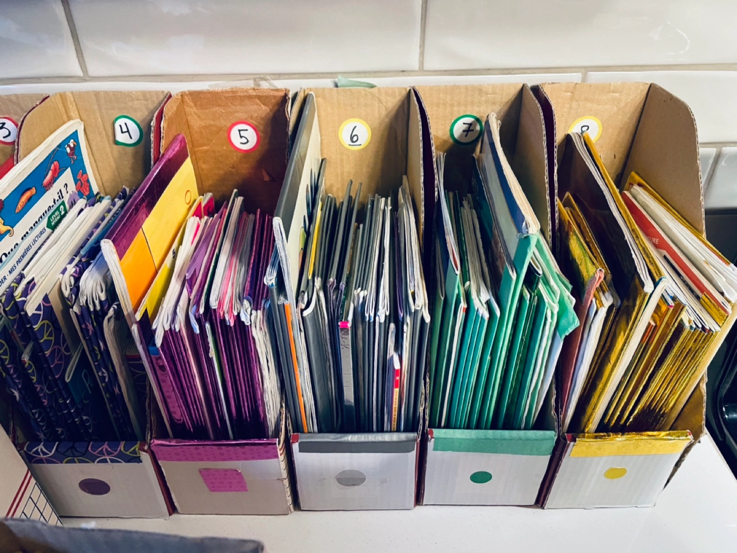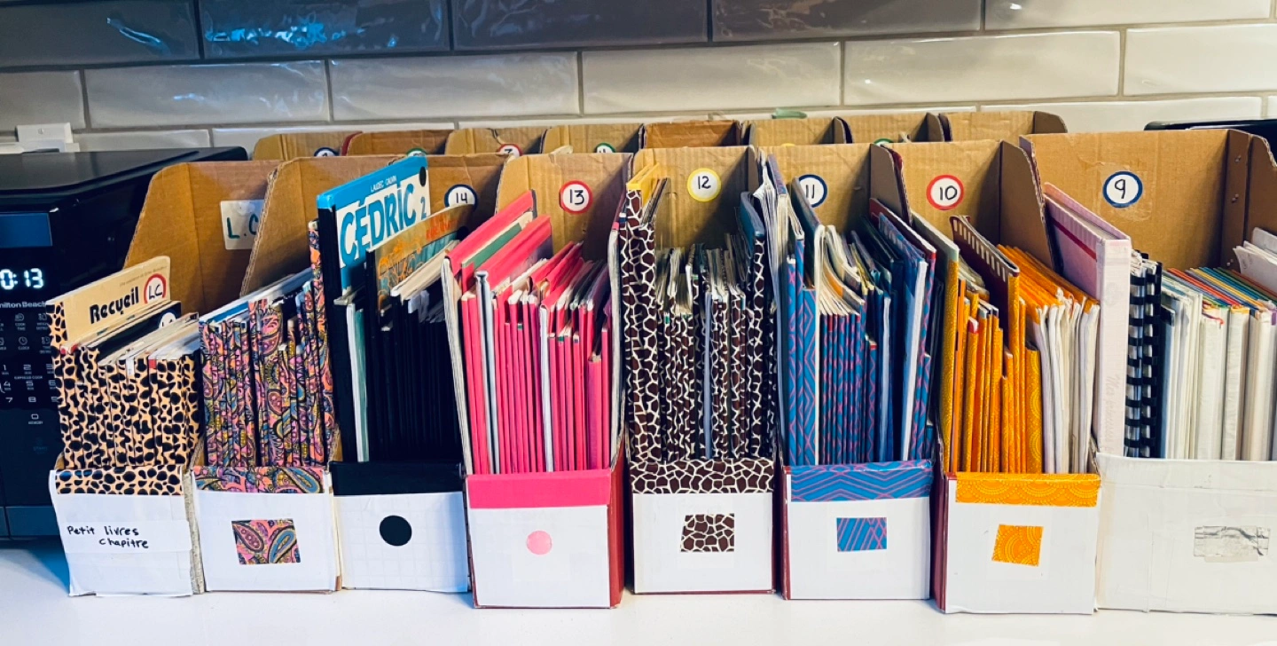 16 boxes of different level reading French books.
