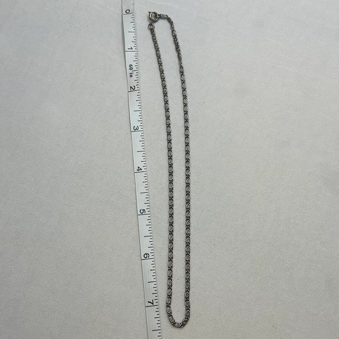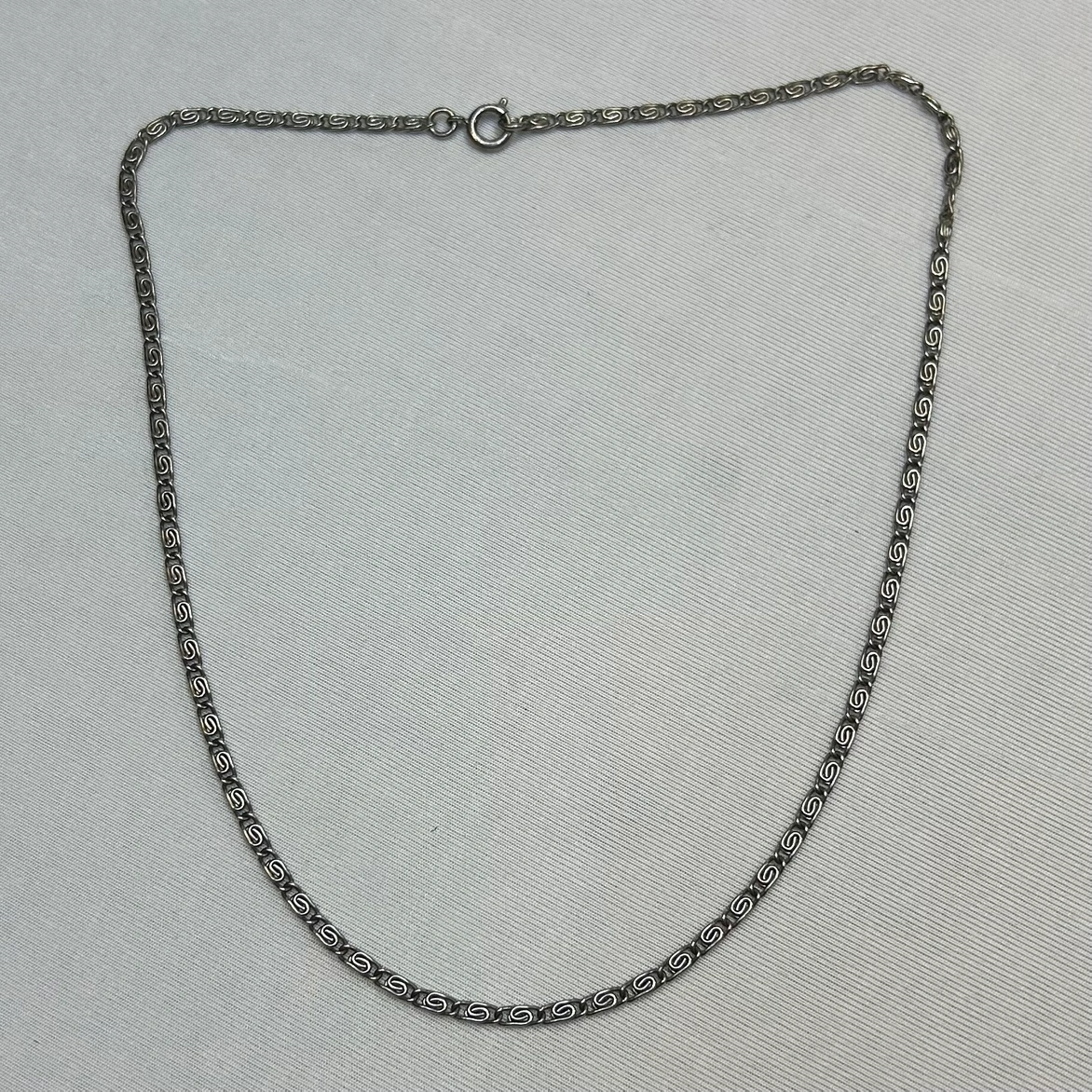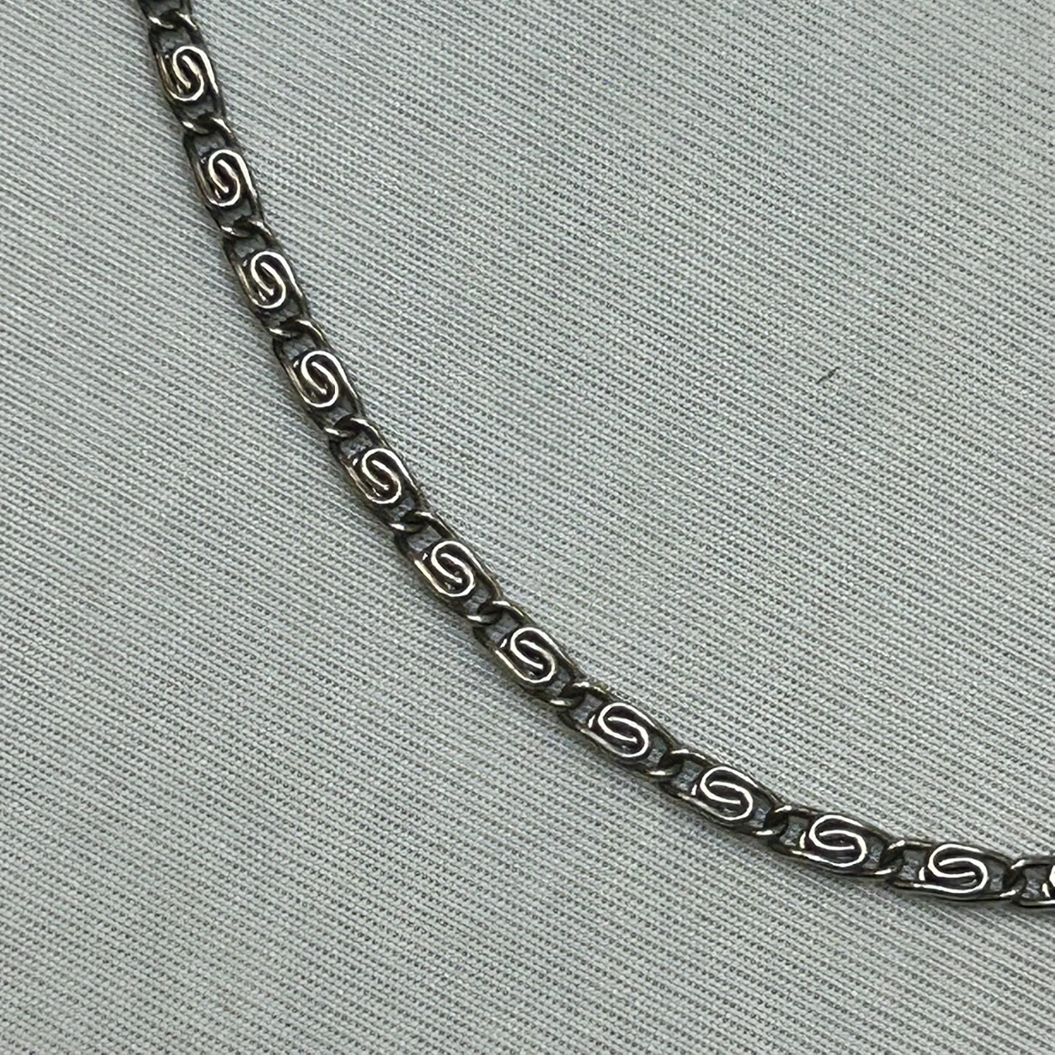 Exquisite silver-toned chain necklace from the 1970s featuring an intricate scroll design that exudes elegance with each link. The continuous spiral pattern provides a timeless appeal, perfect for adding a touch of sophistication to any attire. Its versatile style makes it an ideal accessory for both formal events and everyday wear. See photos for measurements. Cross posted.