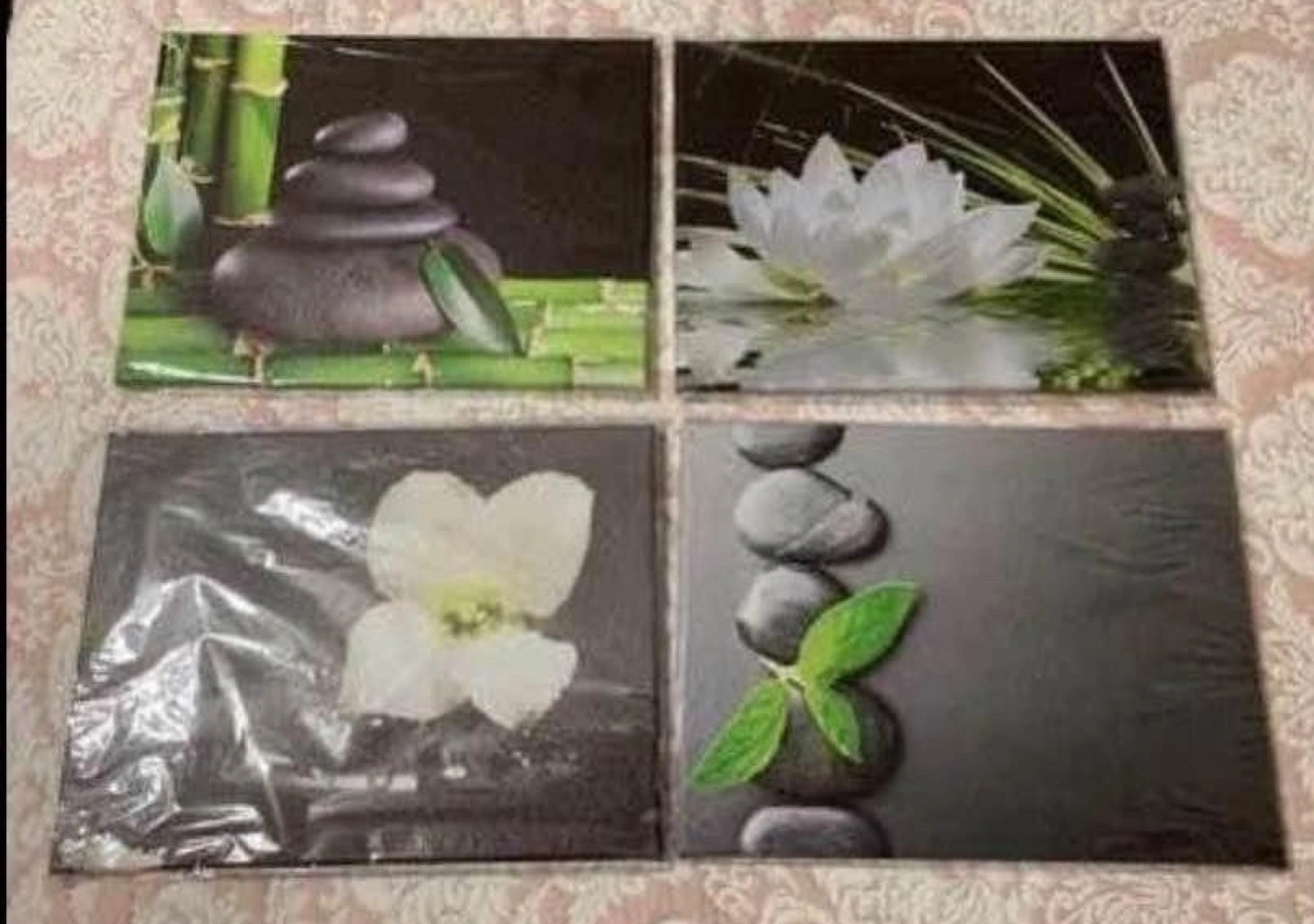 Four rectangular canvas wall art prints featuring zen themes of stones, flowers and bamboo.