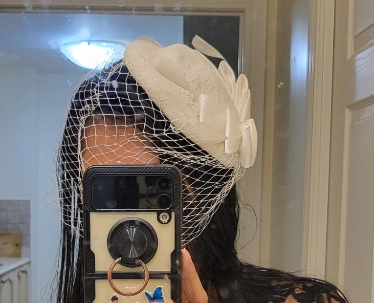 A white pillbox hat with a veil. The hat has a lace base with a large satin bow. It has two clips on the inside to help it stay in place.