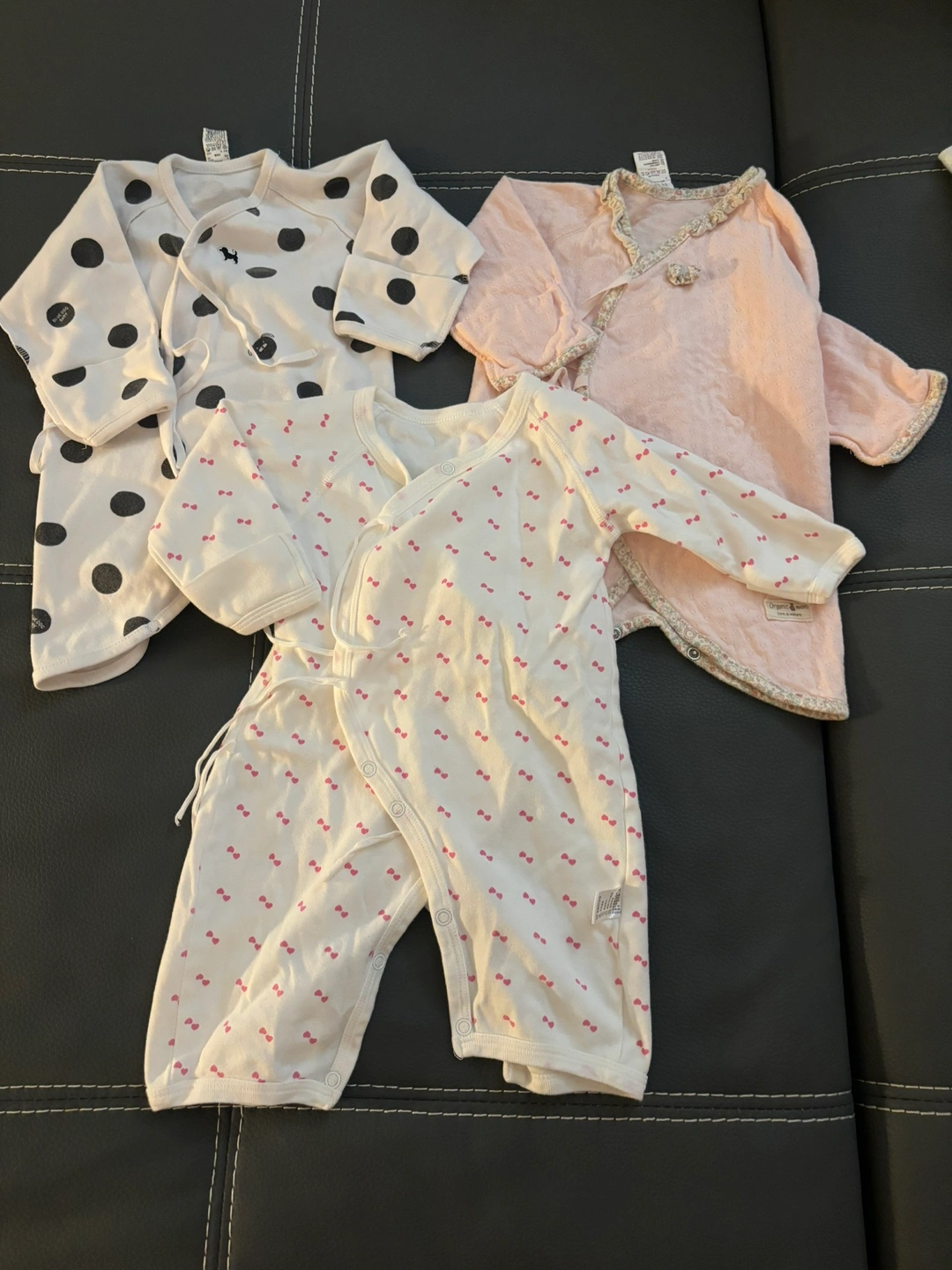 Five pieces of baby clothes, sizes newborn and 0-3 months.