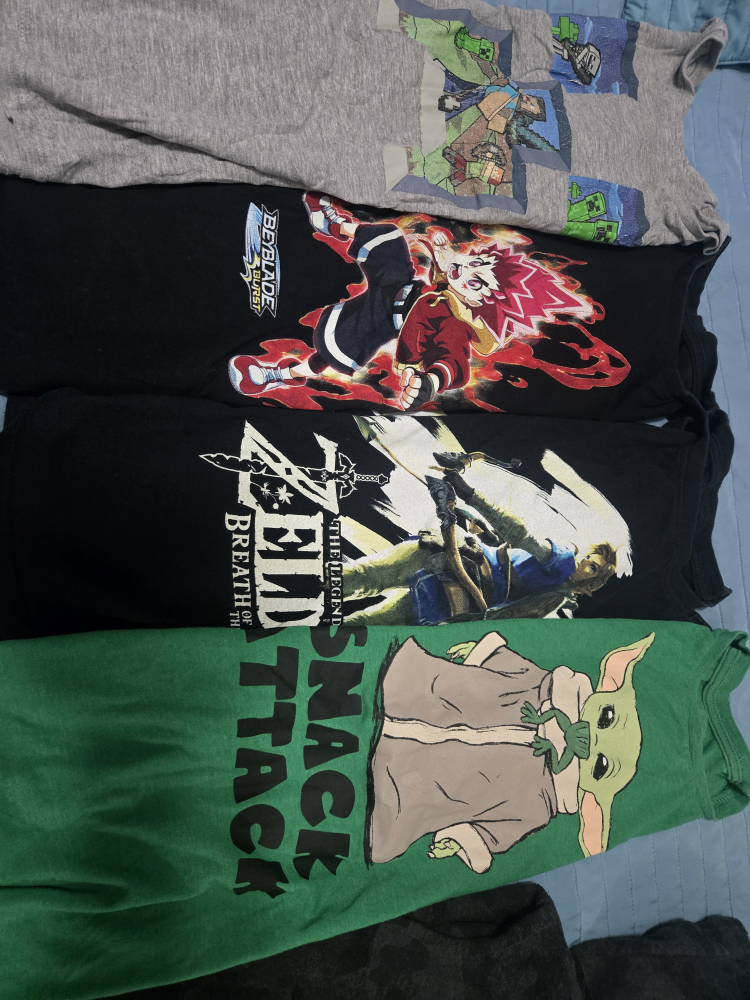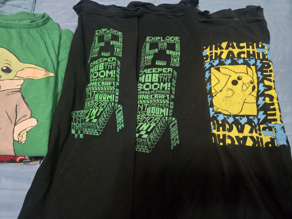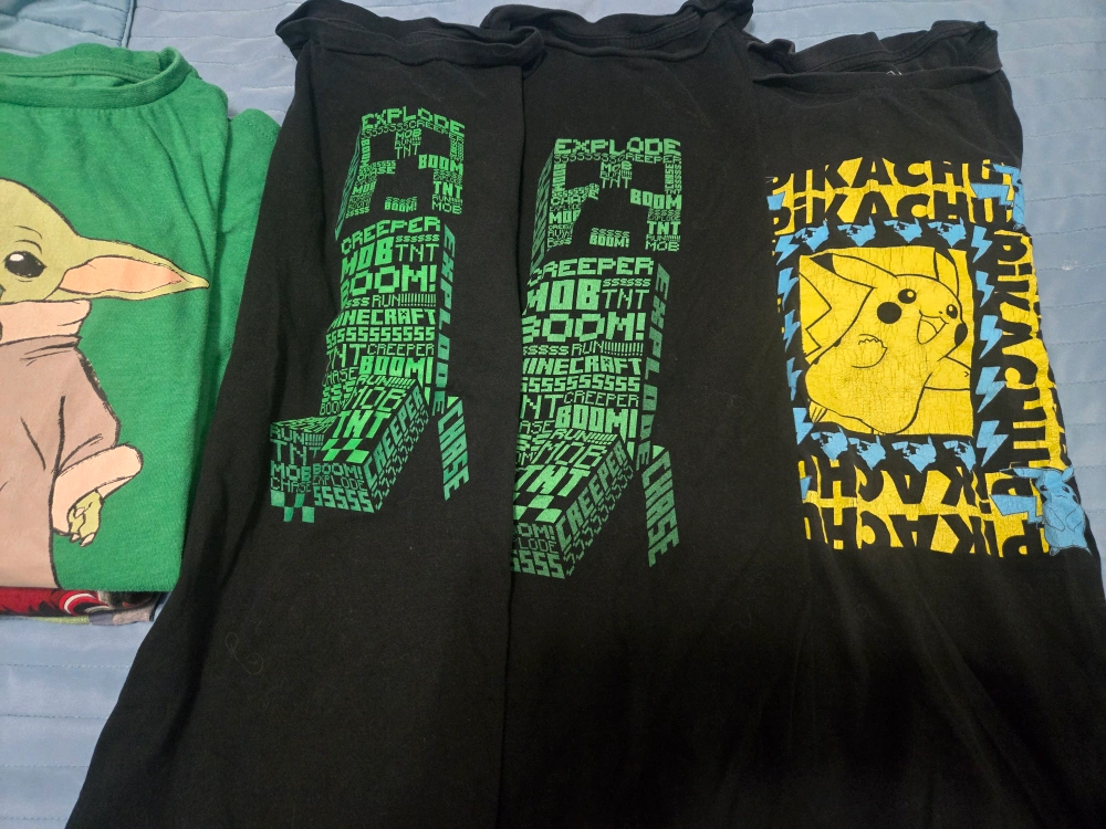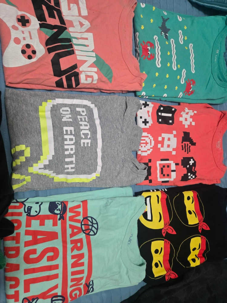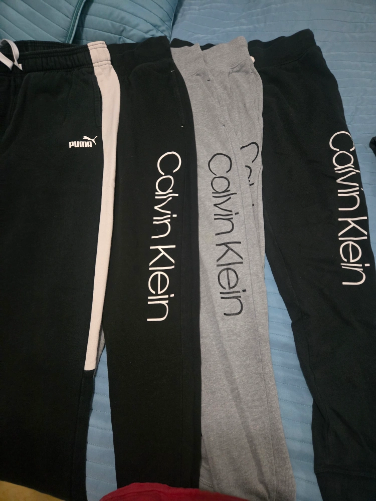Bundle of shirts and sweatpants, includes various sizes and brands.