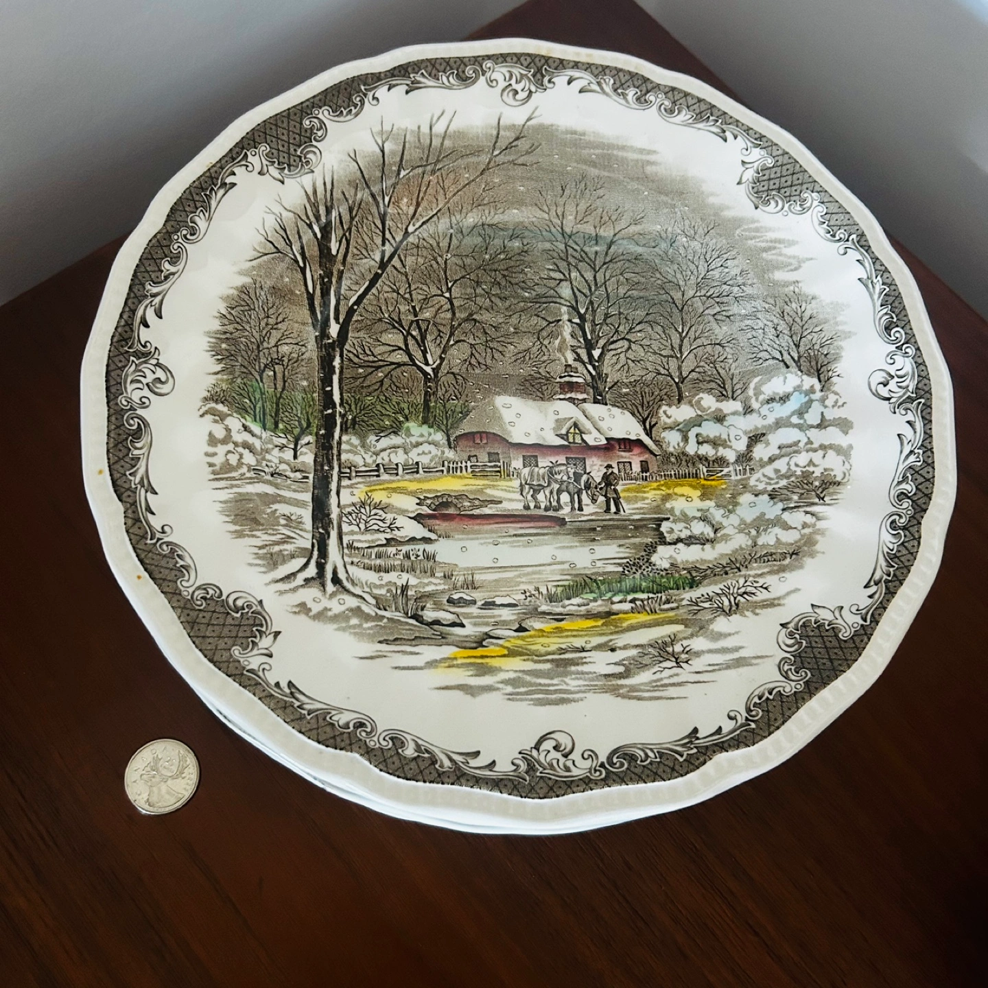 Set of 7 Kensington Ironstone dinner plates featuring the Shakespeare's Sonnets pattern. Made of Ironstone in England. Each plate measures approximately 10" in diameter. 13.50 each.