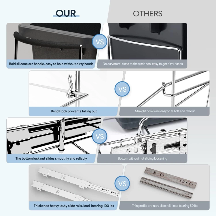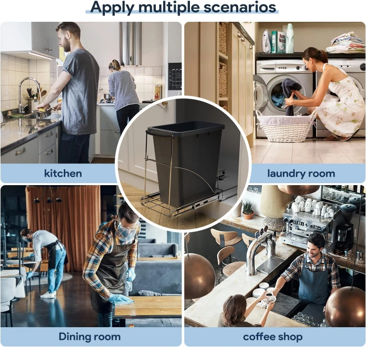 A pull-out trash can organizer for your kitchen. It features a slide-out tray that makes it easy to access your trash.