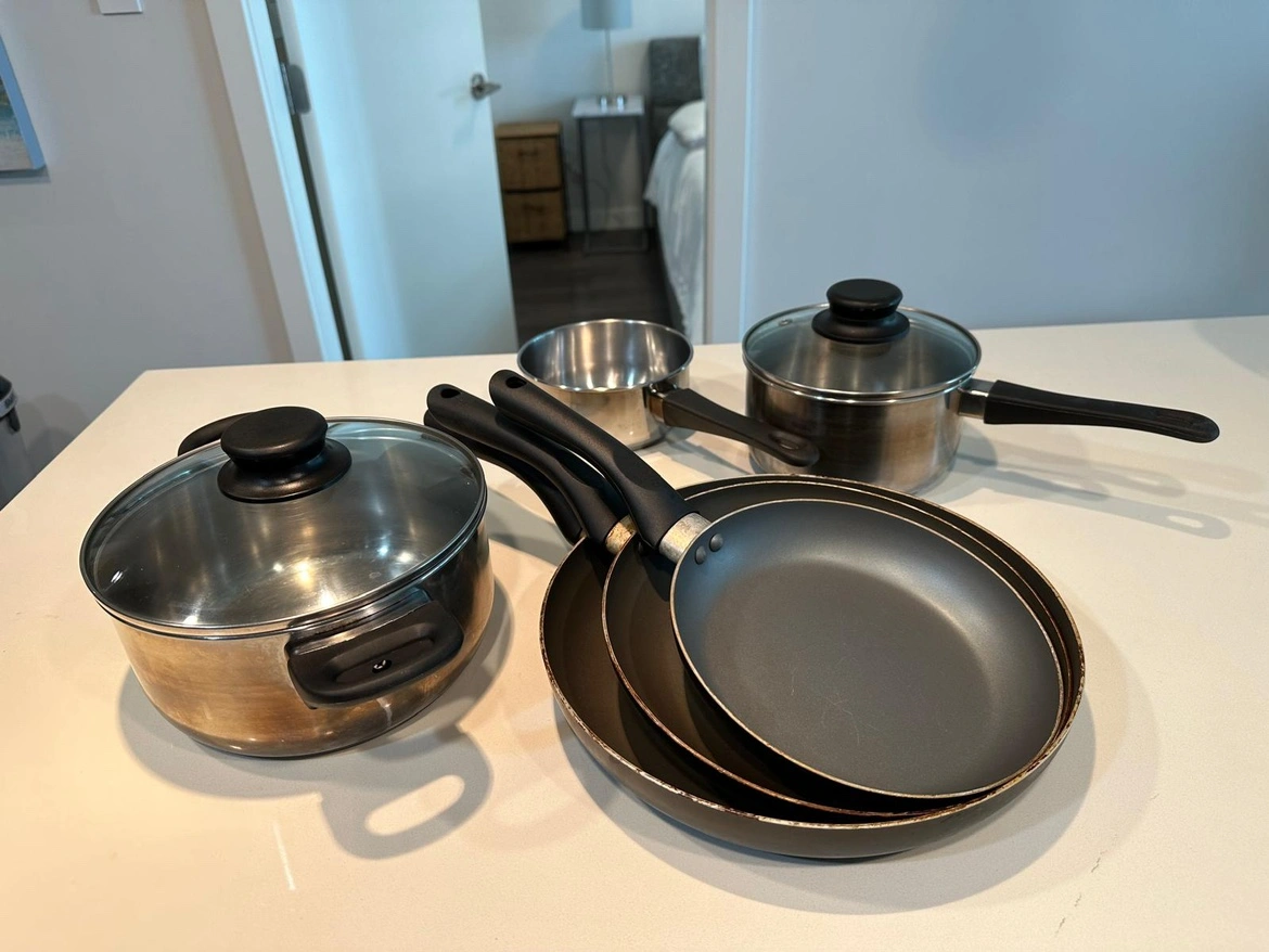 Set of cookware, includes pots, pans, and a wok. Good for a small kitchen or for a student.