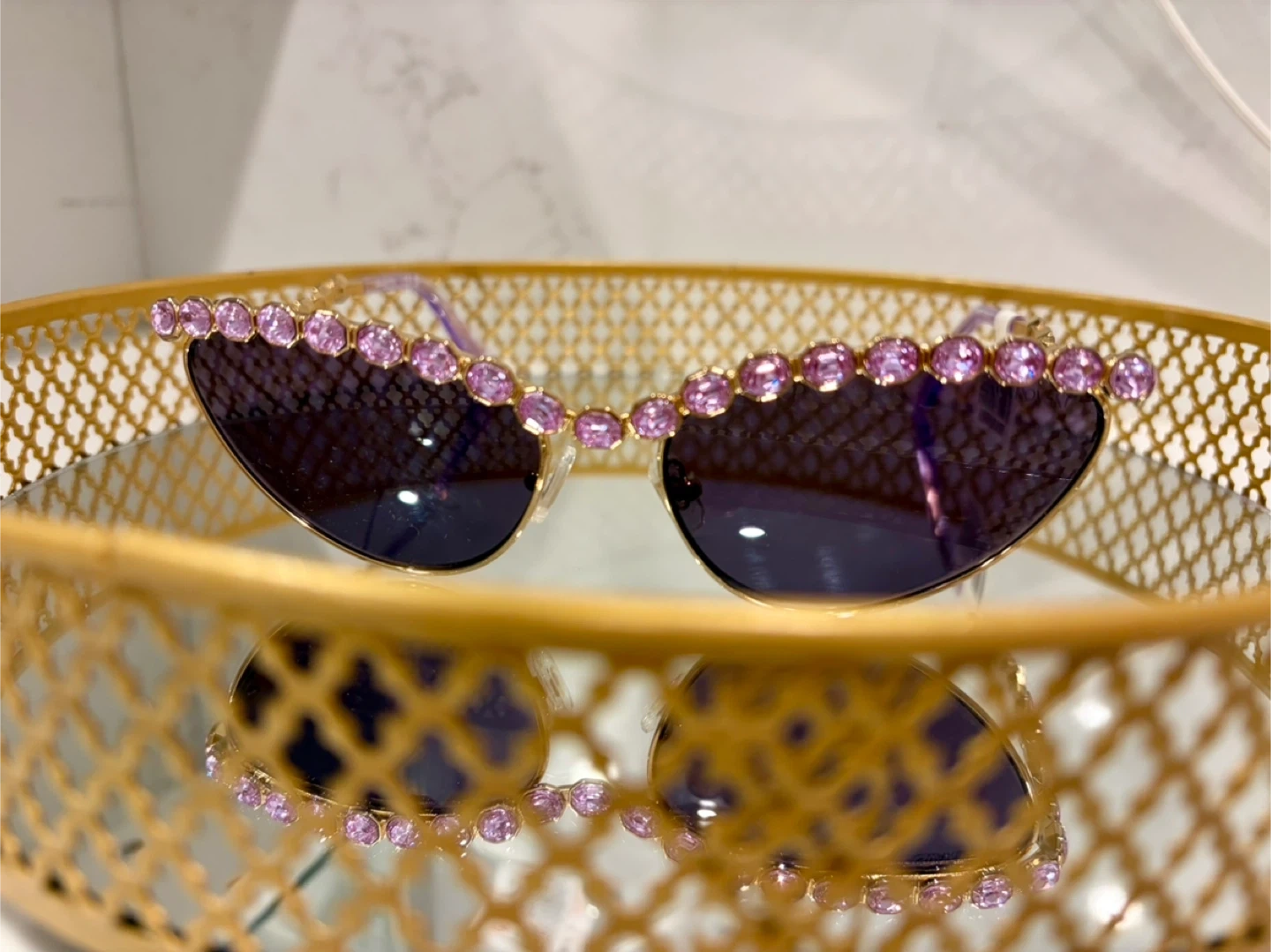 Gorgeous Swarovski sunglasses with a gold shimmer finish. These shades are adorned with sparkling pink crystals along the top and temples. They offer a stylish and eye-catching look for sunny days!