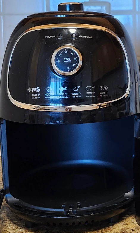 Small air fryer is in good condition. It comes with its original box. It has been cleaned throughly and is ready to use. It is a 2 quart air fryer that uses very little oil. Easy to clean.