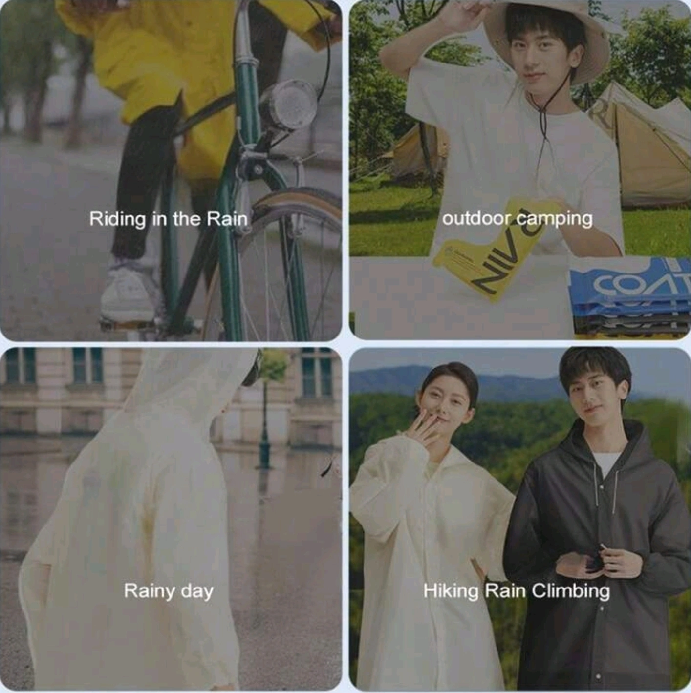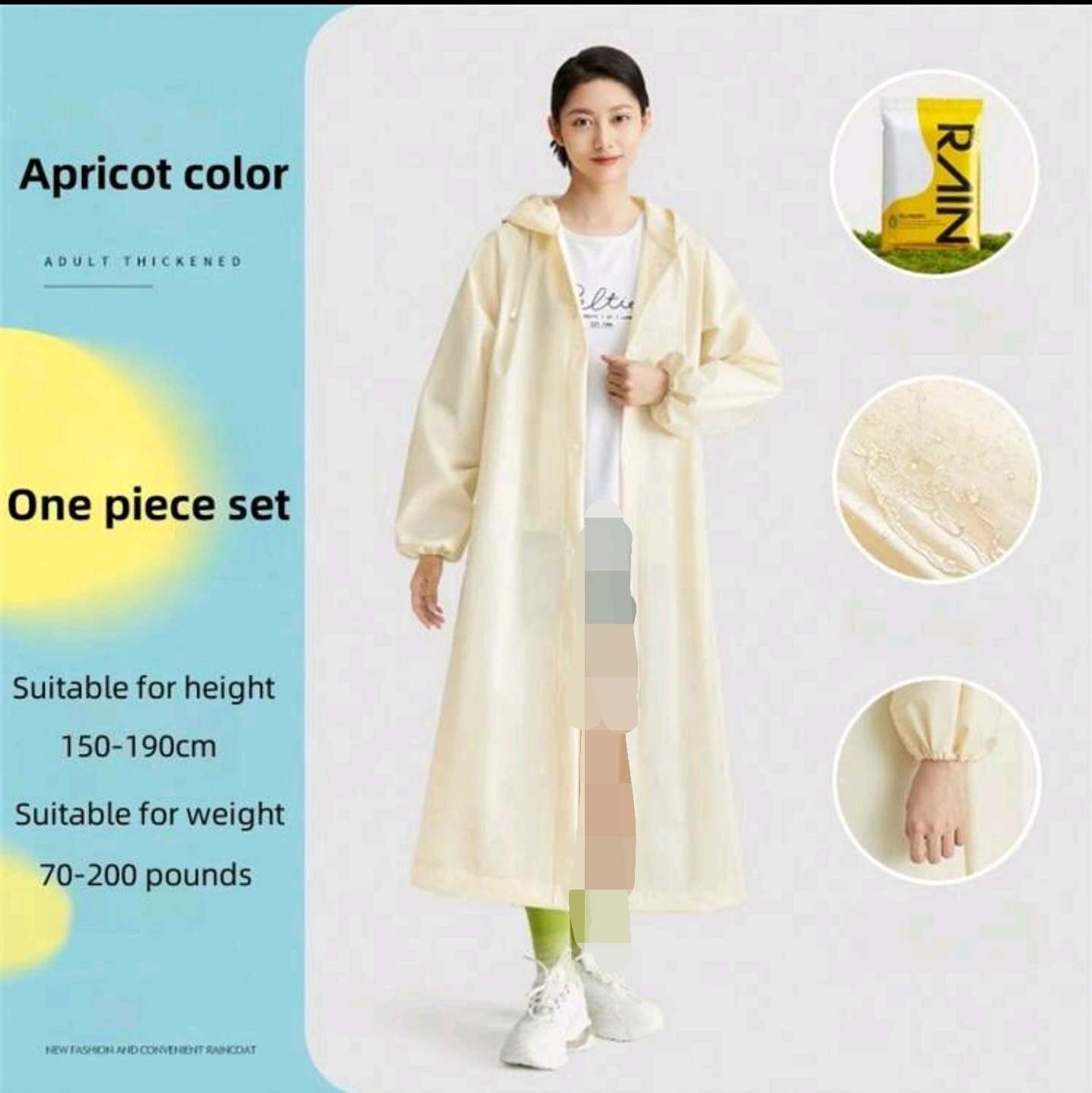 A one-piece raincoat for adults. It is suitable for various activities including riding a bike, hiking, and camping. It is made of a durable and waterproof fabric. It is available in apricot colour. It is packaged in a reusable pouch.