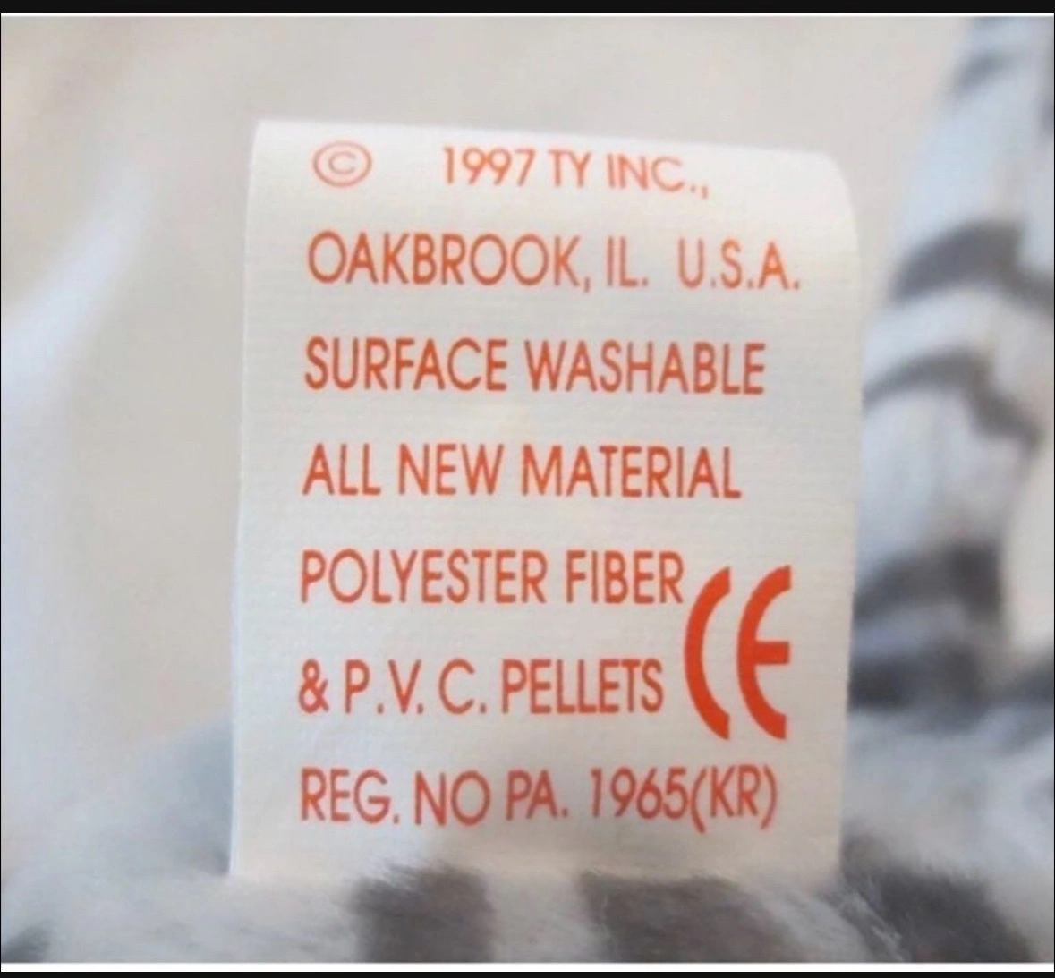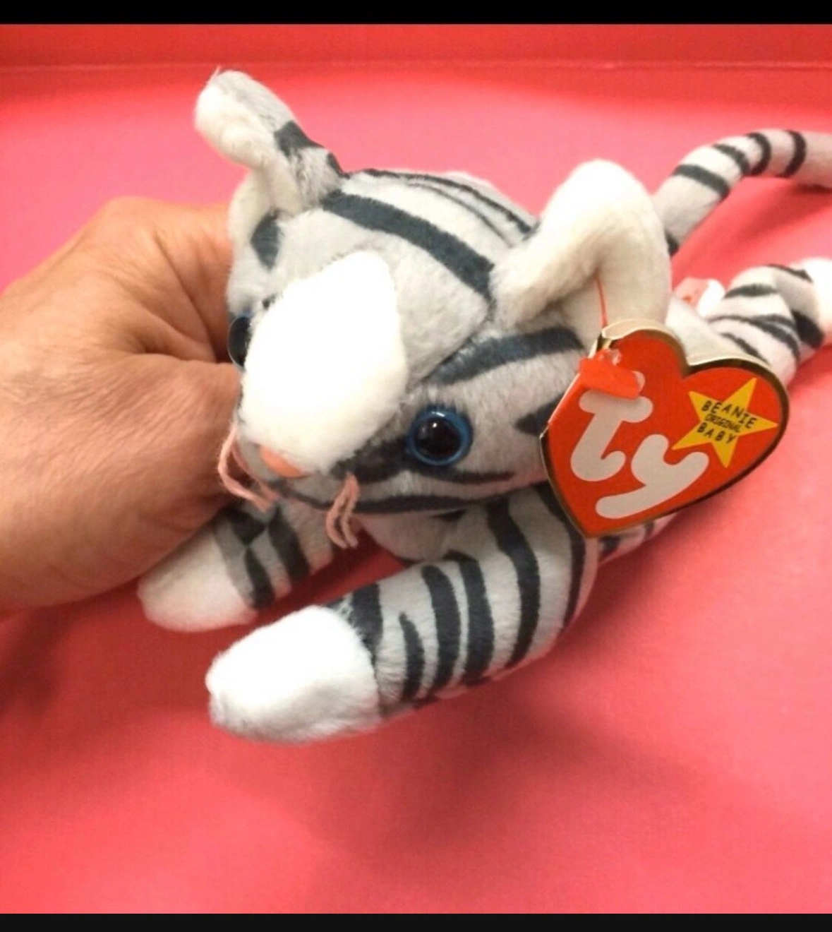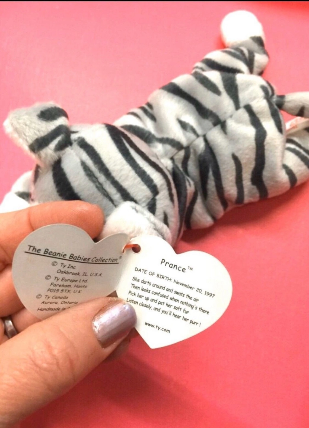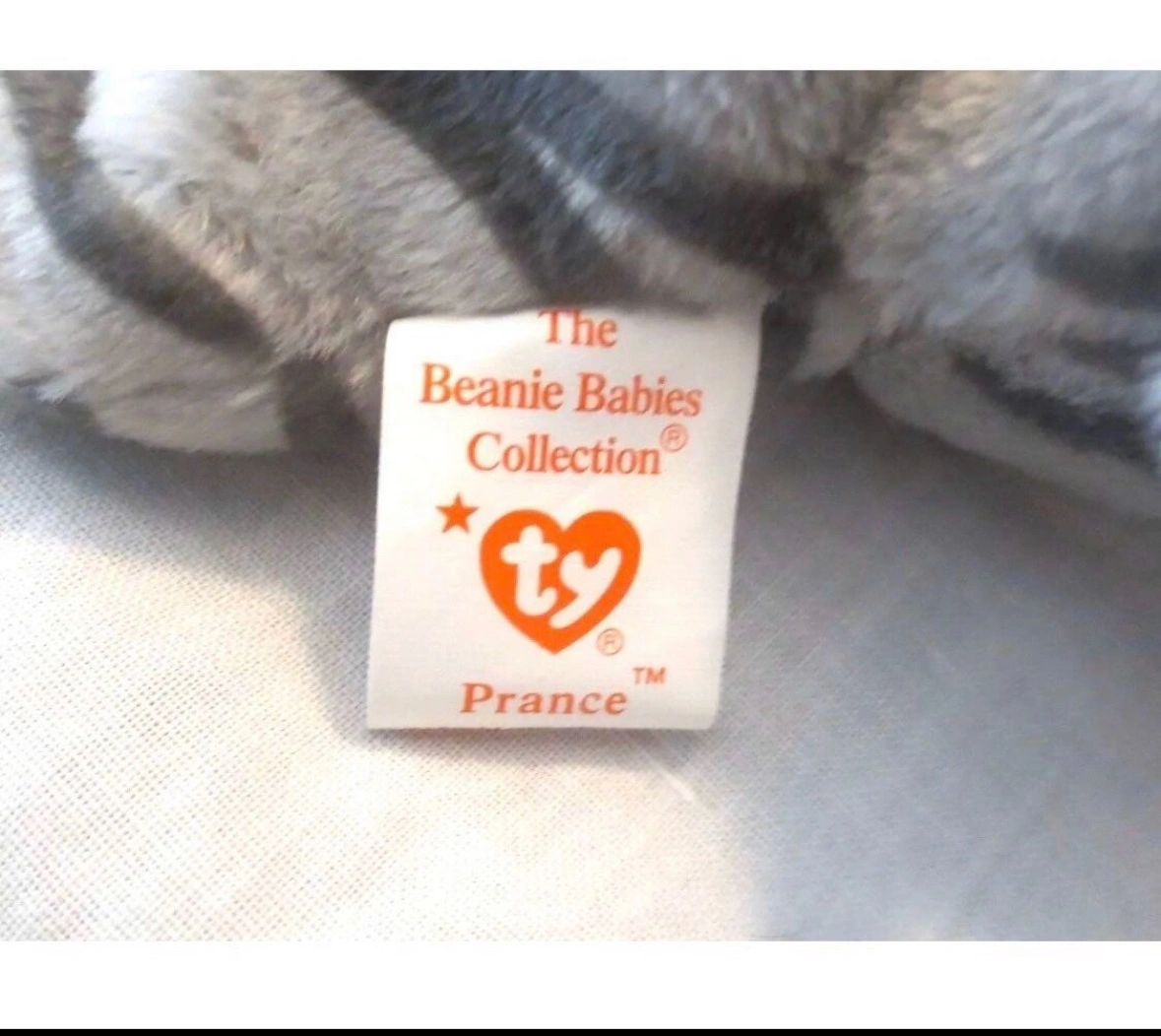 Prance the cat is a gray and white striped beanie baby. He is a 1997 retired beanie baby. Prance is approximately 6 inches tall. He has a white face and paws. He has a black nose and blue eyes. Prance has the original TY tag attached.