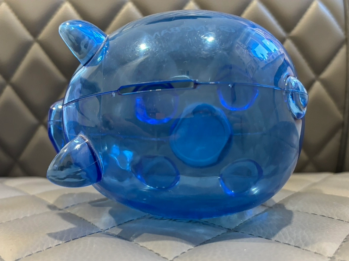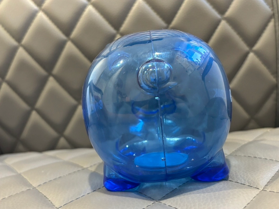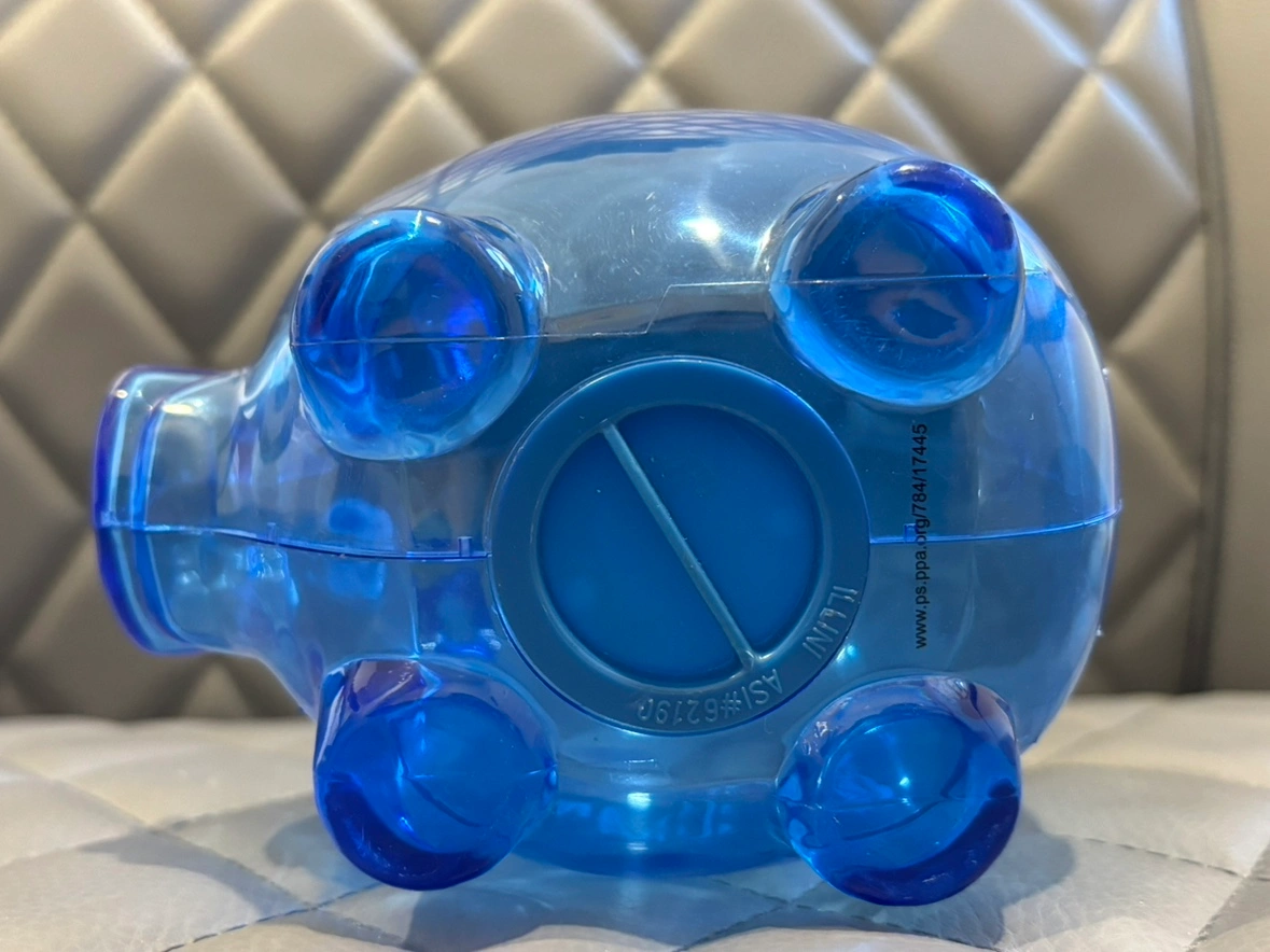 Clear blue piggy bank with a white PNC Bank logo. It has a slot on the top to insert coins and a stopper on the bottom to remove them. It stands about 5 inches tall.