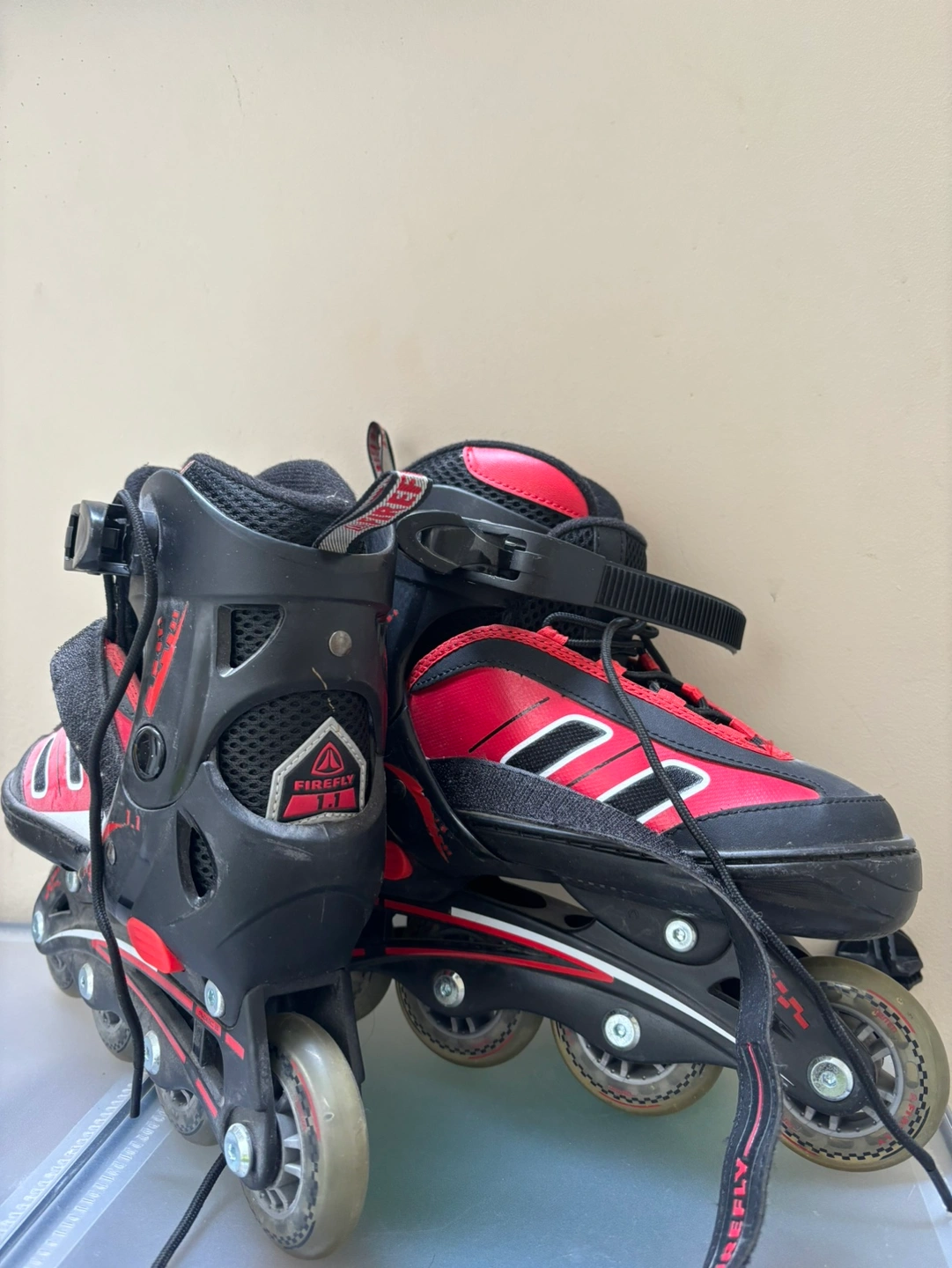 Red and black inline skates with Firefly branding. They have a lace up closure and a buckle at the ankle. These are great for beginners and intermediate skaters.