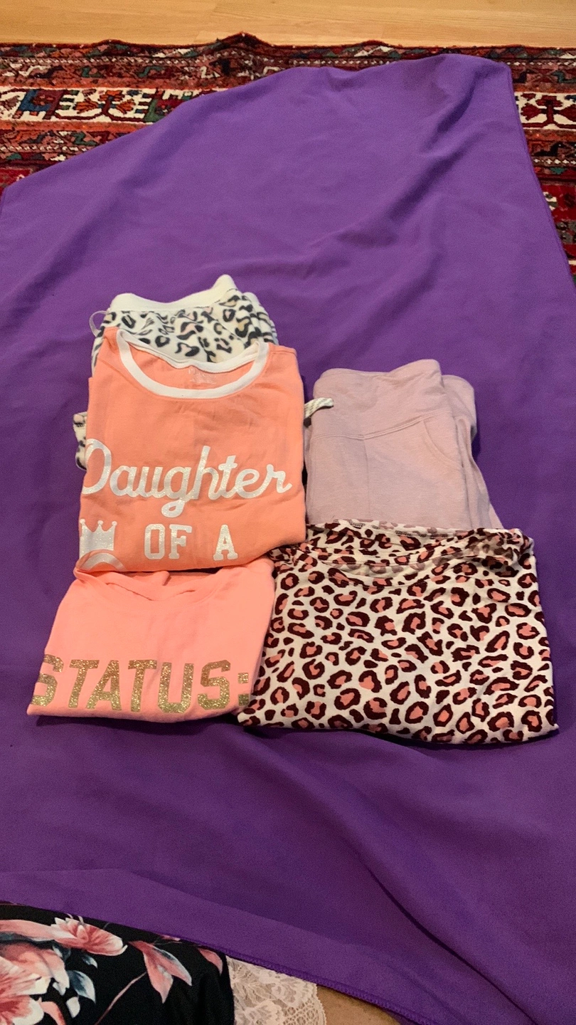 Bundle of girls' clothes. Includes two Tshirts, two pants, and a long sleeve shirt with leopard print.