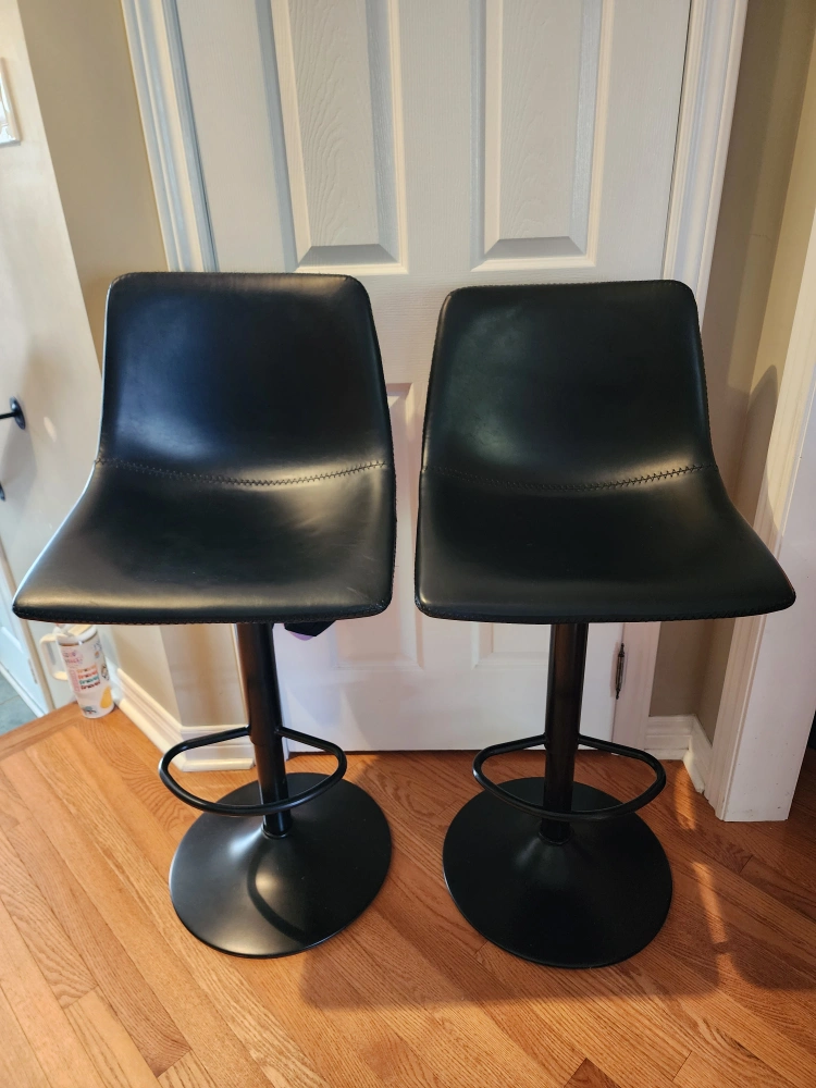 Two comfortable black swivel bar stools with adjustable height and a foot rest in mint condition. Original price was $90 + tax per stool. Selling at $20 each.