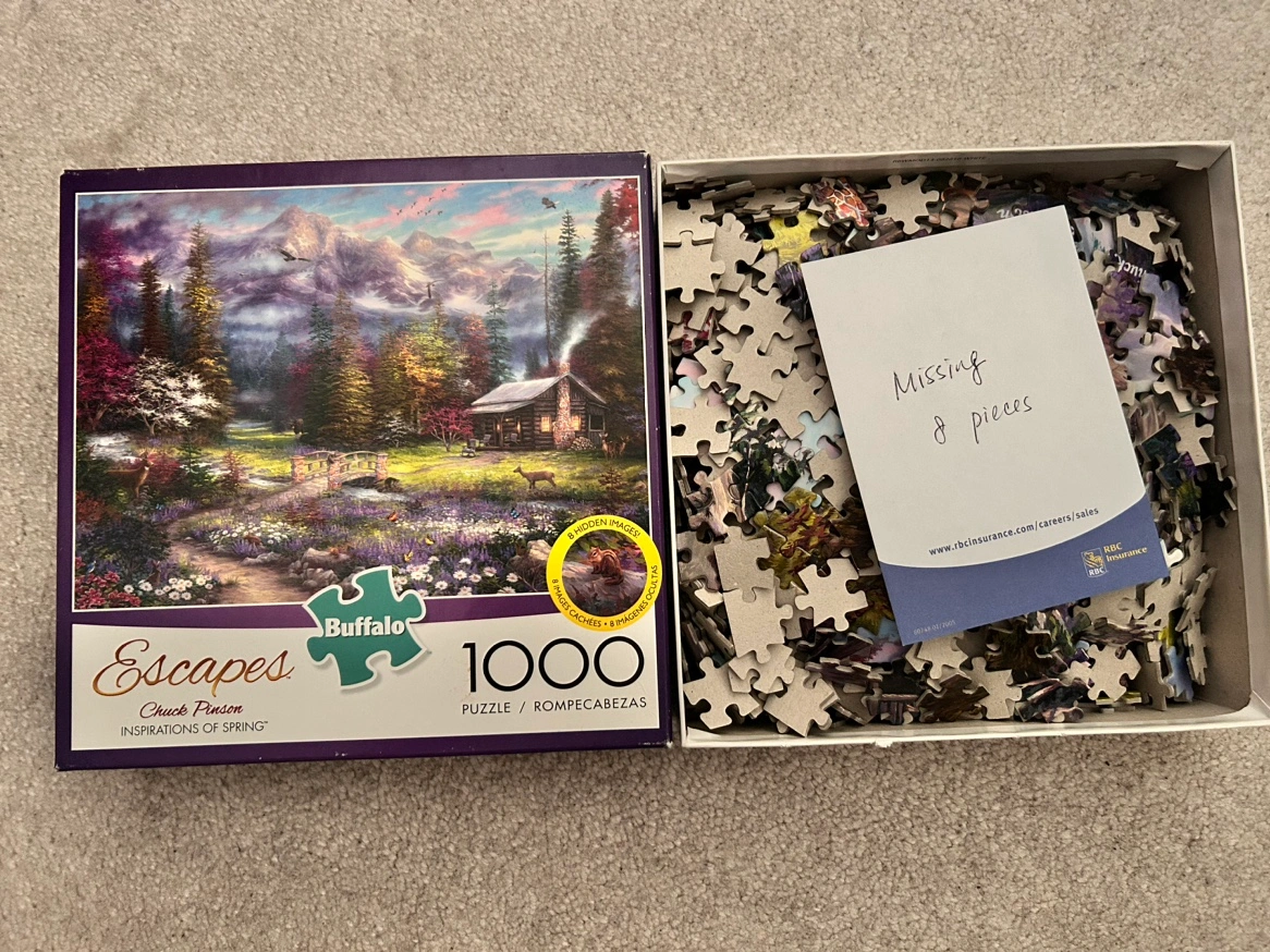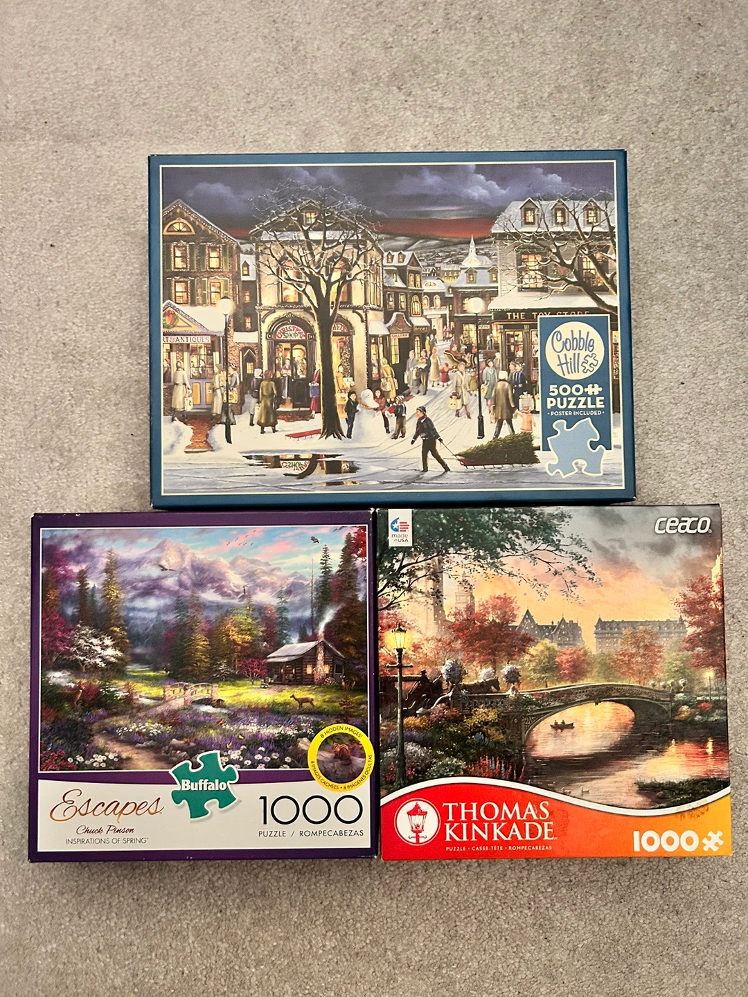 Thomas Kinkade 1000 piece, Cobble Hill 500+ piece and Buffalo Games 1000 piece. Each is missing a few pieces.